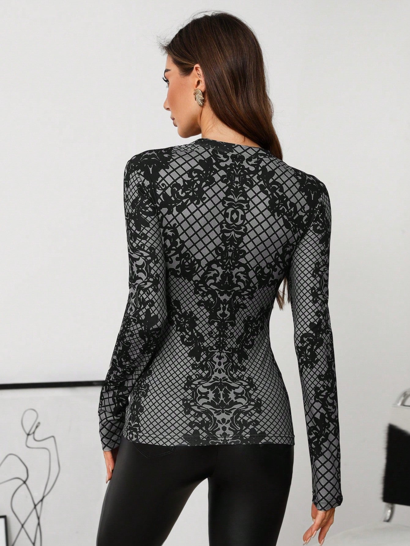 تي شيرت كم طويل ذو ياقة علوية كلاسيكية مناسب للسيدات بتصميم نحيف، بنقشة شبكية زهرية رجعية