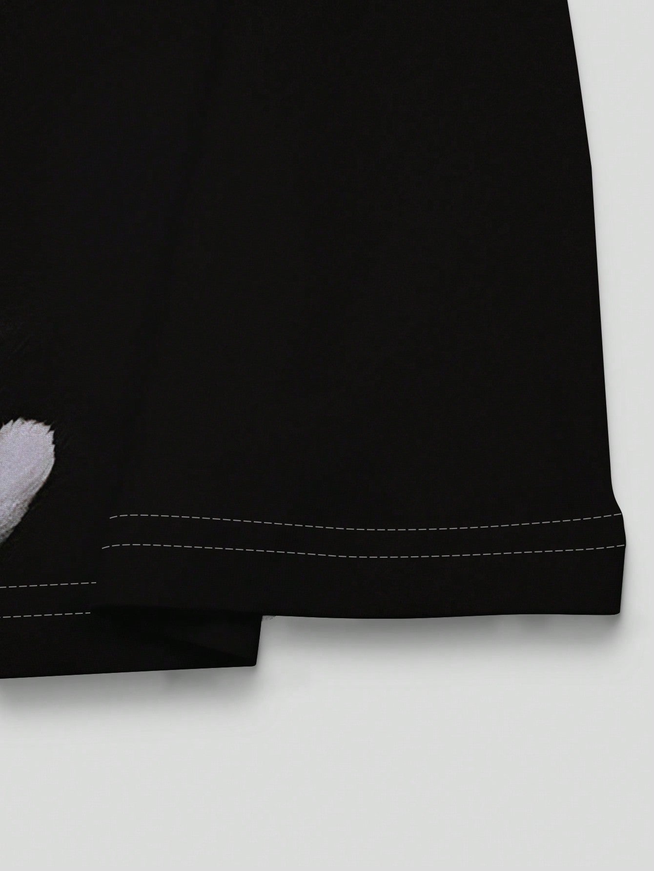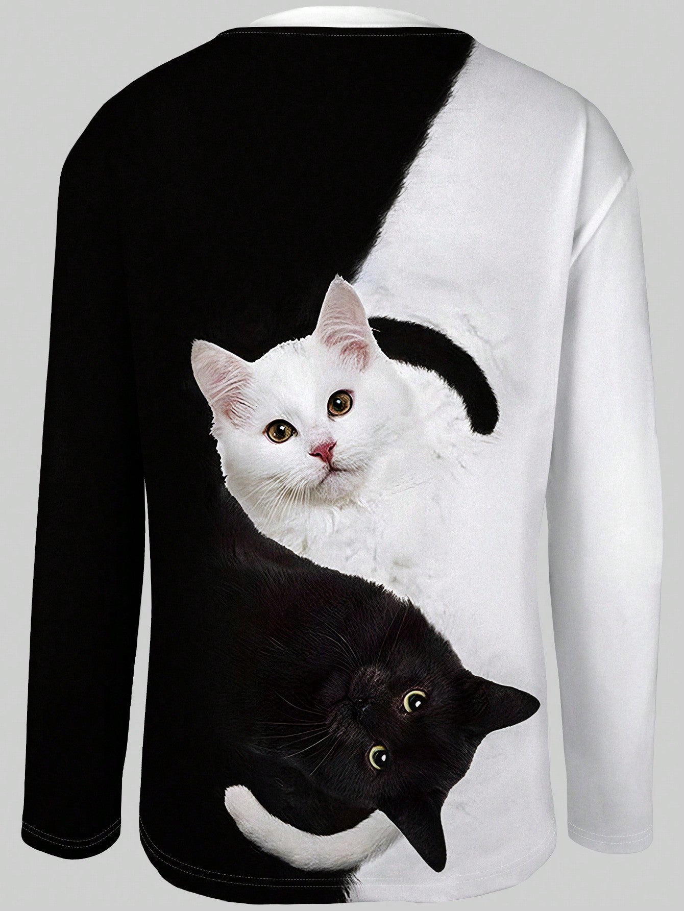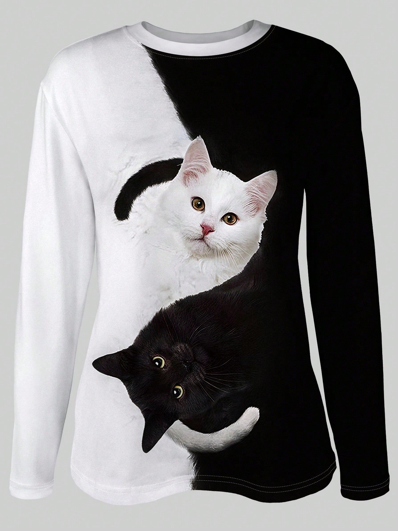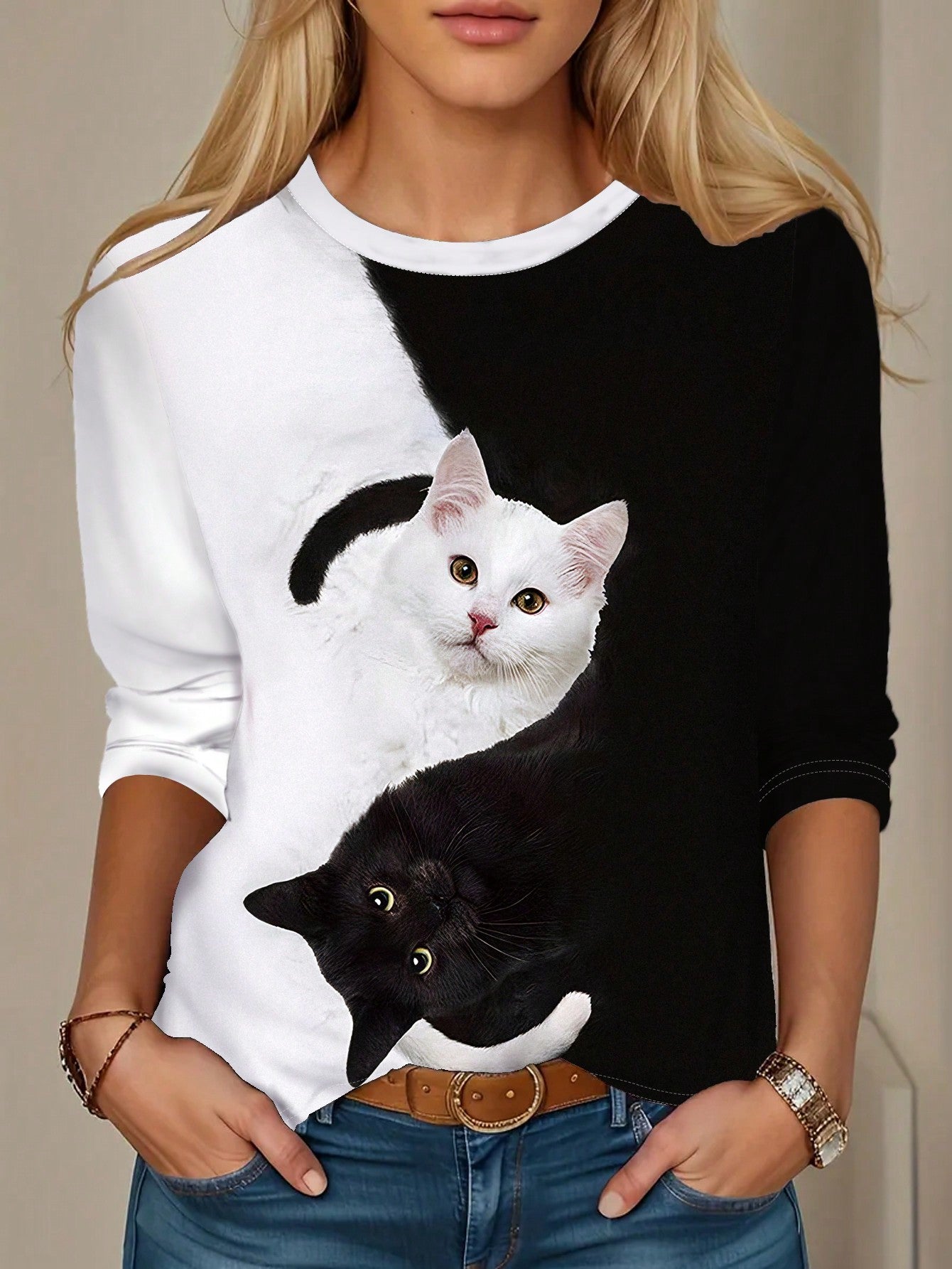 تي شيرت كم طويل نساء ربيعي صيفي عادي بياقة طاقم مطبوع بصورة قطة بألوان متباينة