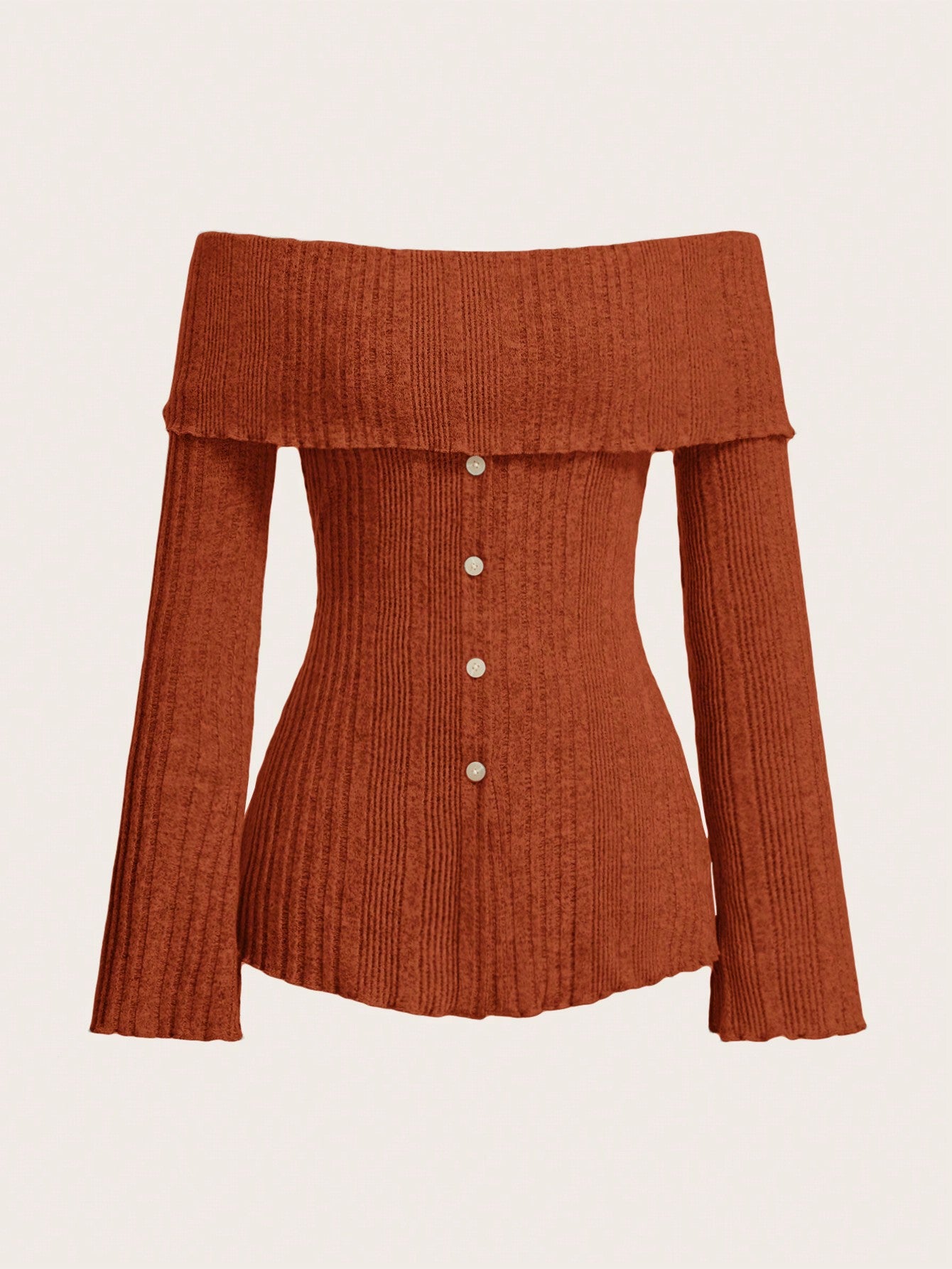 تي شيرت مكشوف الكتف أزرار أمامية باكمام مشقوق