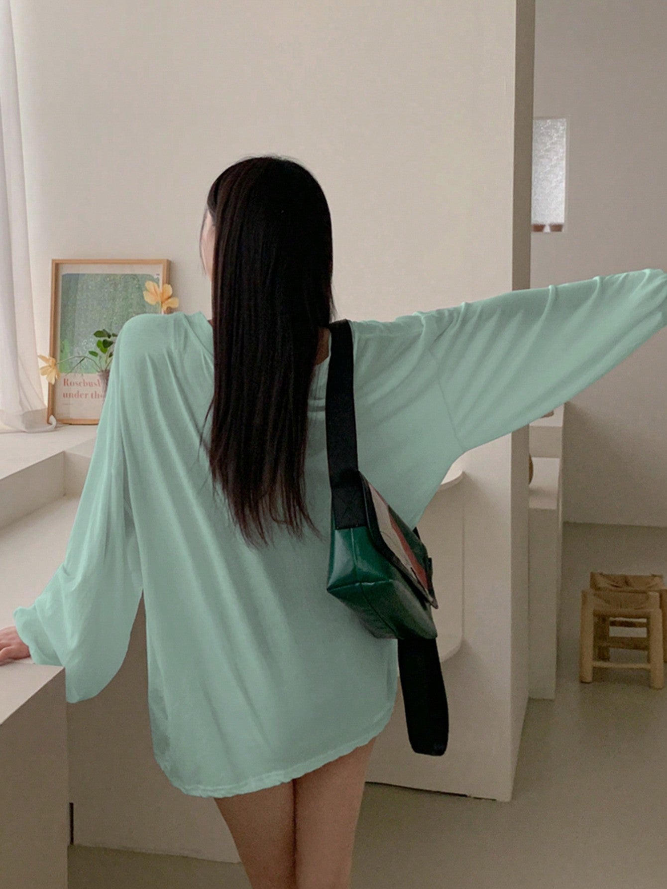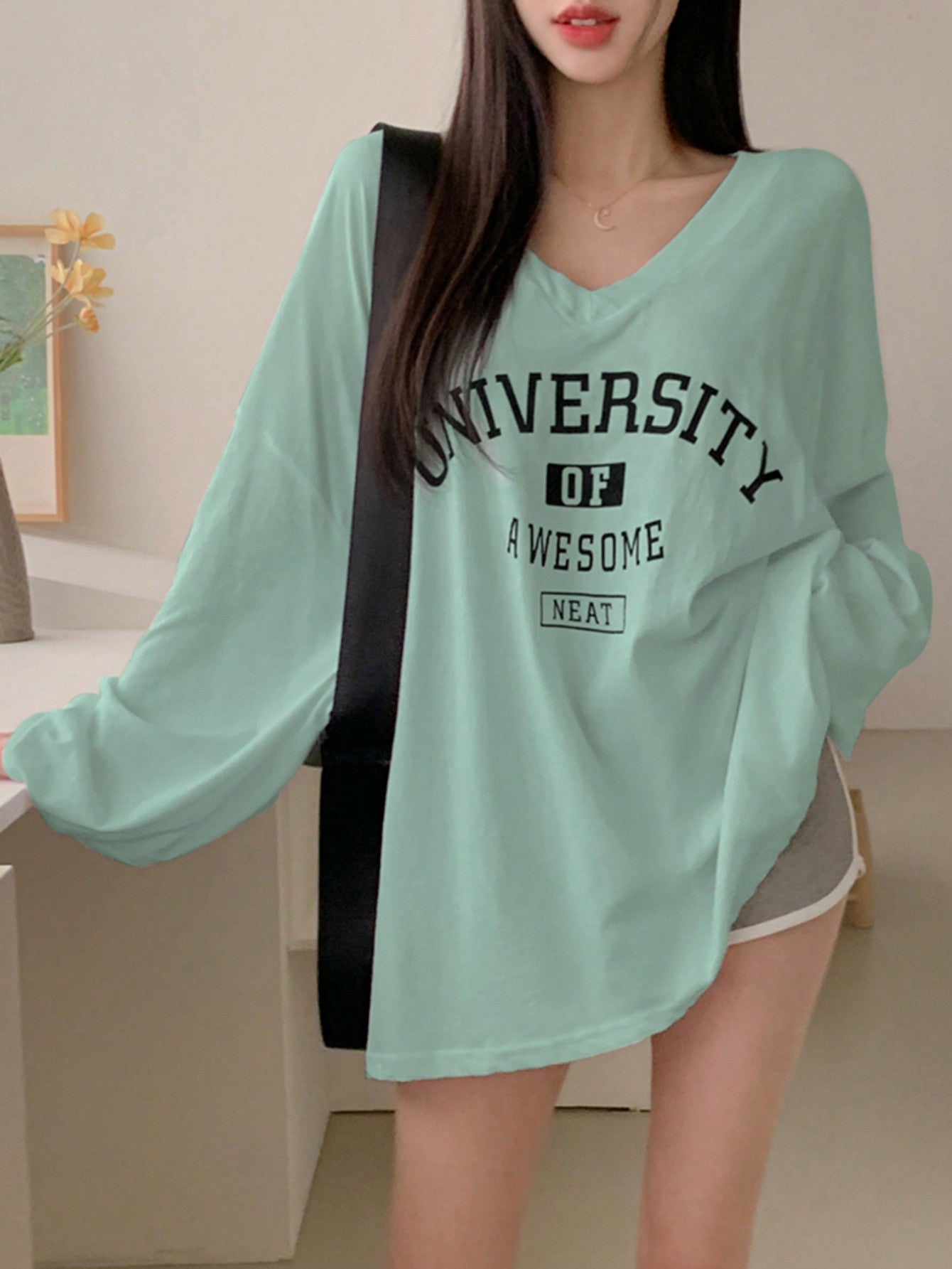 تي شيرت نسائي عادي بقبة V وأكمام طويلة بطبعة حرفية - ربيع / صيف