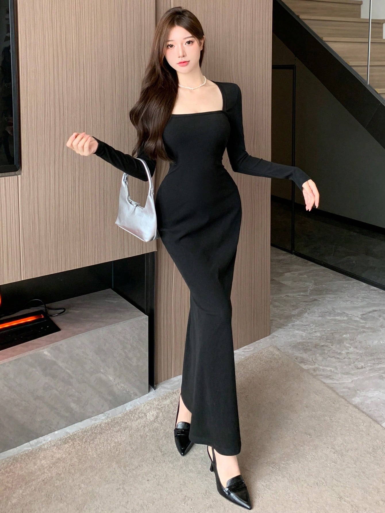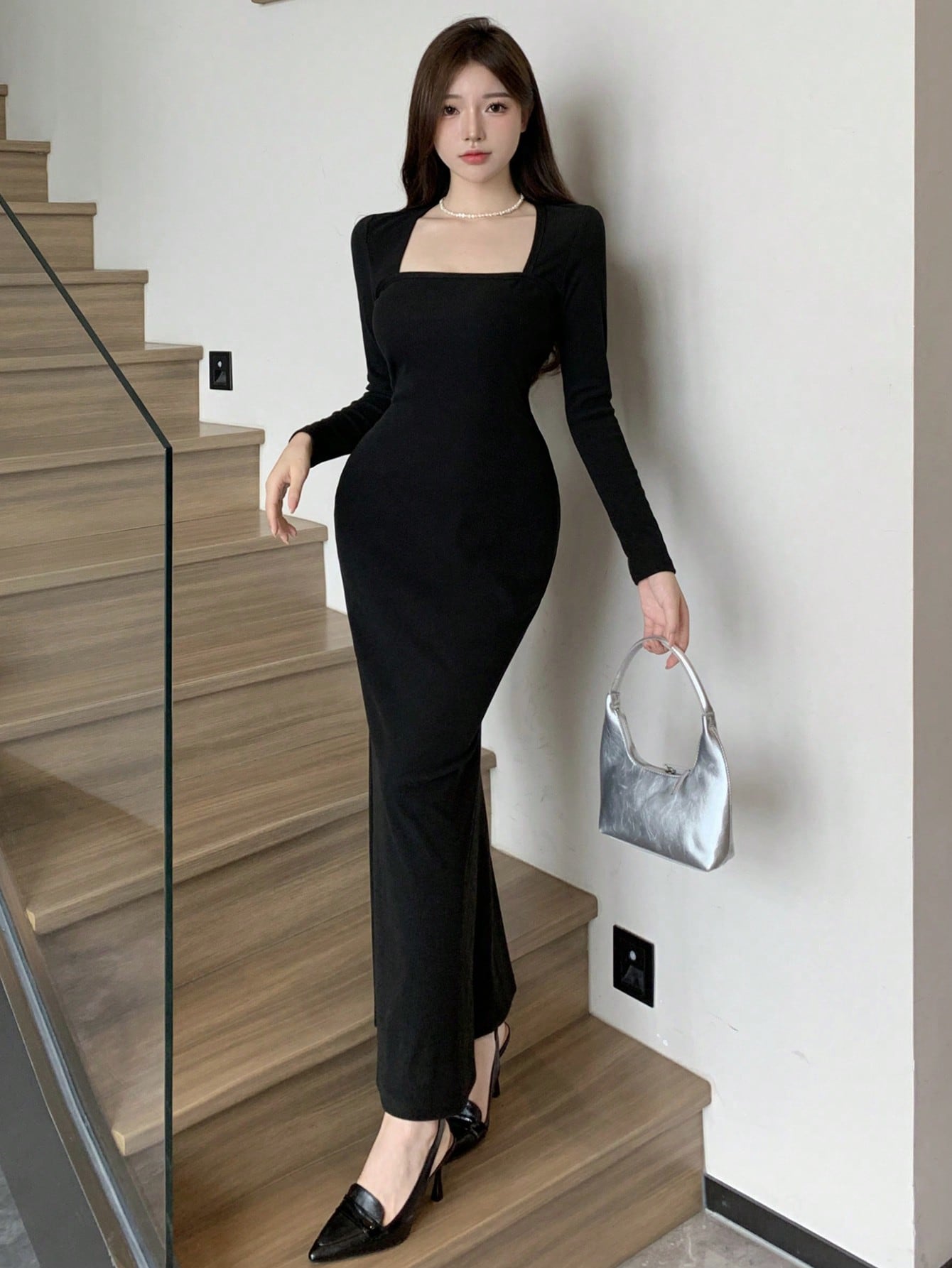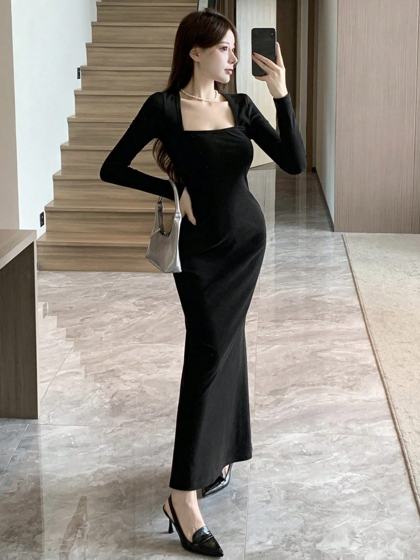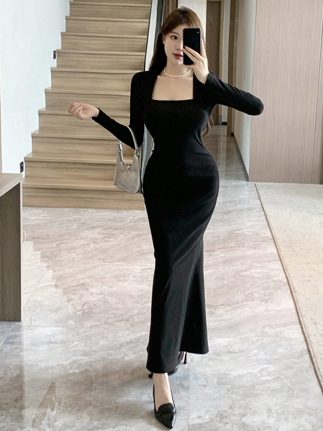ثوب ضيق ميدي بقصّة تايت مع رقبة مربعة وذيل سمكة