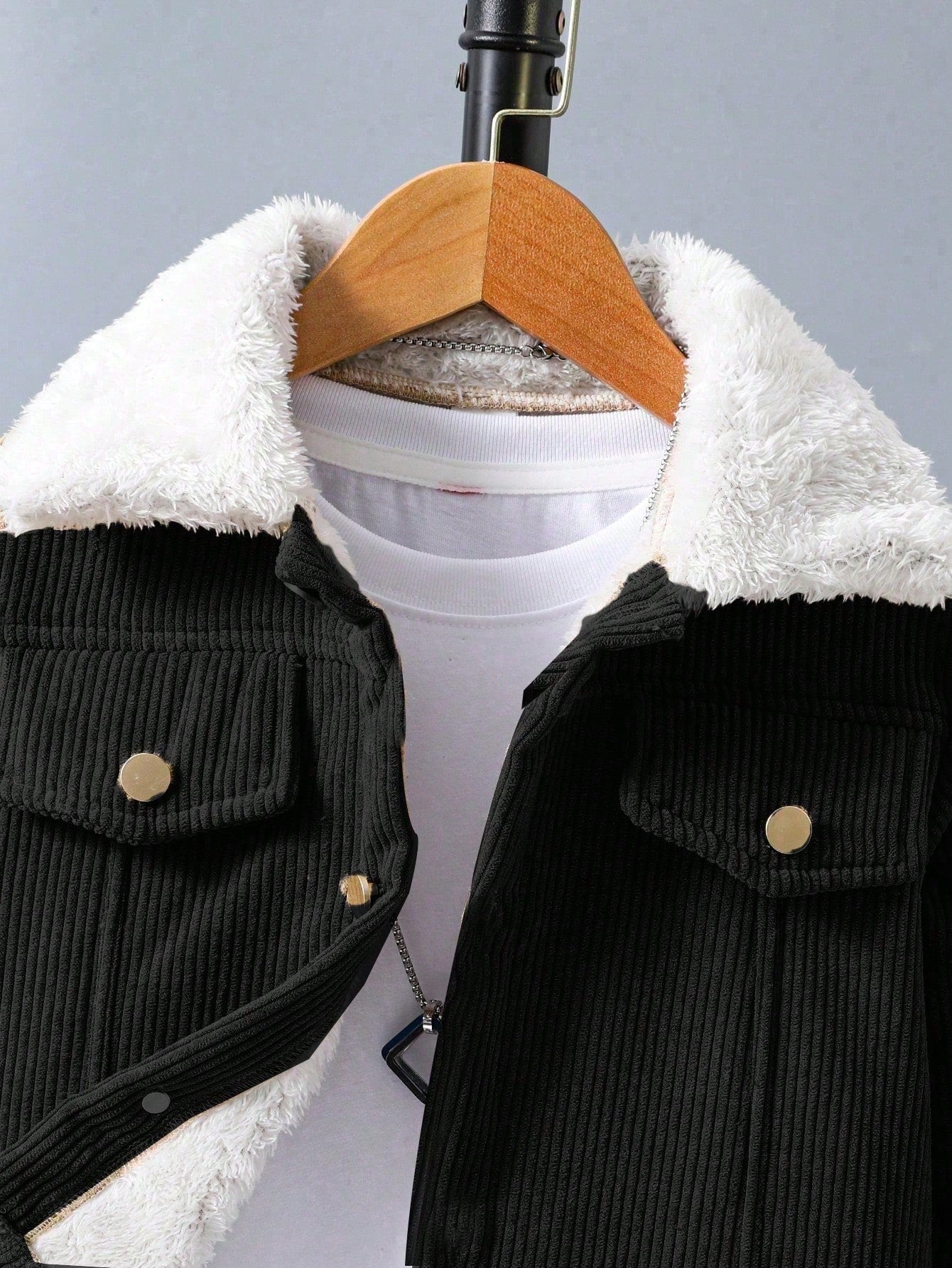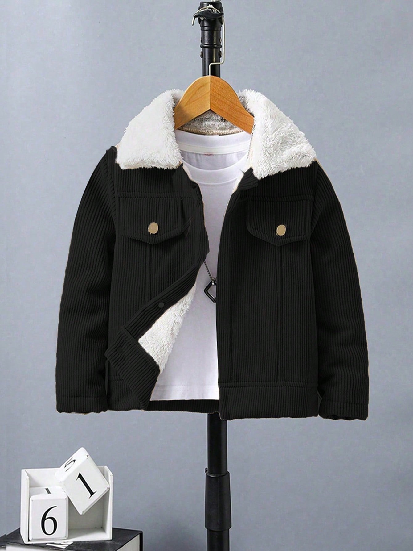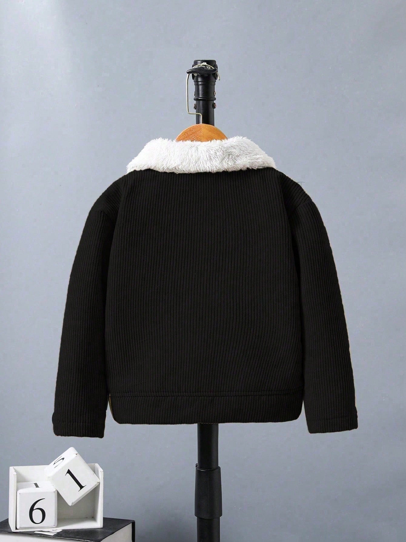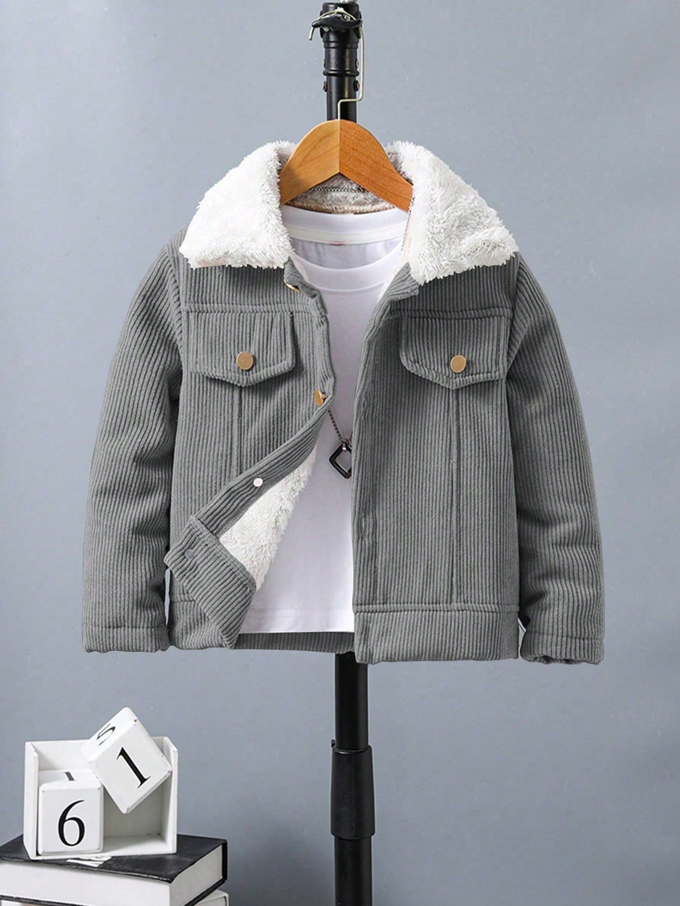 جاكيت بسيطة كم طويل طوق فرو صبي، لبس يومي عادي