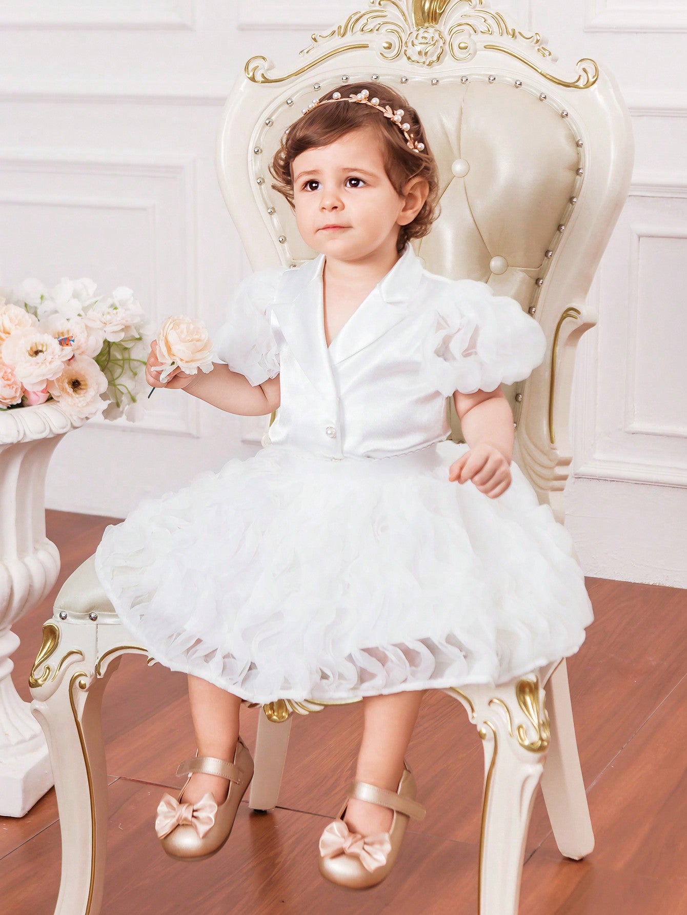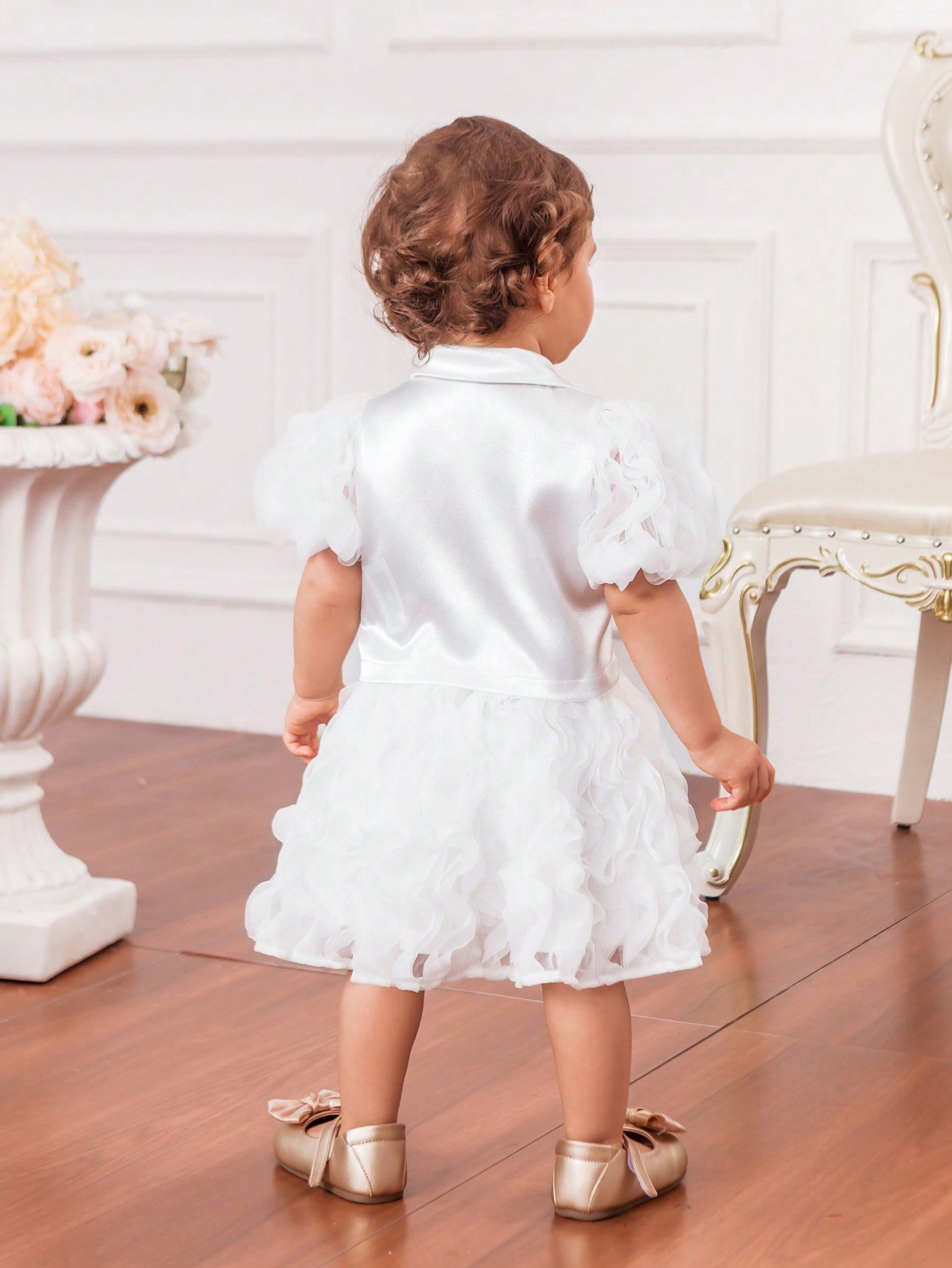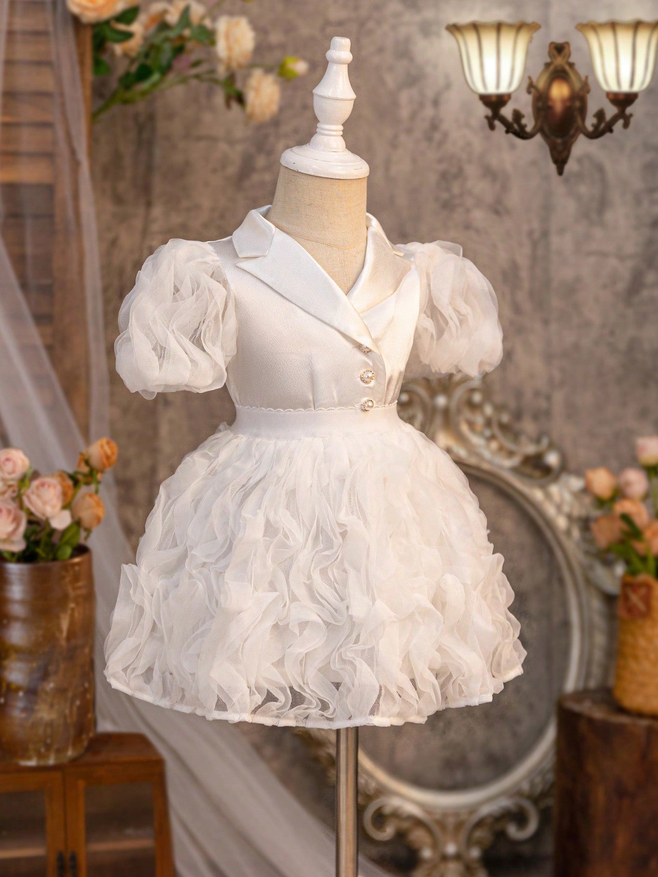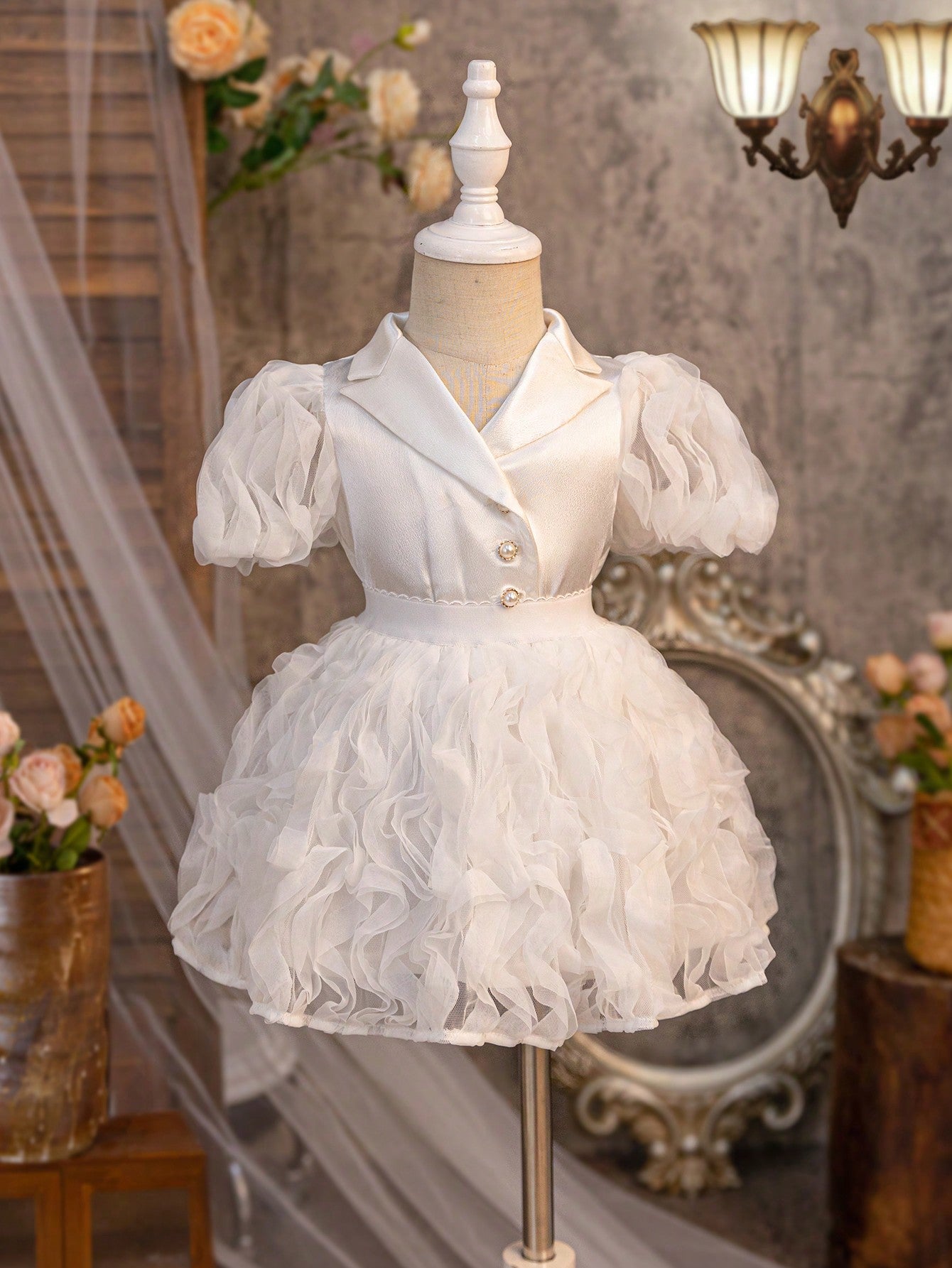 جاكيت جديد لرضيعات الأنثى بأكمام من الدانتيل الحريري والباتشورك، مع أزرار لؤلؤية وتنورة من الشبكة المجعدة لفصل الصيف