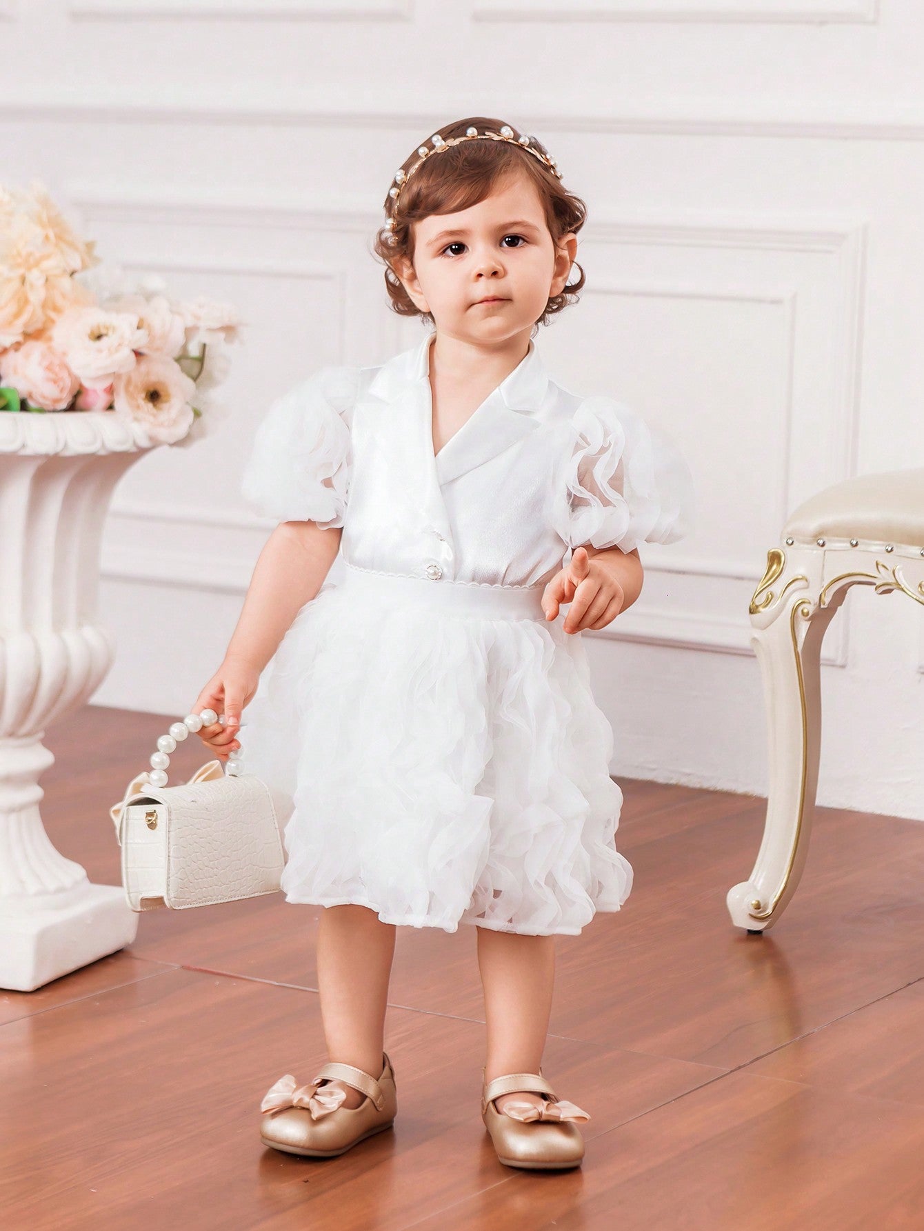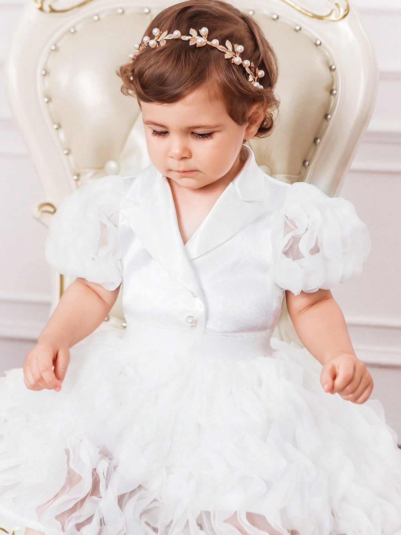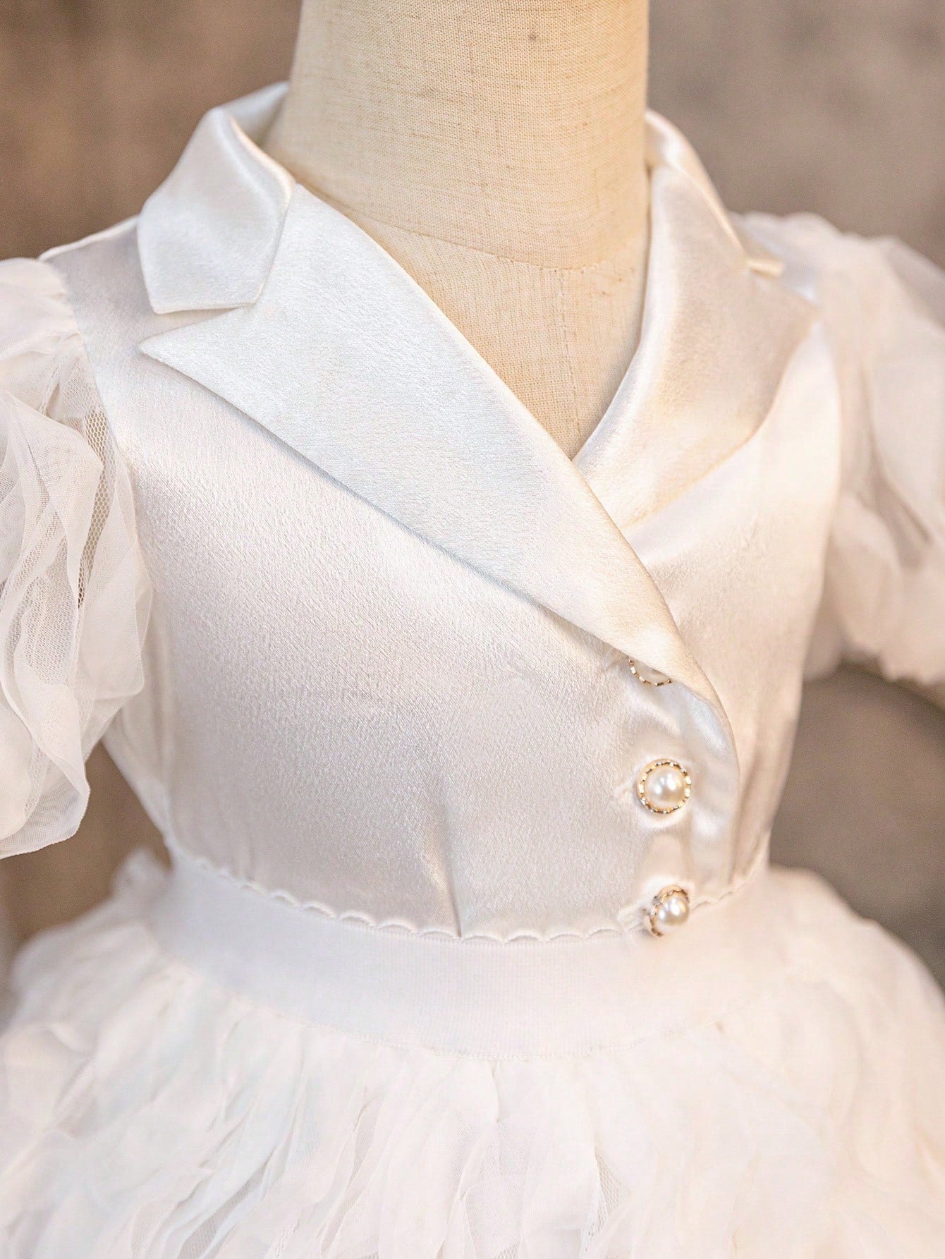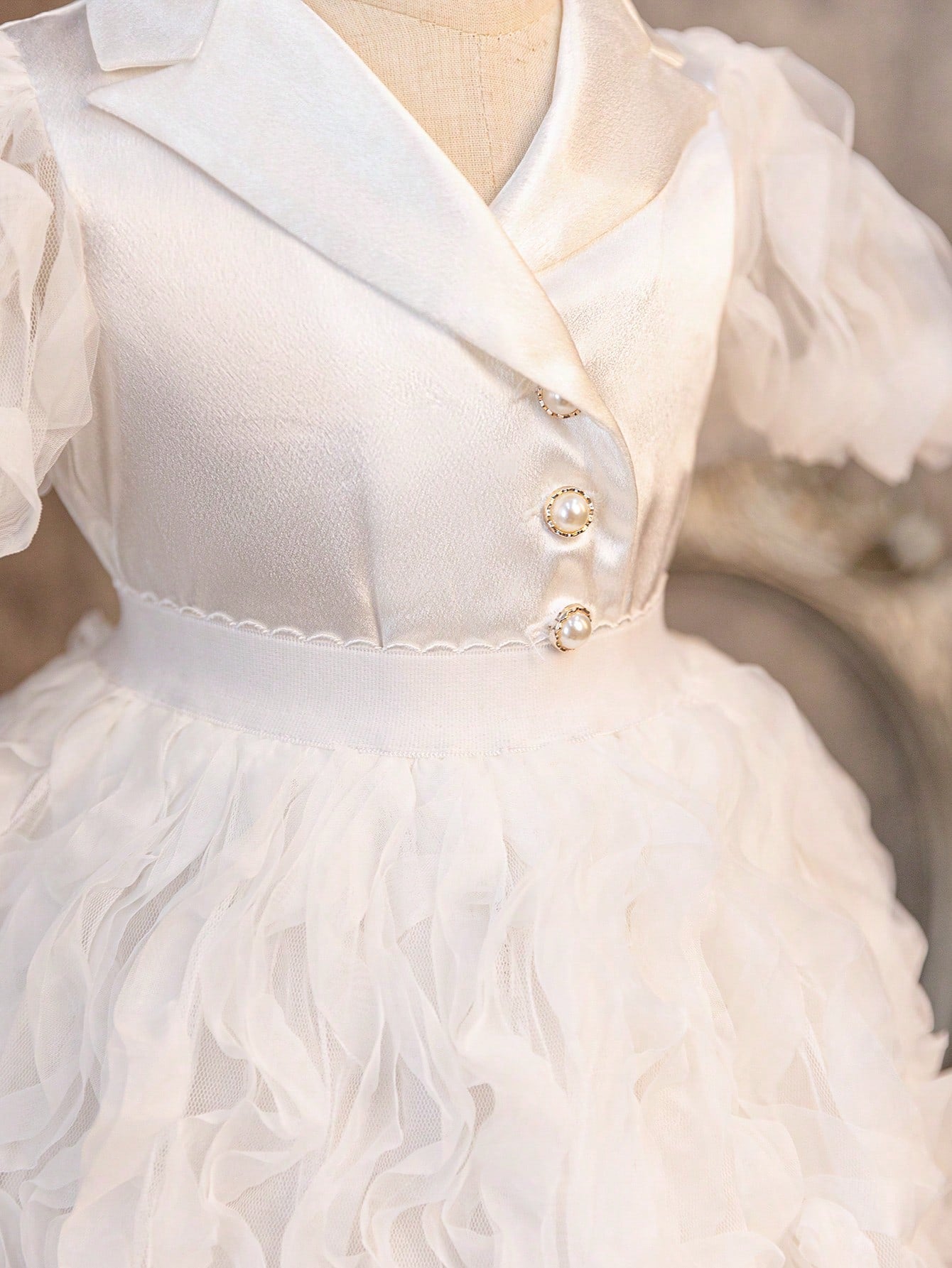 جاكيت جديد لرضيعات الأنثى بأكمام من الدانتيل الحريري والباتشورك، مع أزرار لؤلؤية وتنورة من الشبكة المجعدة لفصل الصيف