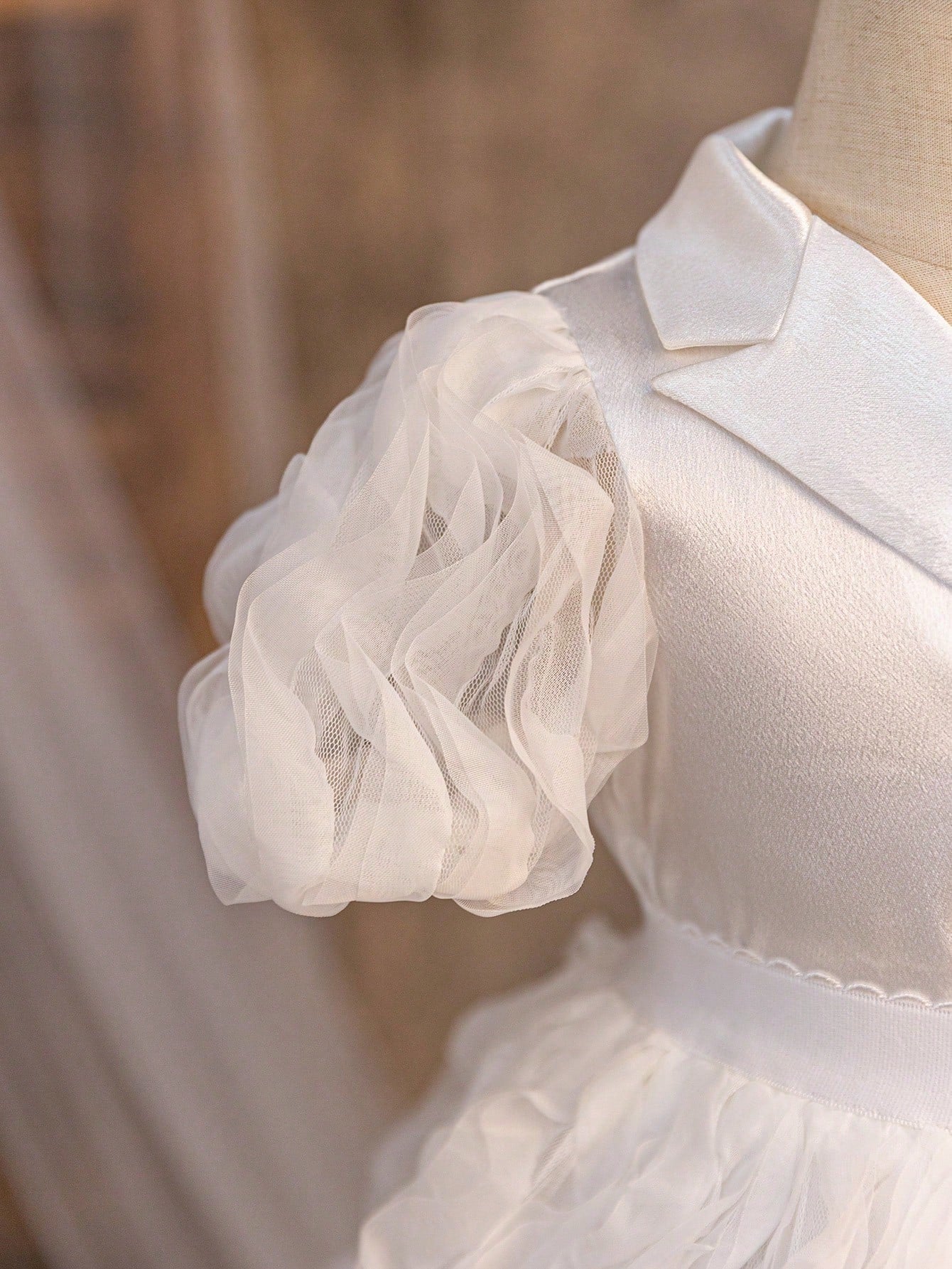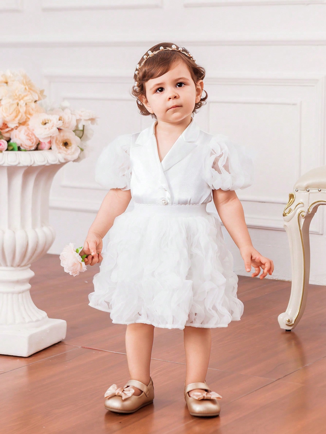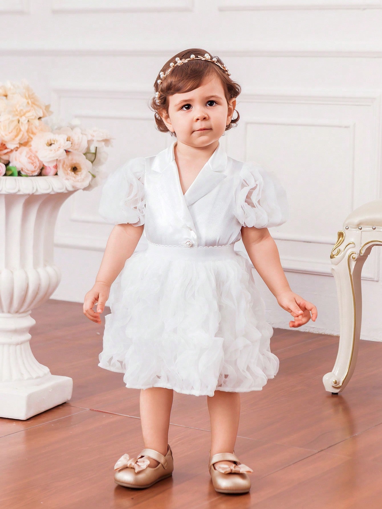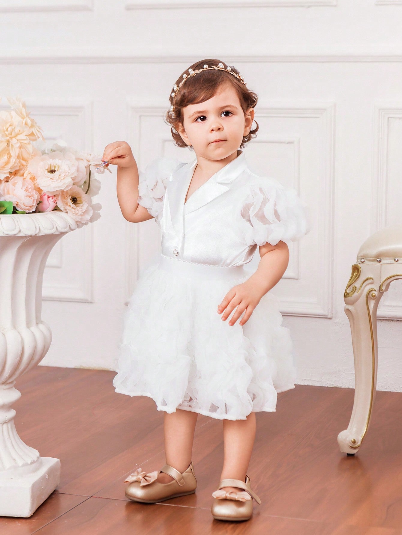 جاكيت جديد لرضيعات الأنثى بأكمام من الدانتيل الحريري والباتشورك، مع أزرار لؤلؤية وتنورة من الشبكة المجعدة لفصل الصيف