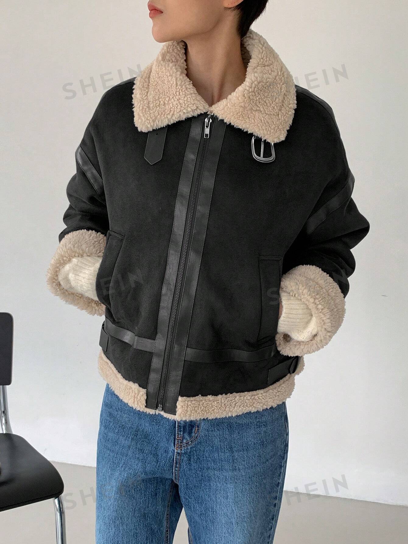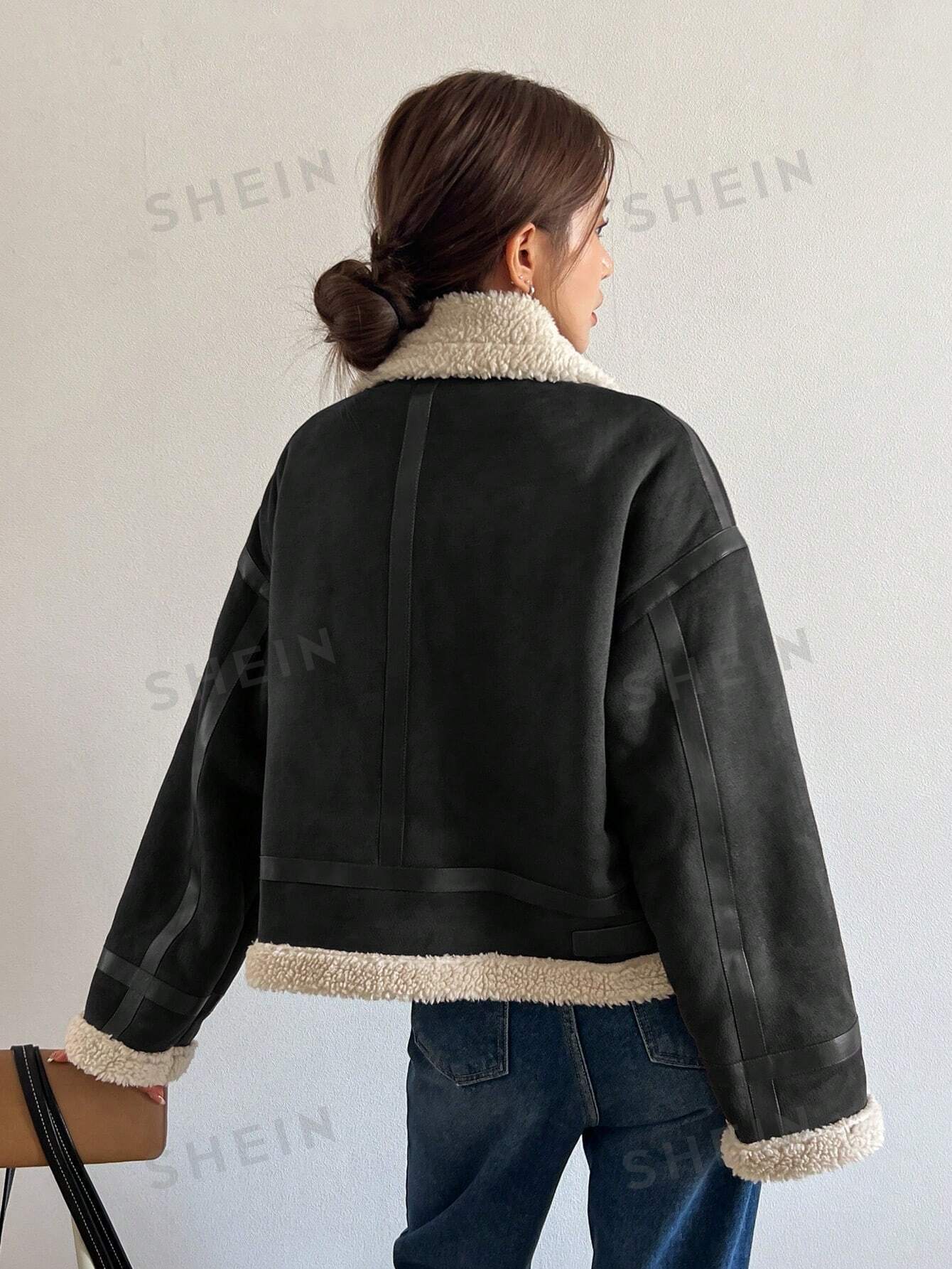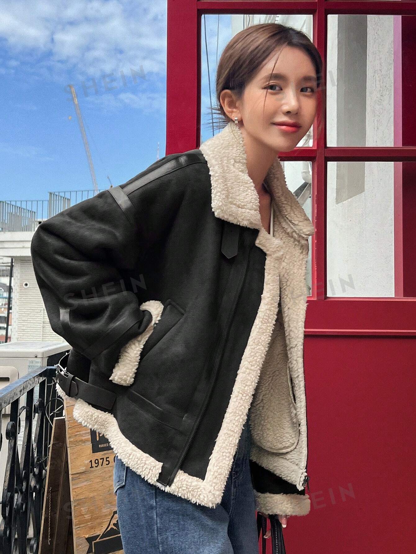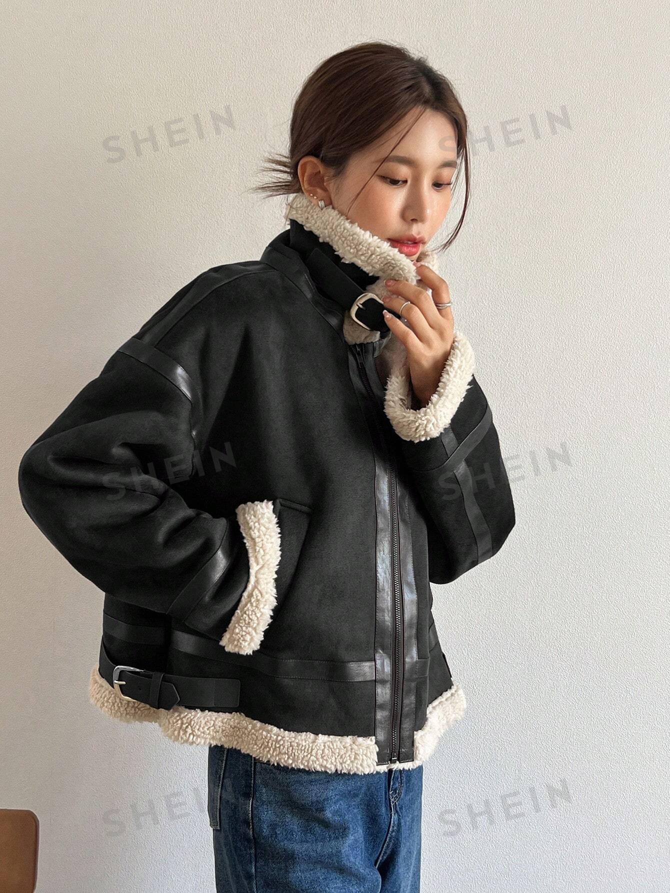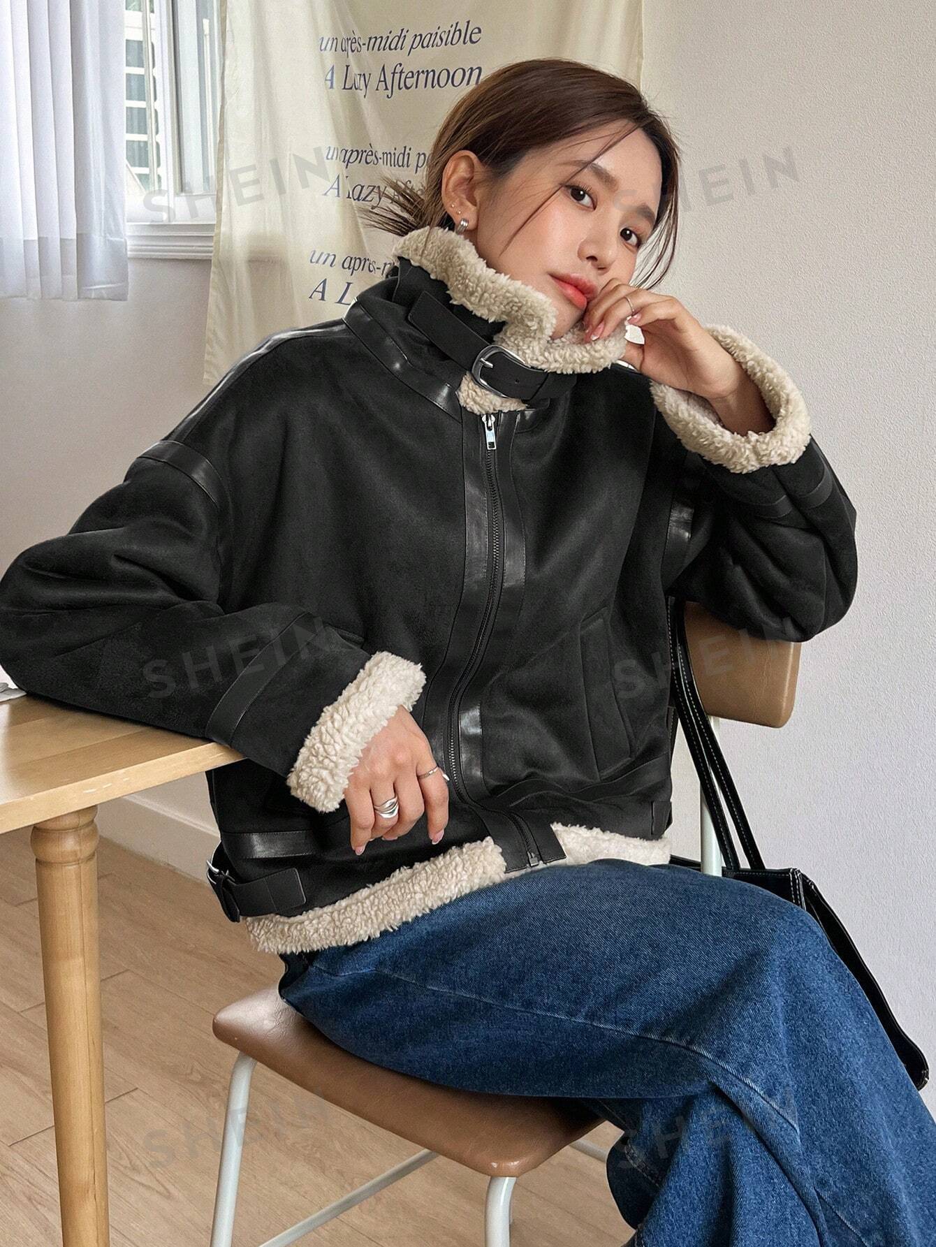 جاكيت جلدي بو للكتف المنخفض مبطّن بداخله بالفرو