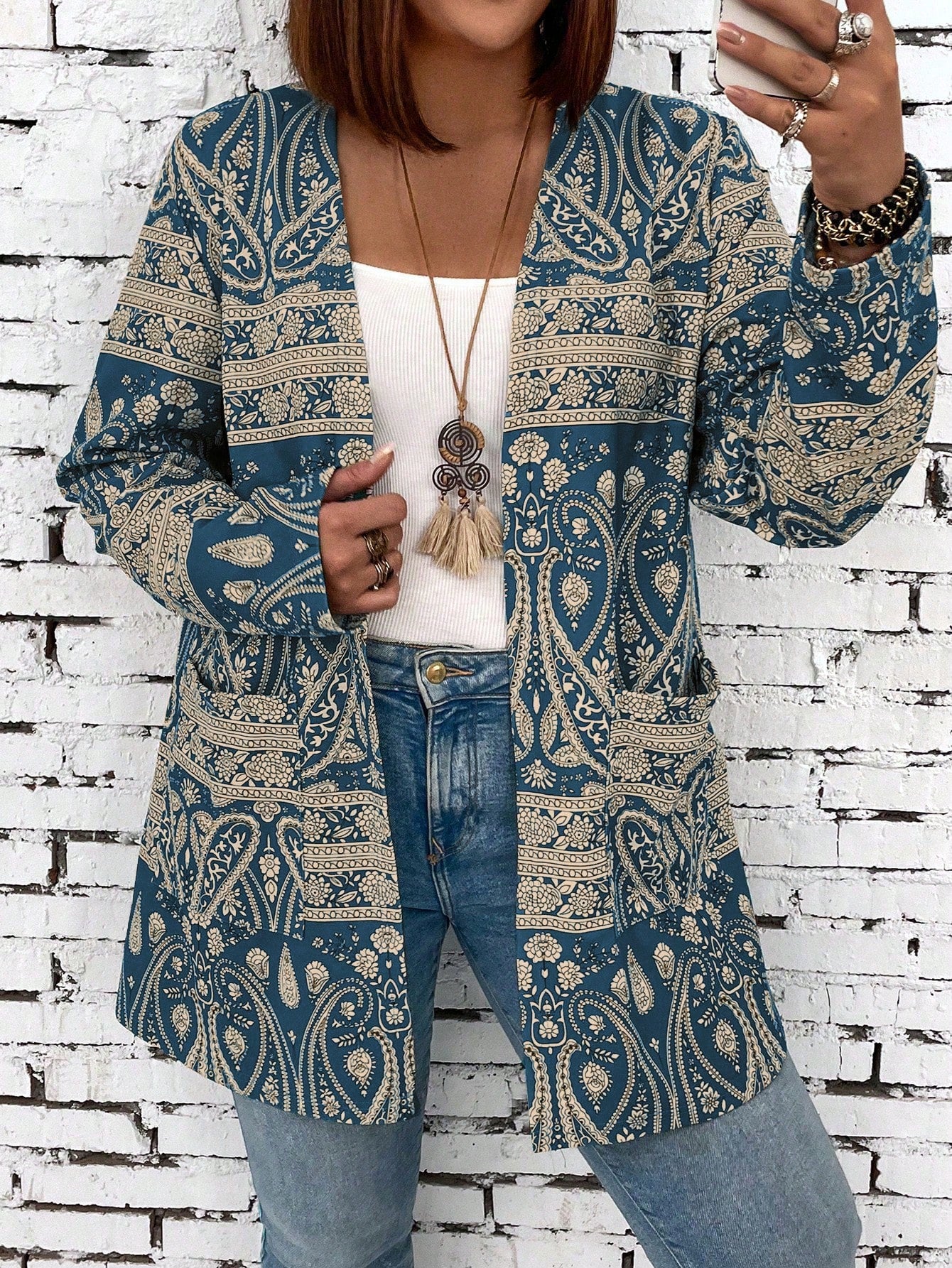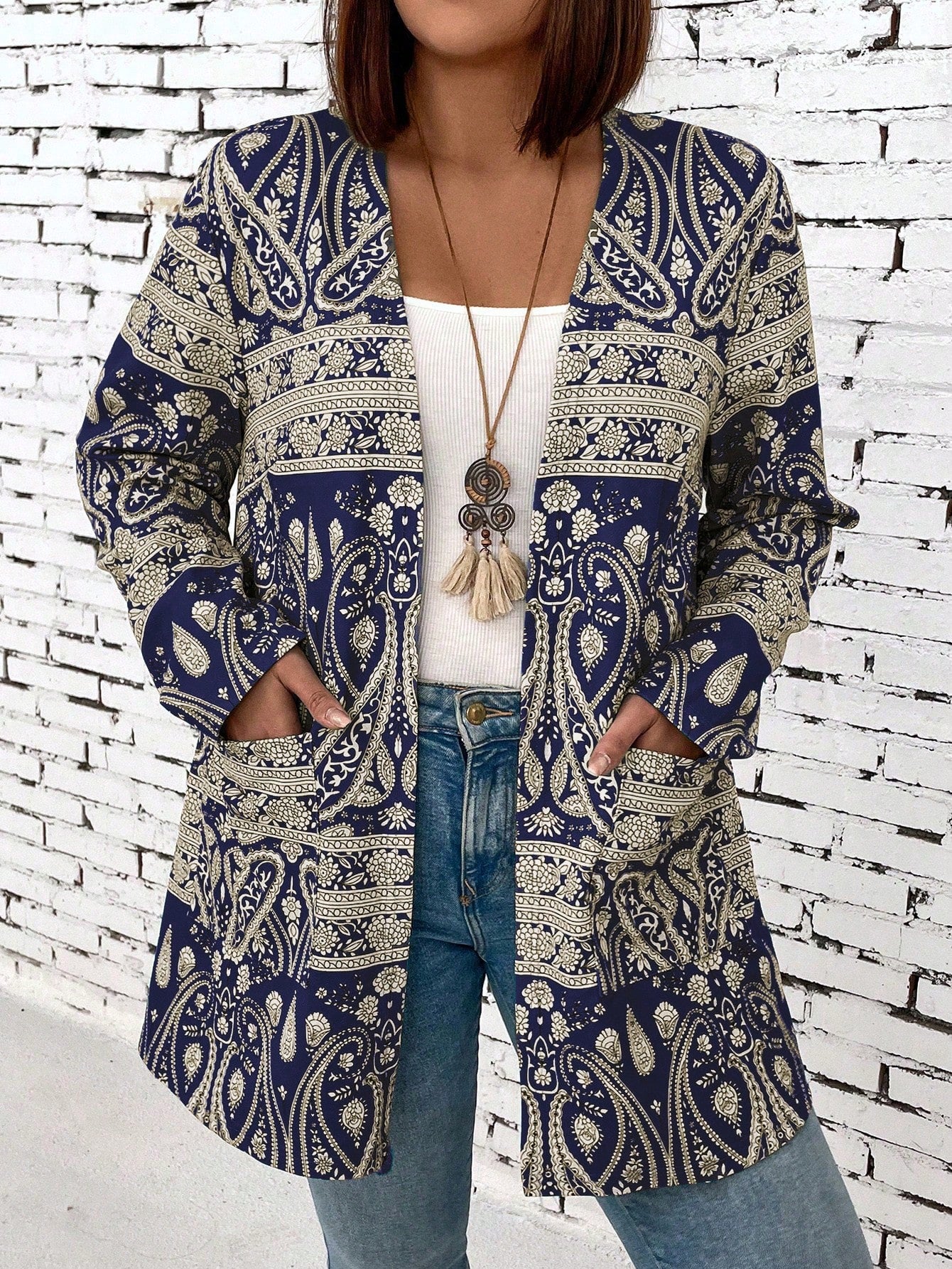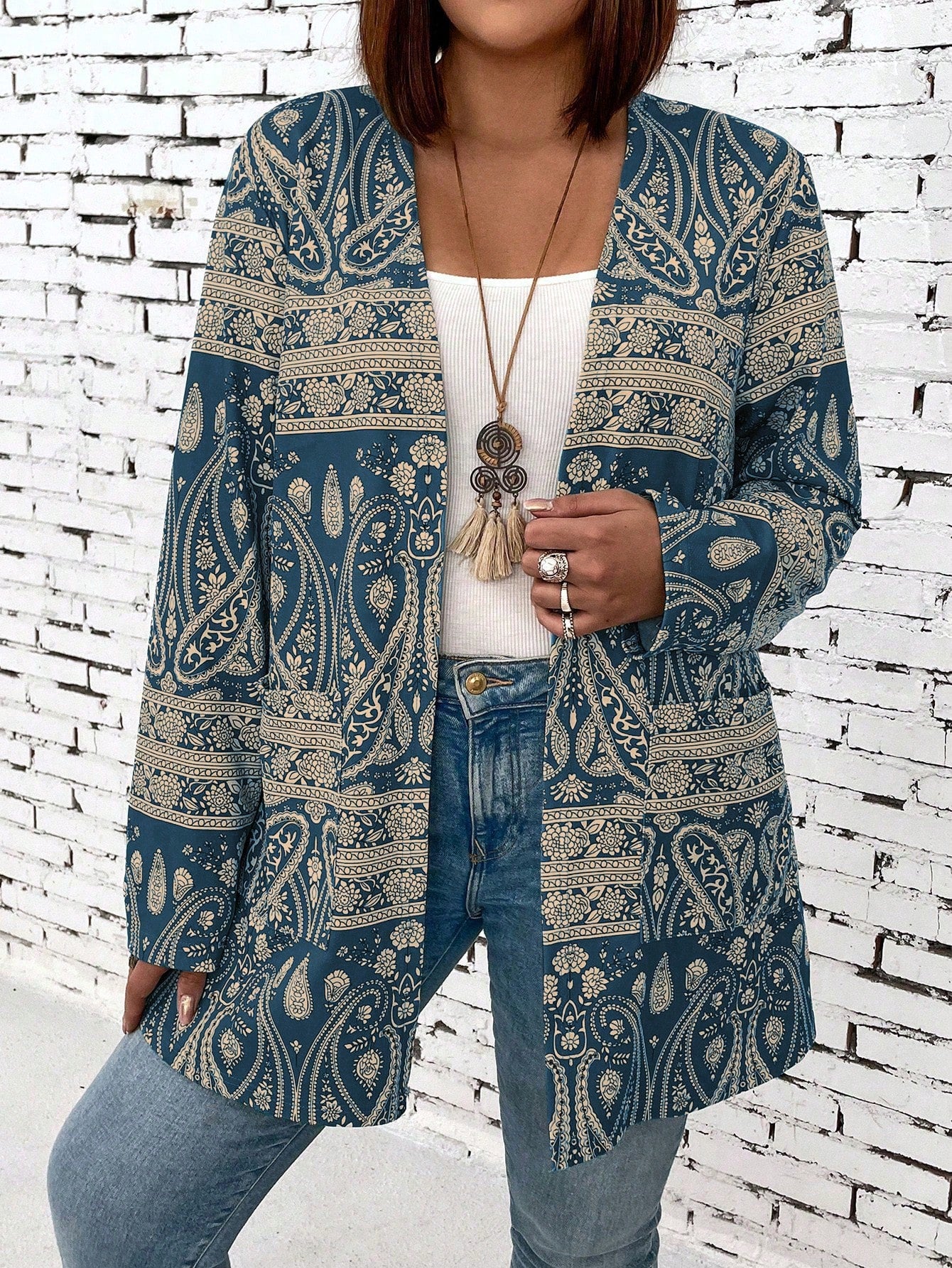 جاكيت نسائية بطباعة بيزلي ومقاس زائد مفتوحة من الأمام