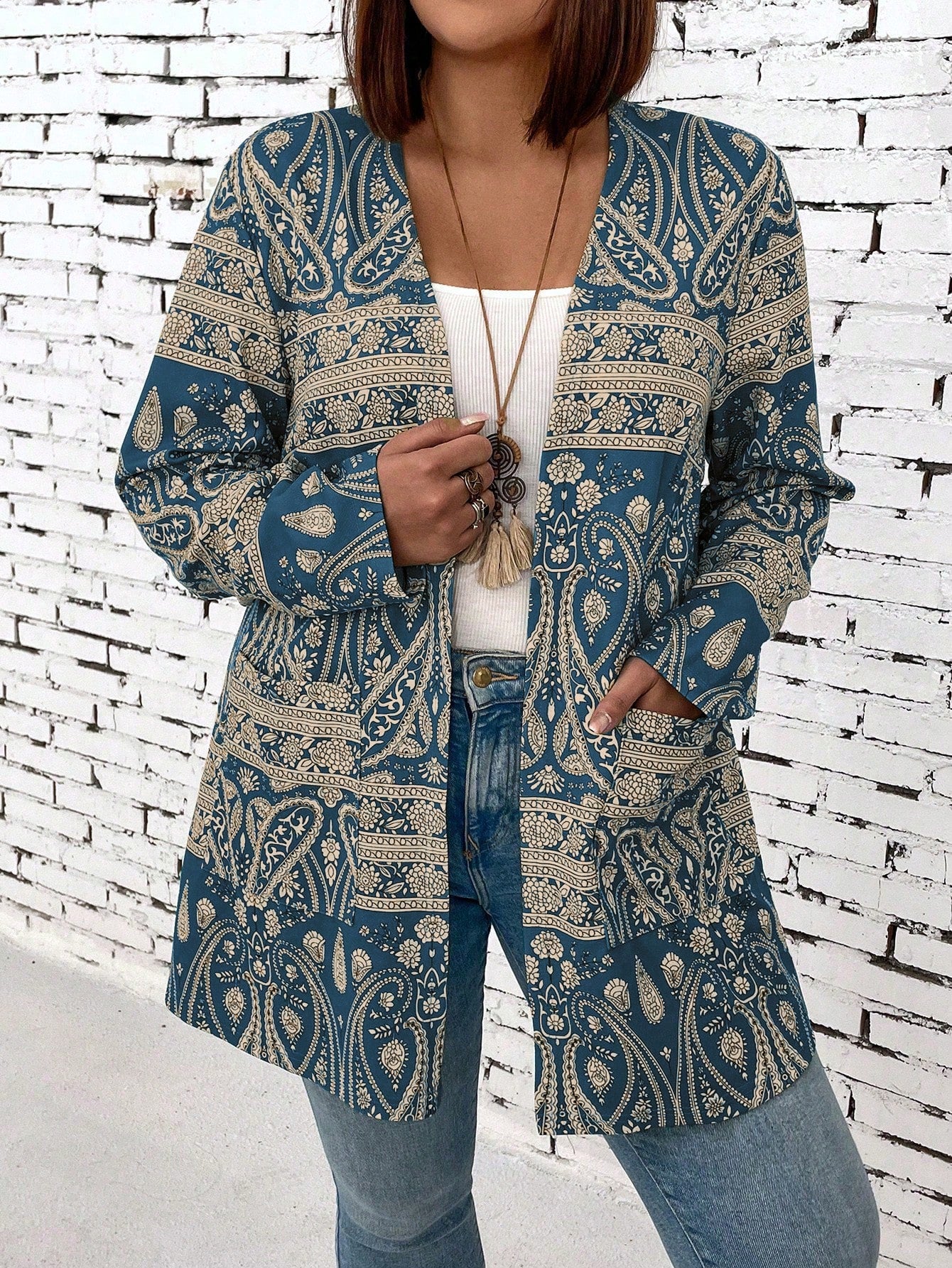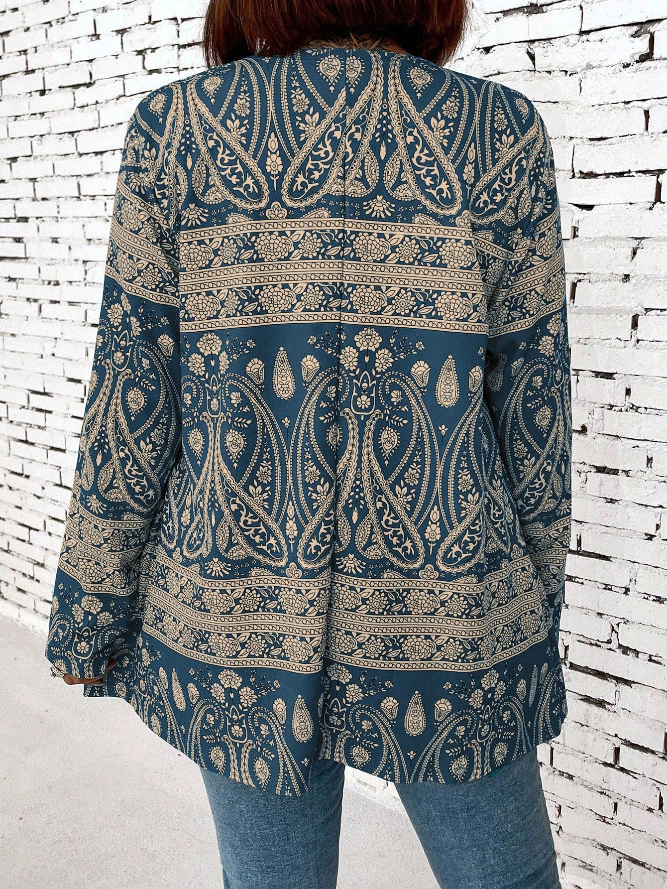 جاكيت نسائية بطباعة بيزلي ومقاس زائد مفتوحة من الأمام