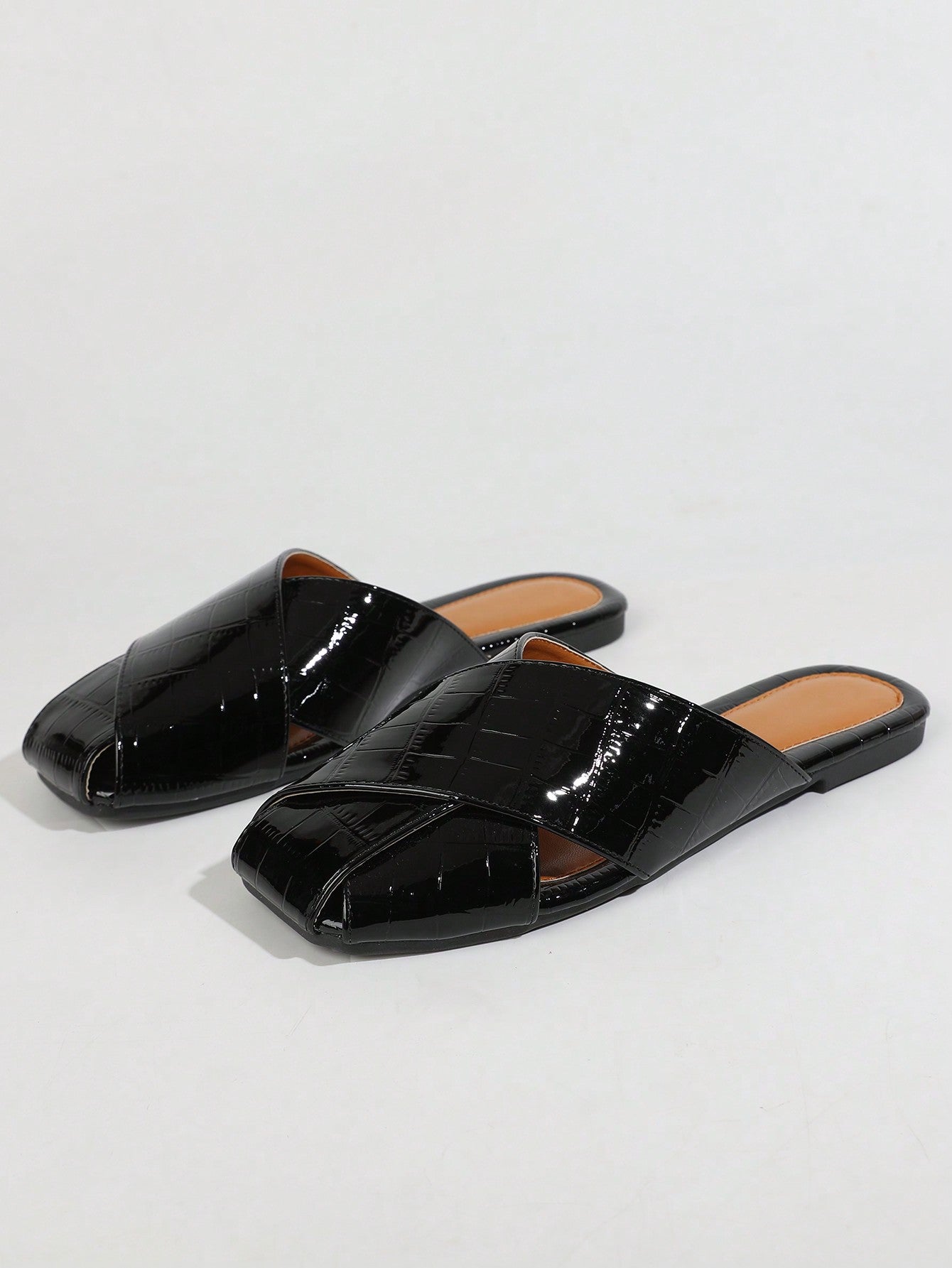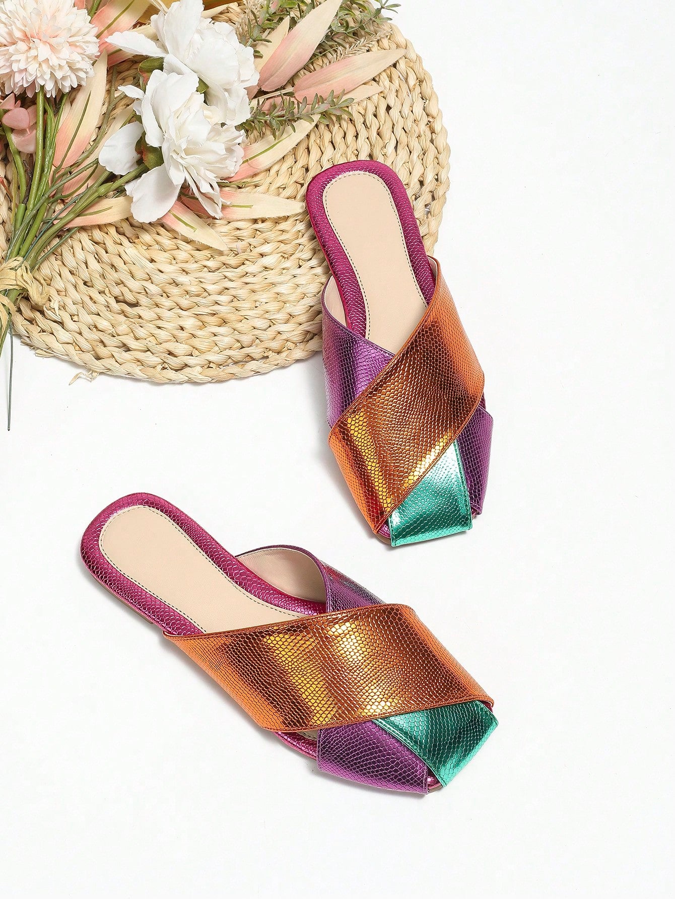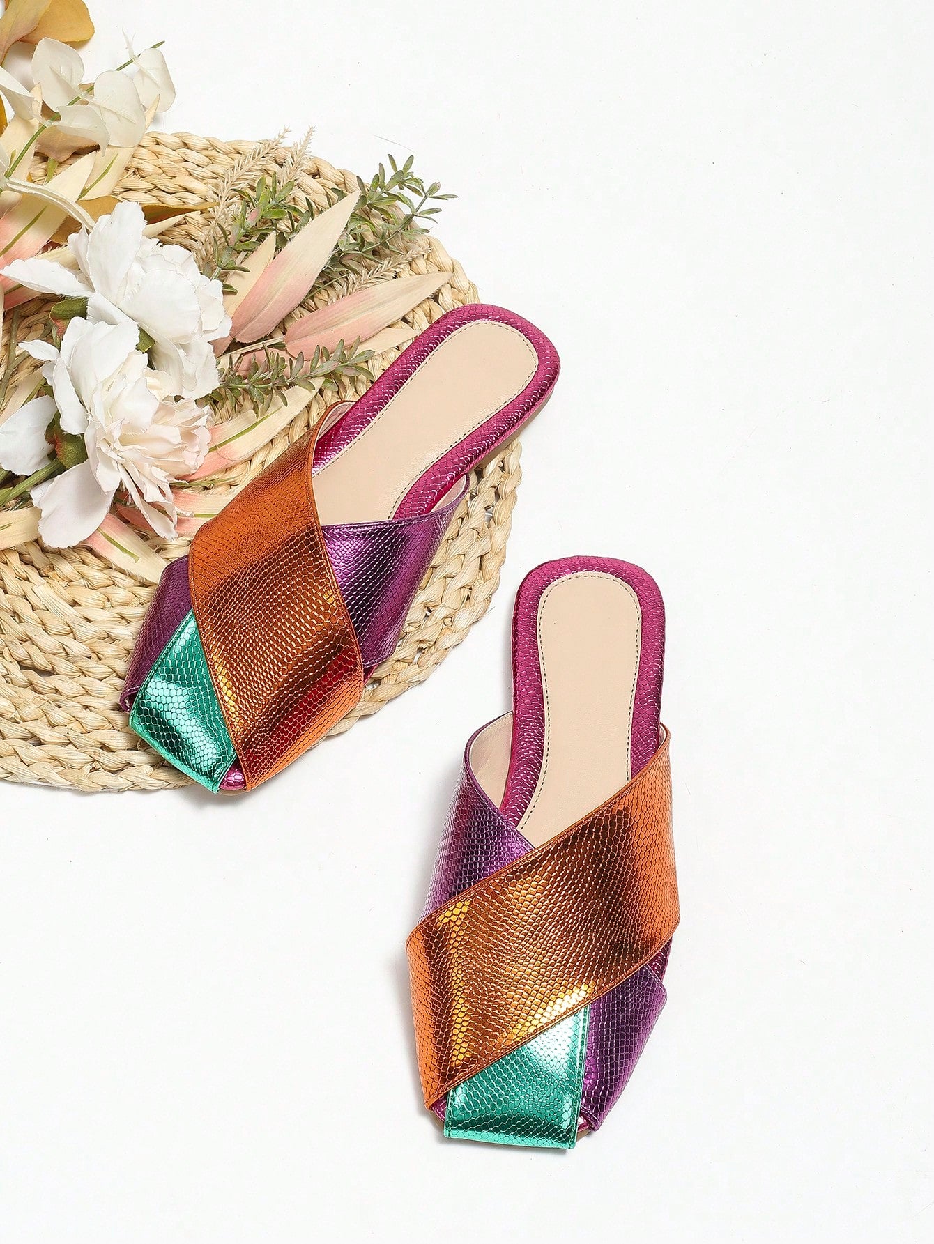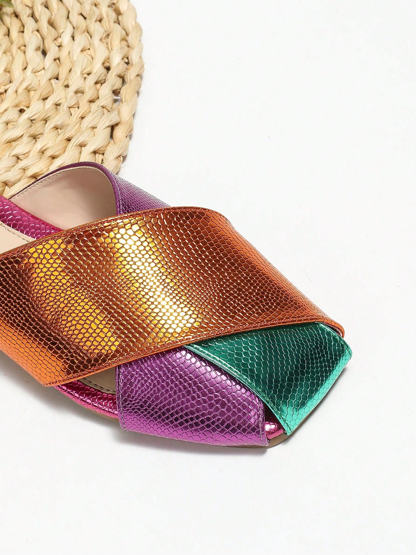 جبان حذاء منبسط مل للنساء , ألوان متباينة بتطريز جلود الثعبان الاصطناعي باصابع قدم مربع حذاء مسطح