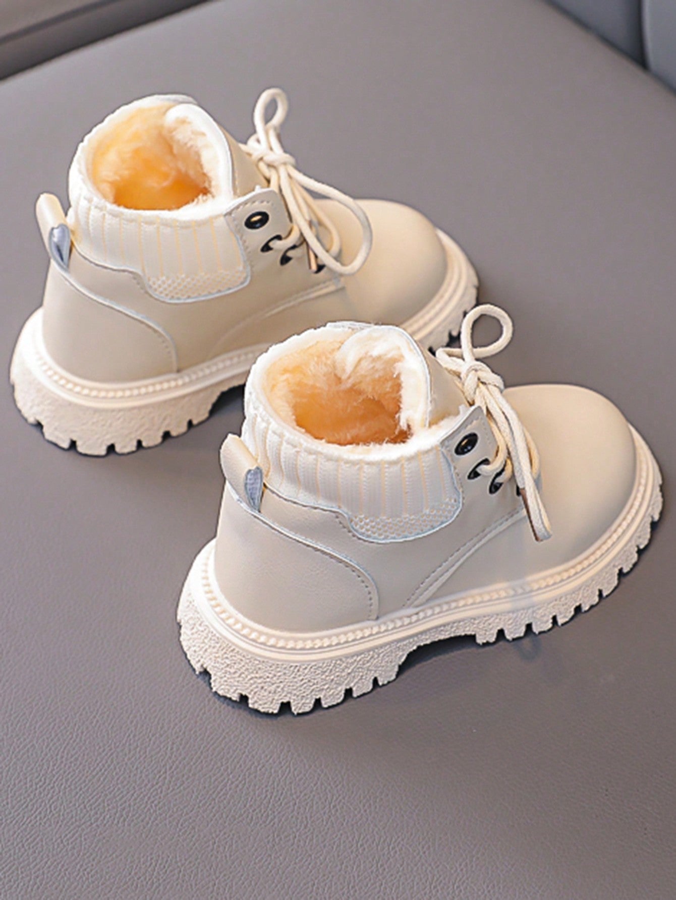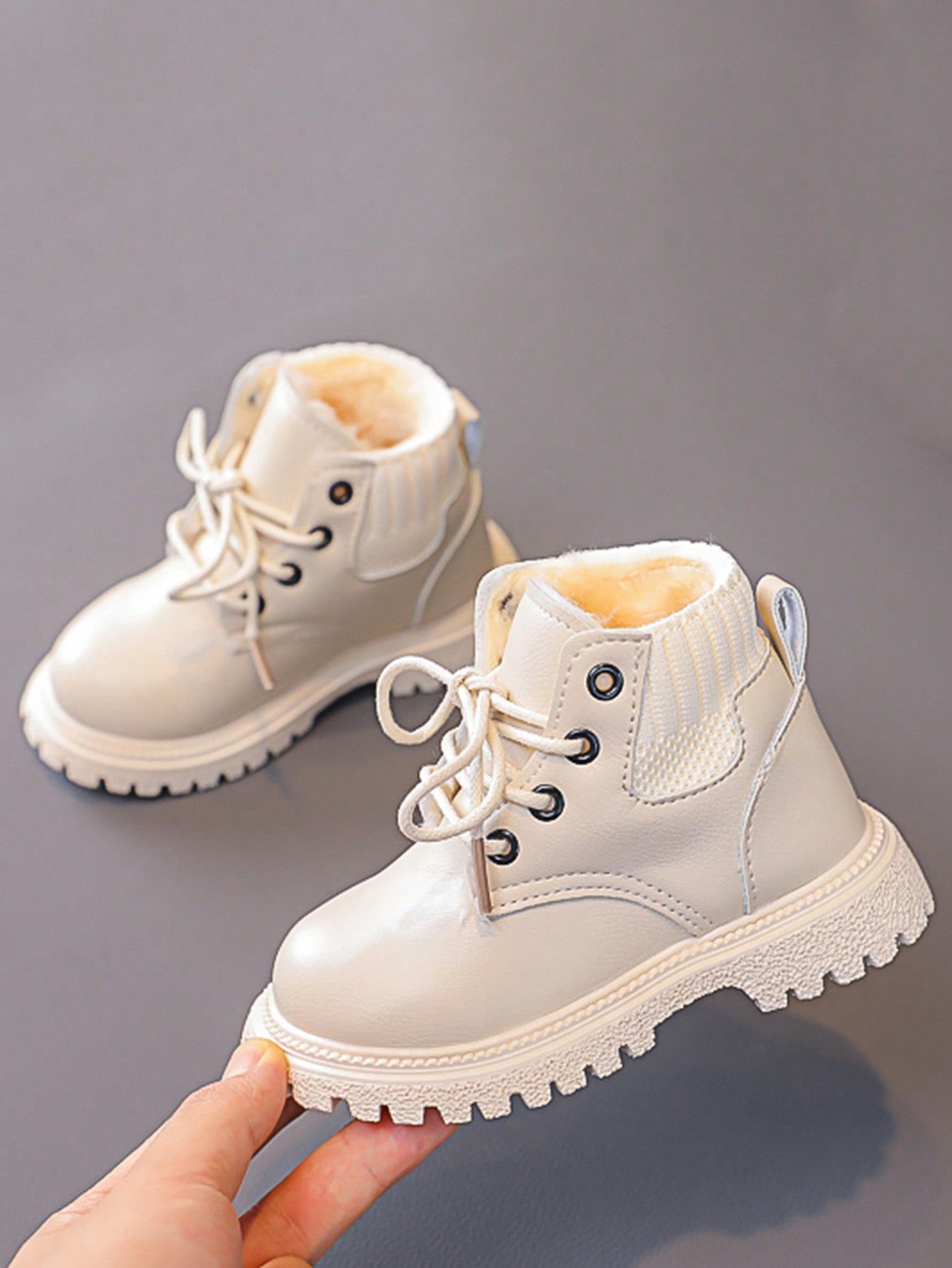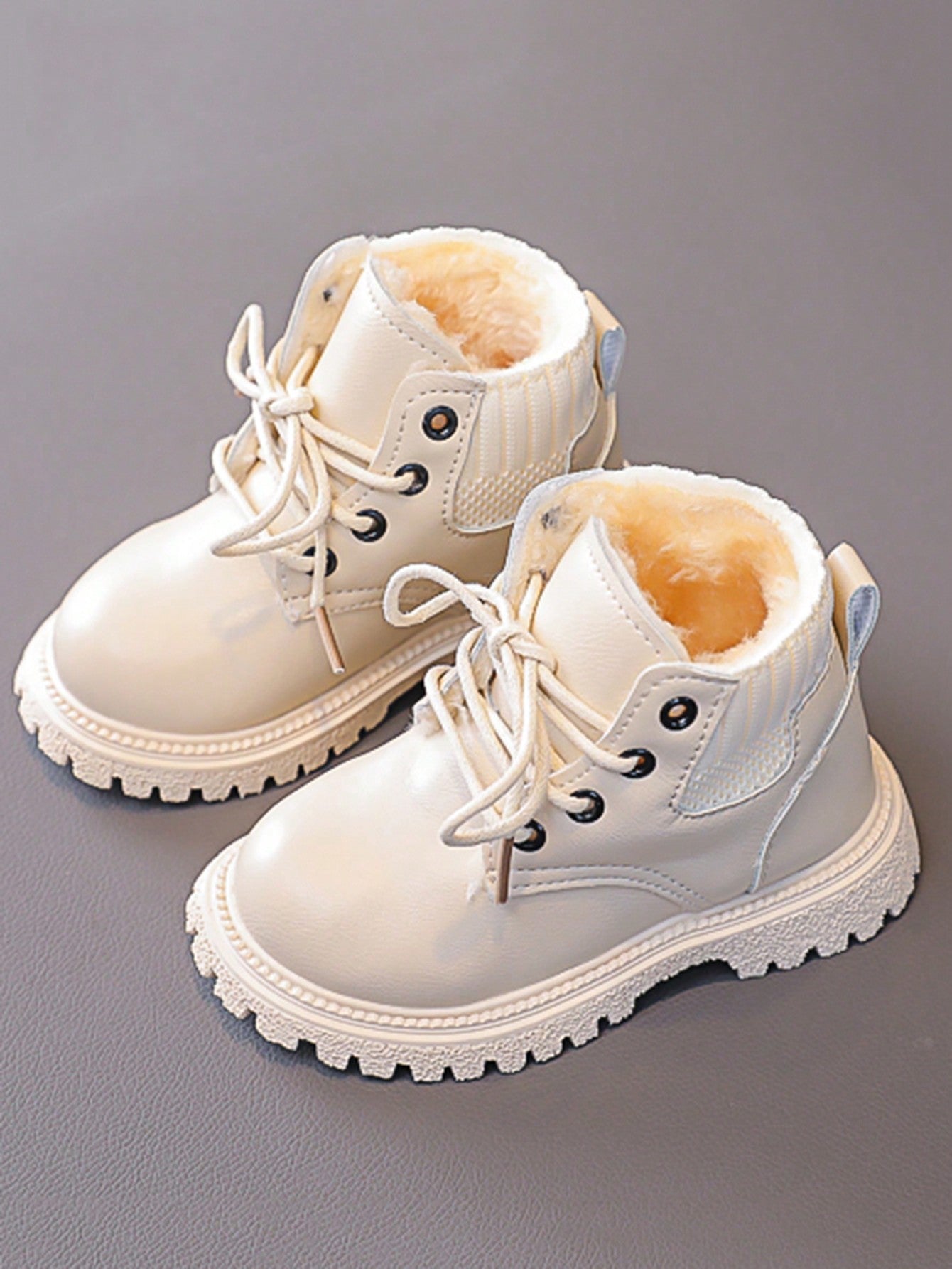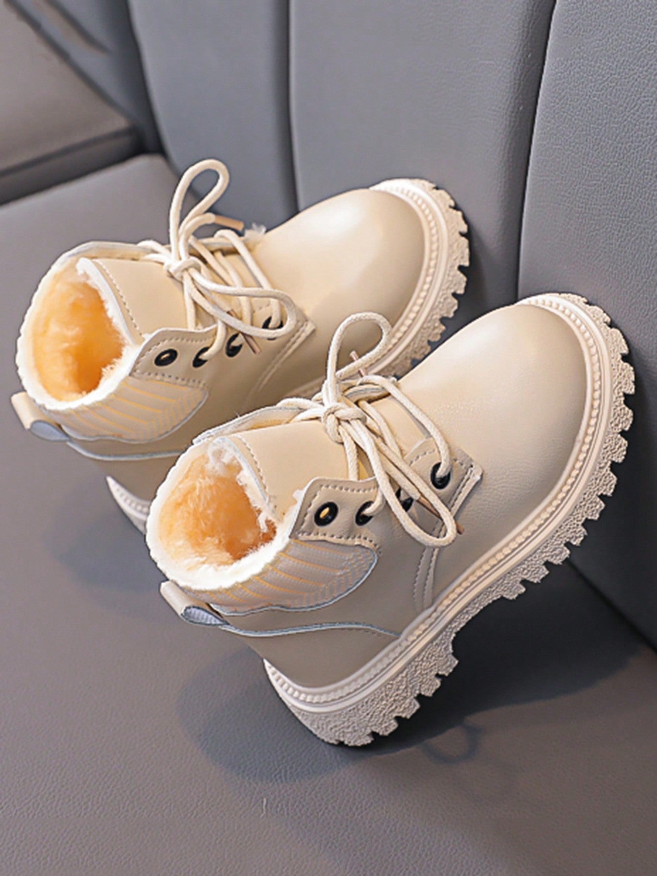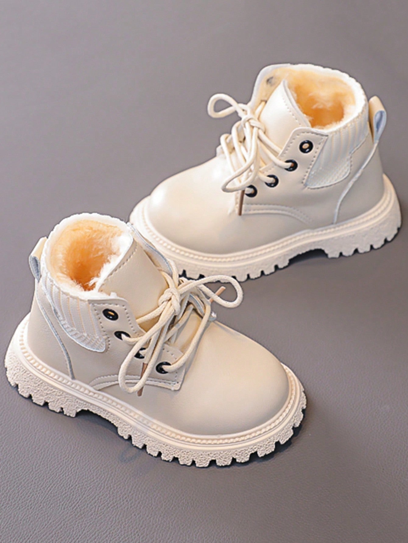 جزمة أطفال دراجة نارية عالية مدورة الأصبع, خريف وشتاء, لون صلب, مبطنة بالفرو السميكة للأولاد والبنات, جزمة قصيرة مسطحة وعصرية مصنوعة من الجلد الصناعي المريح والمتعدد الاستخدامات