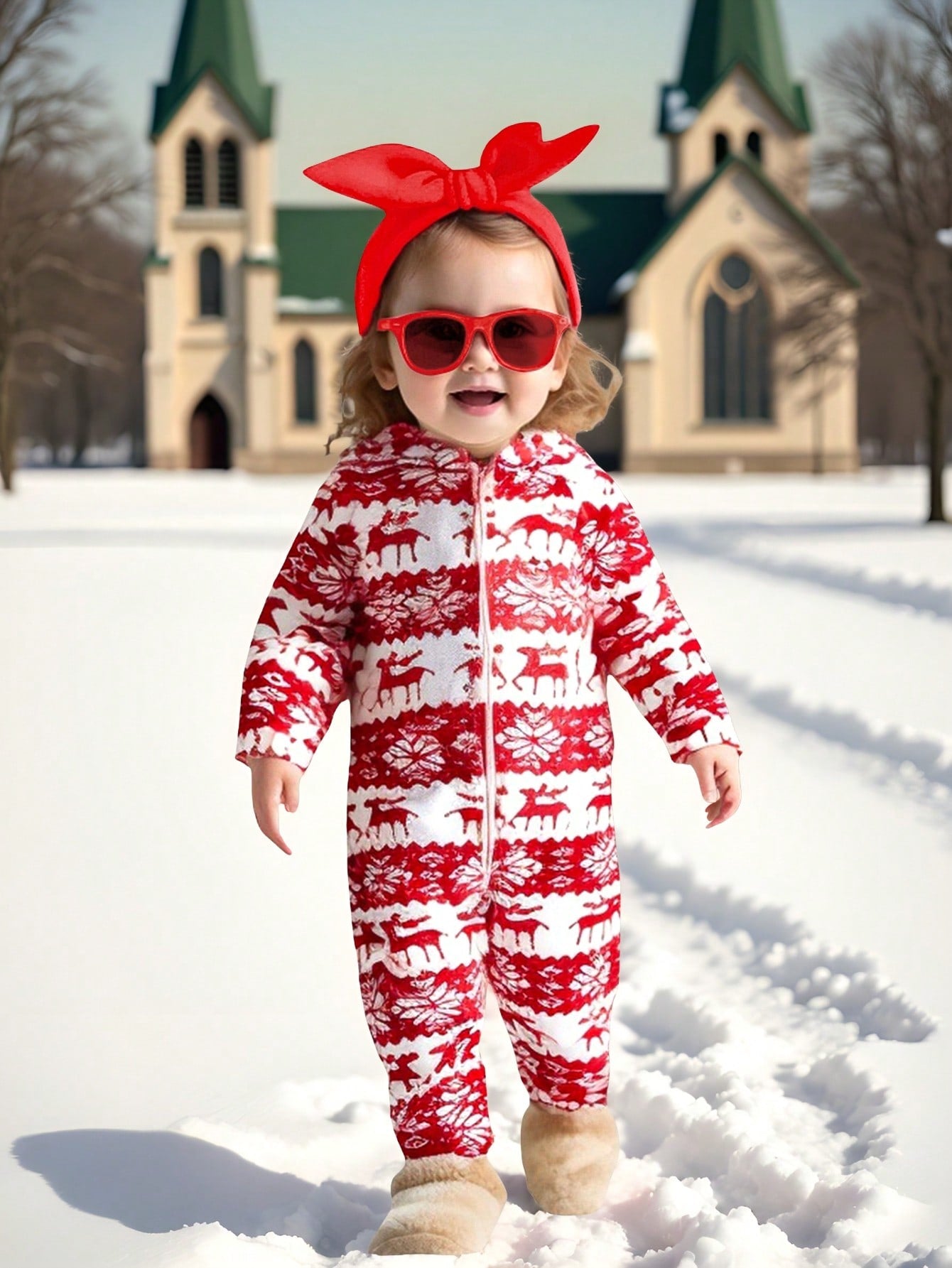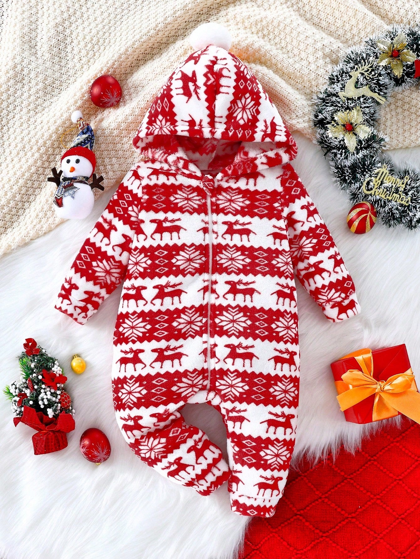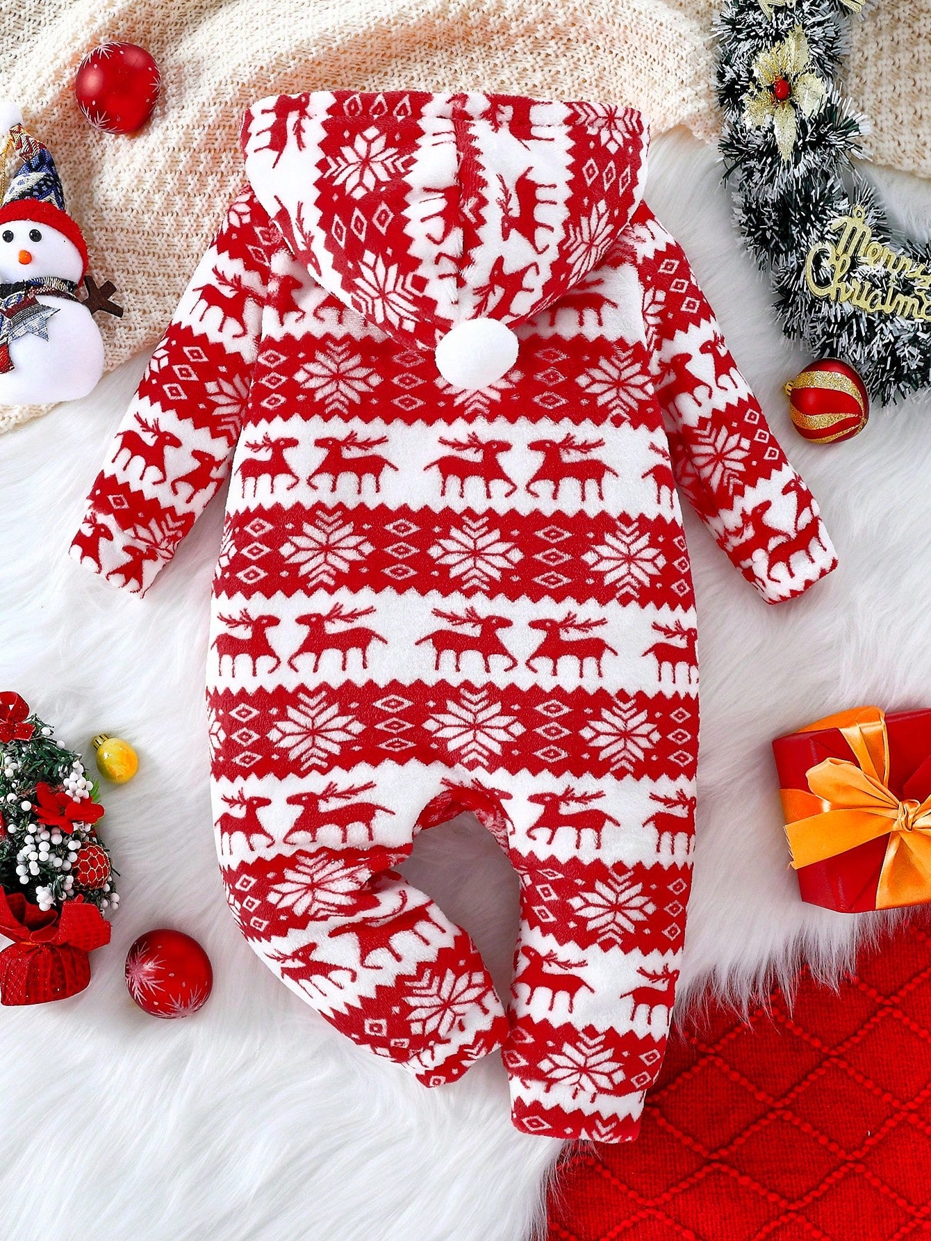 جمبسوت أطفال بنات بتصميم رجل الثلج والرنة مع أكمام طويلة