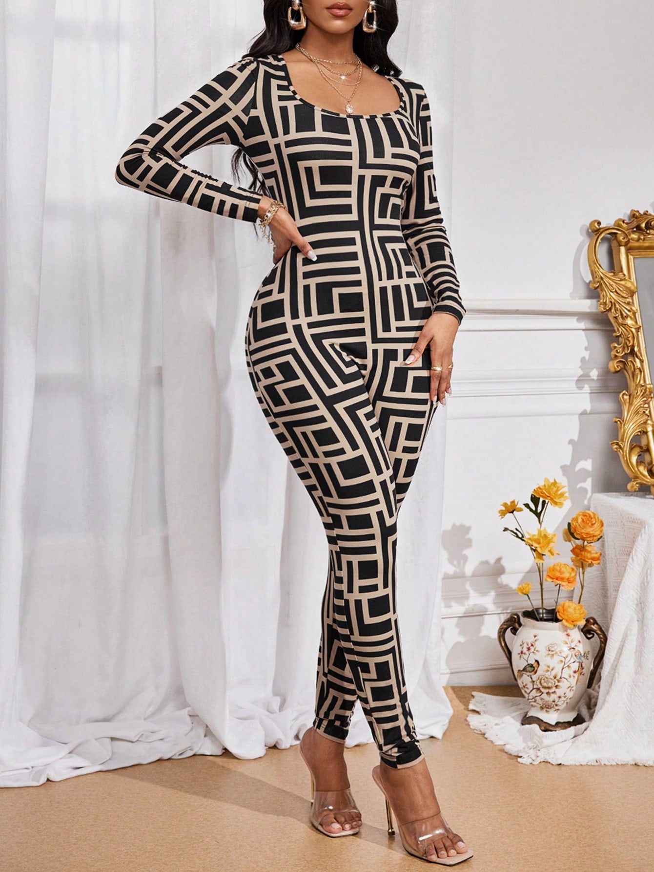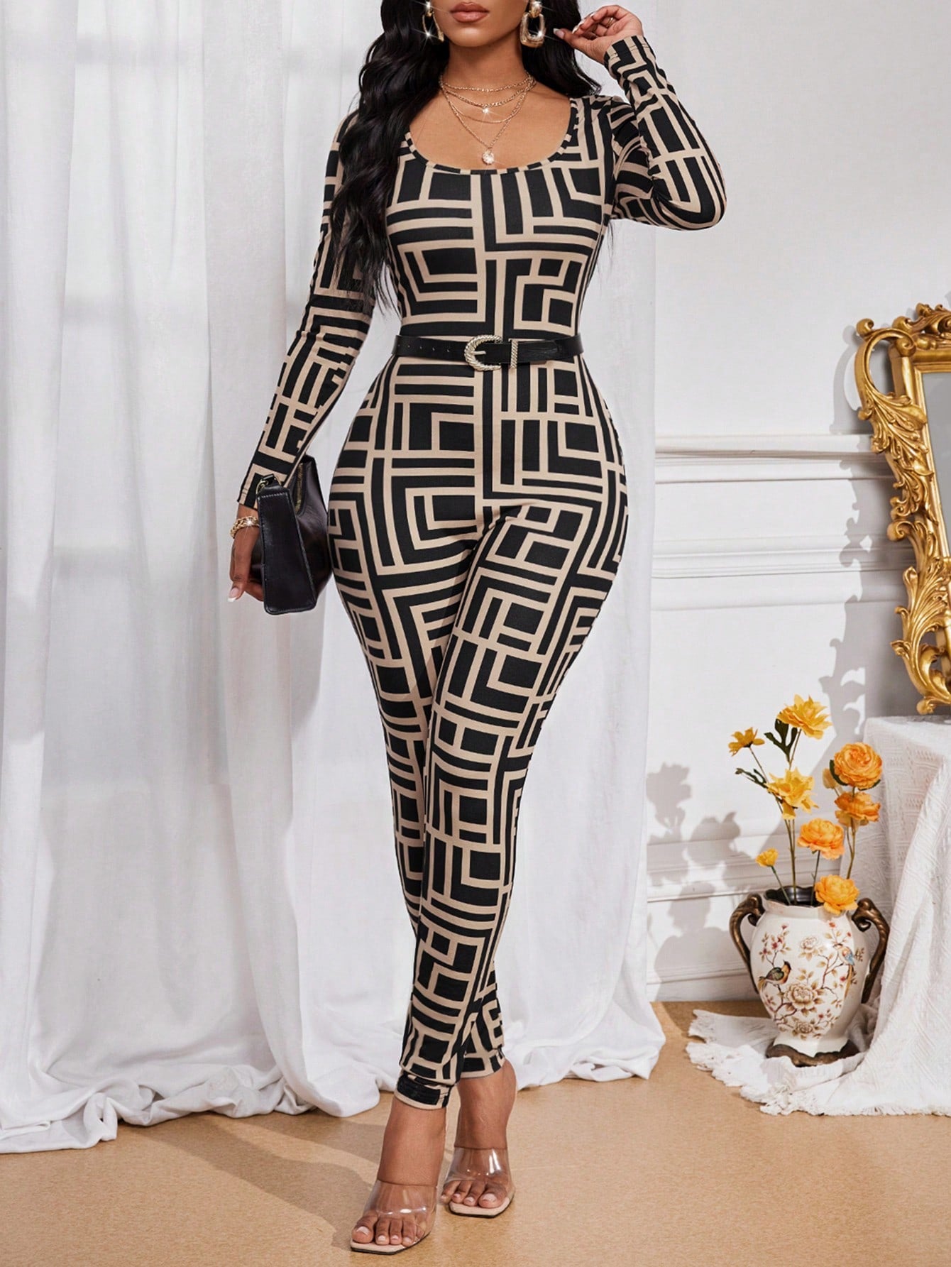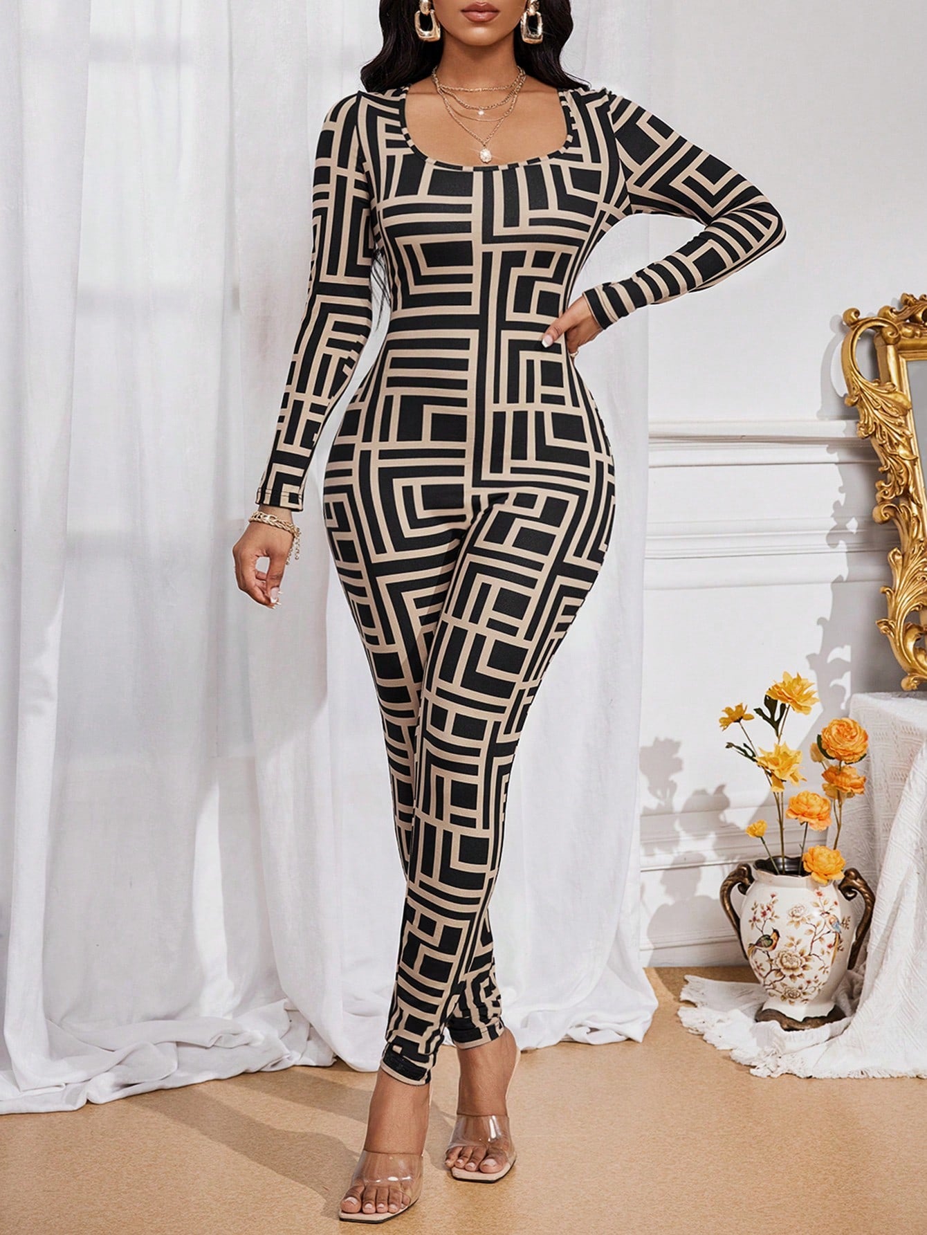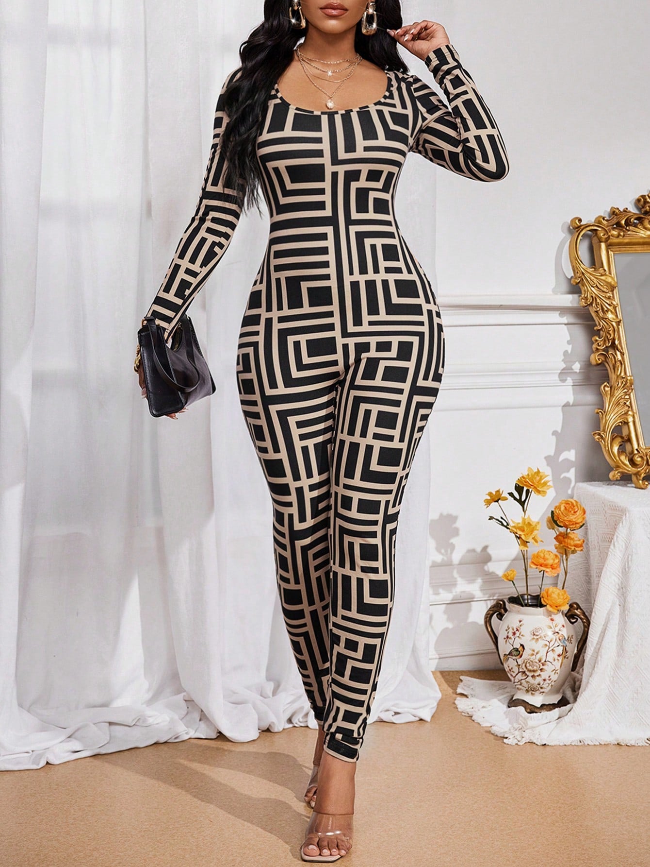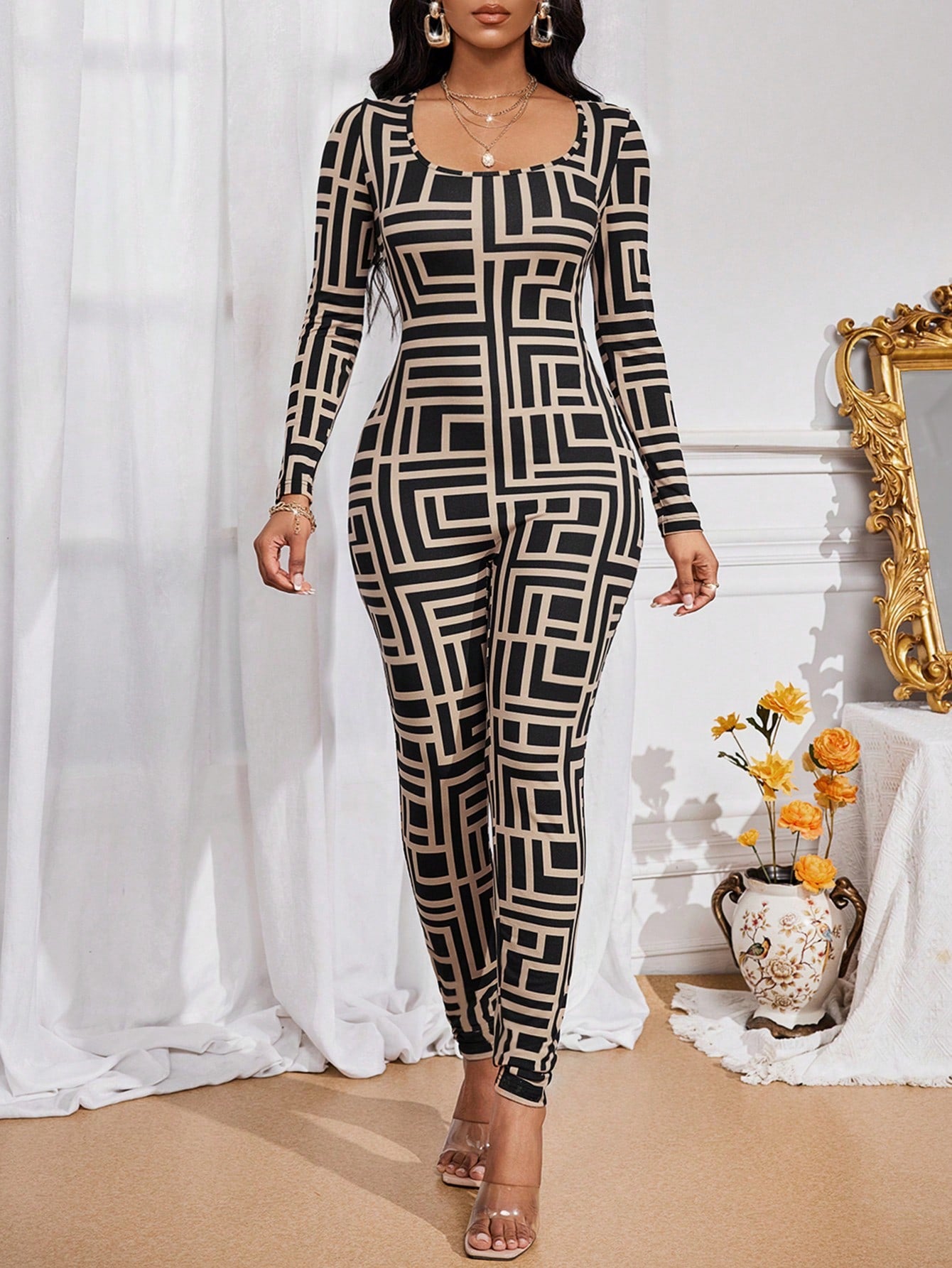 جمبسوت طويلة الأكمام بطباعة هندسية للنساء أربعة مواسم