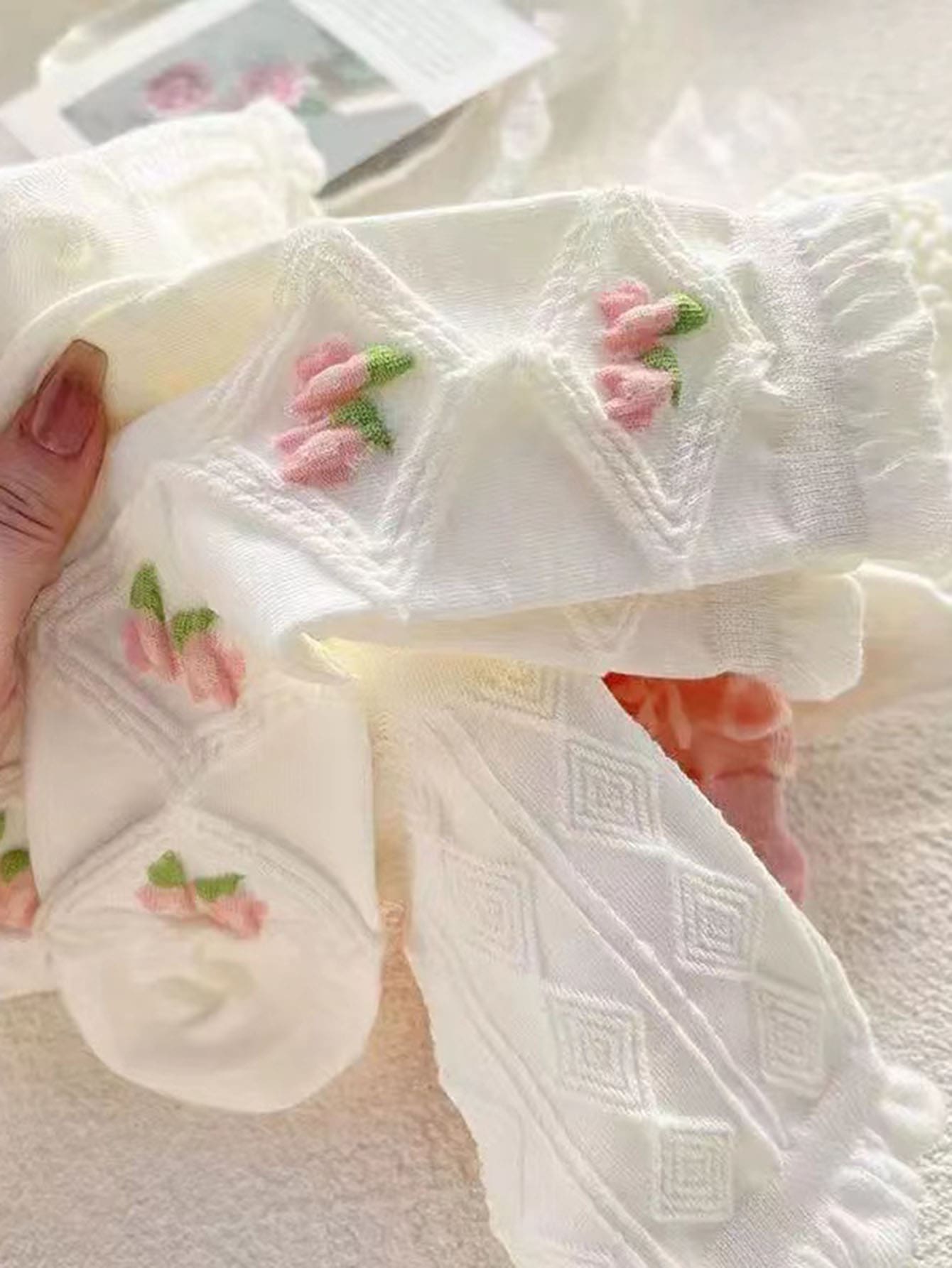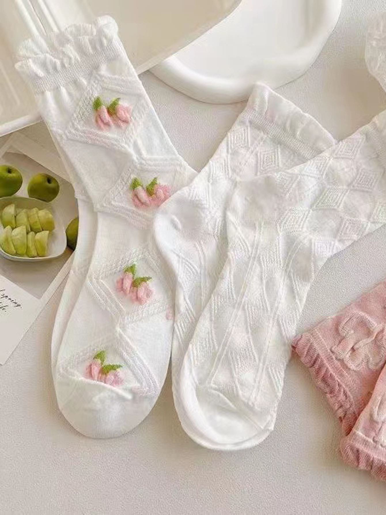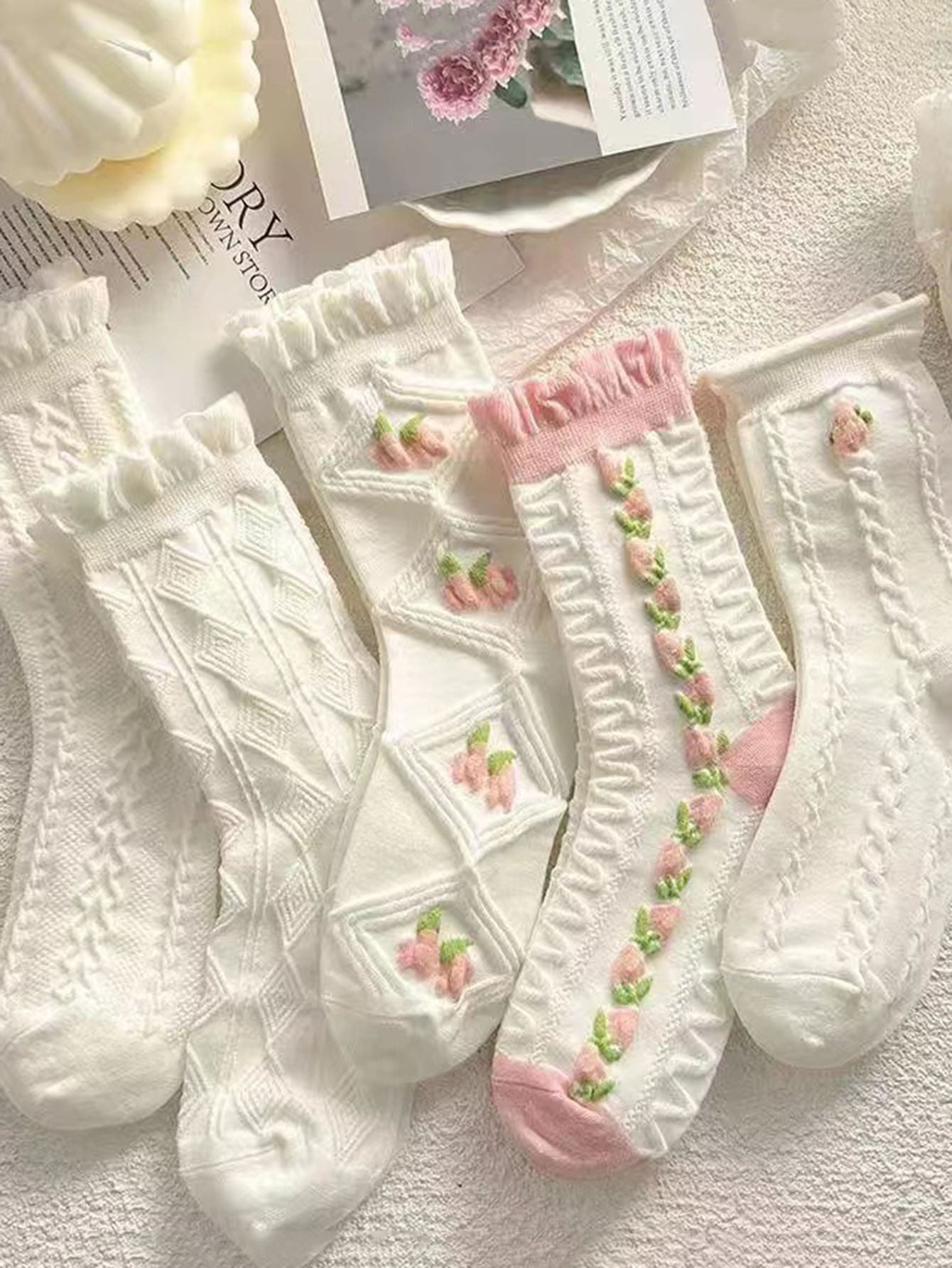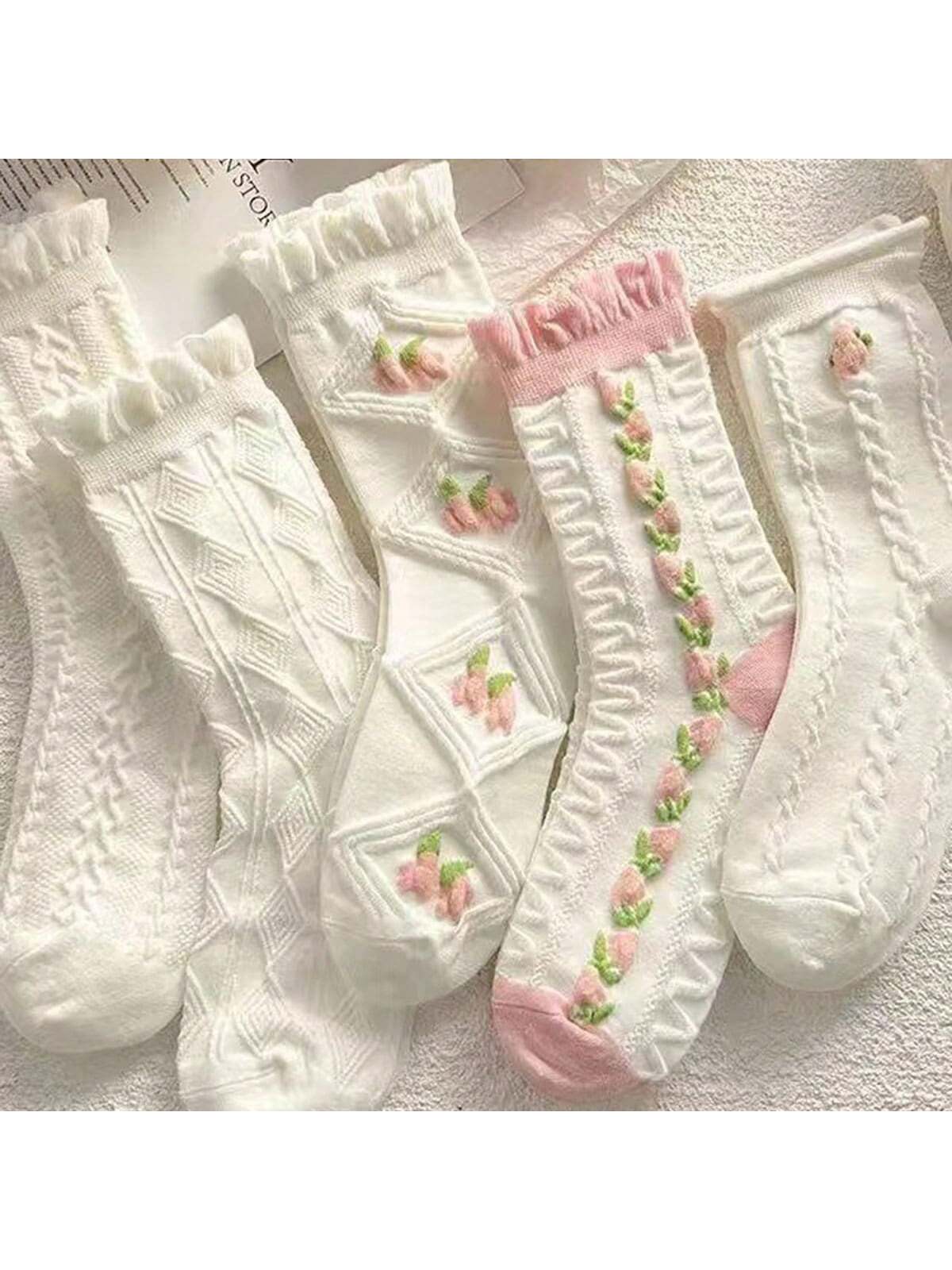 جوارب منتصف الساق الوردية والبيضاء الكورية المختلطة 5 أزواج ، مناسبة للأزياء والرياضة والمطابقة اللطيفة في الربيع والخريف