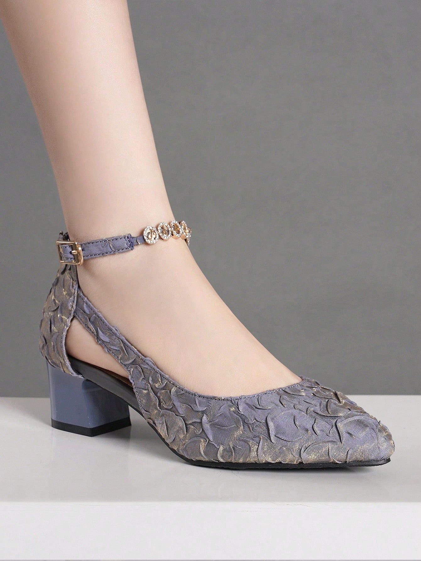 حذء كعب عالي بديكور حجر الراين محكم باصابع قدم مدبب حذاء كعب مكتنز حزام كاحل