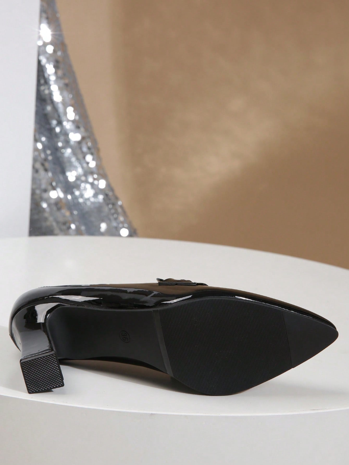 حذء كعب عالي بديكور معدني جلود براءات الاختراع الاصطناعي باصابع قدم مدبب حذاء كعب مكتنز أنيق نساء