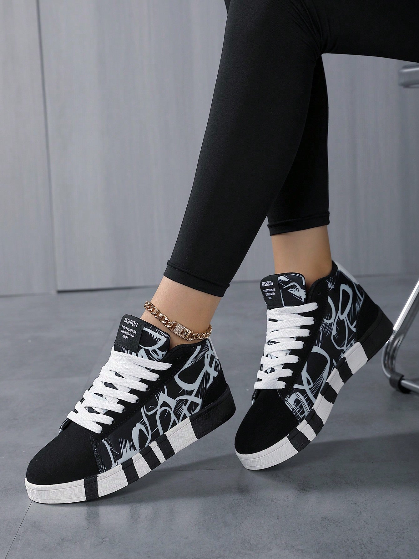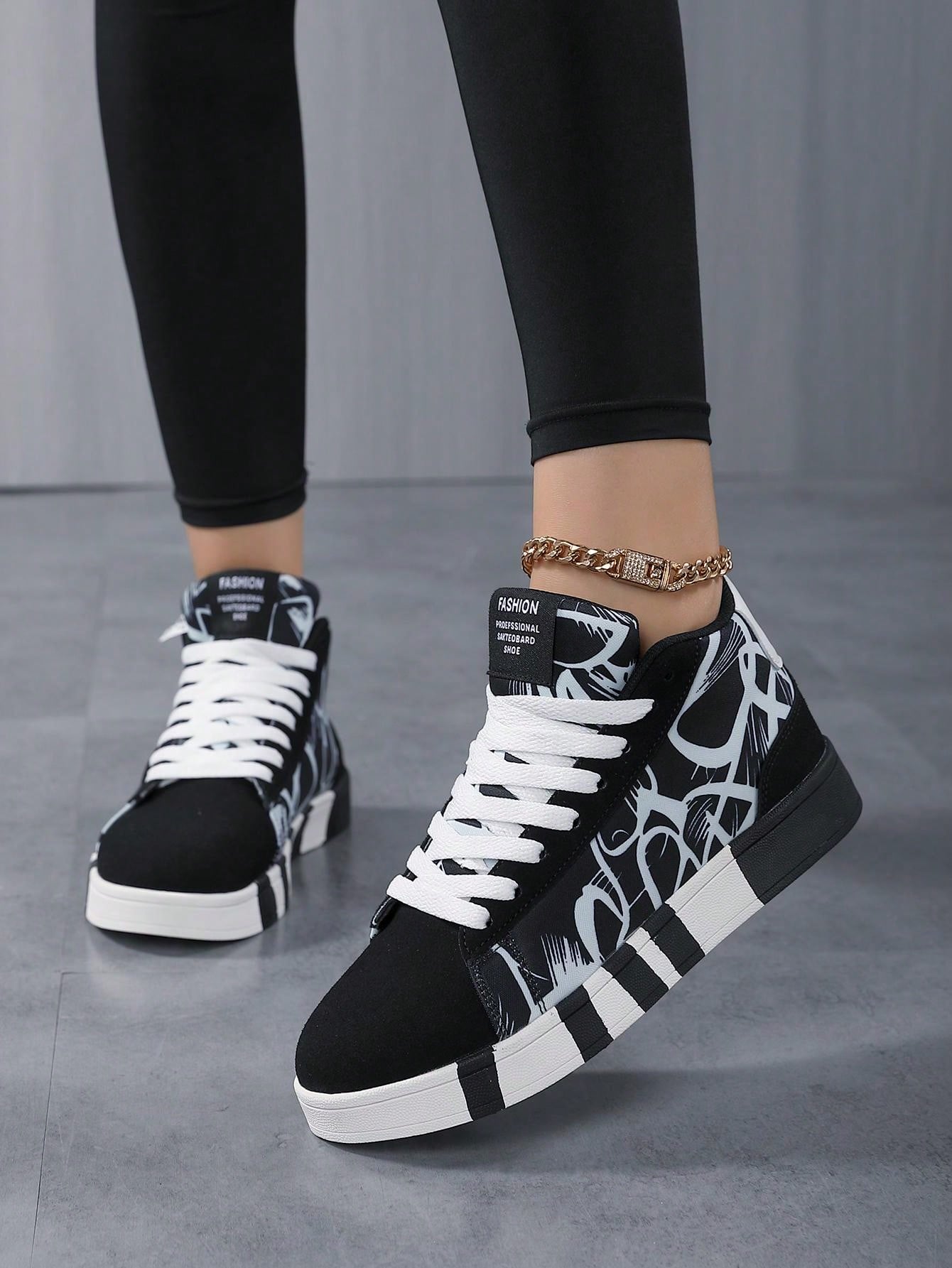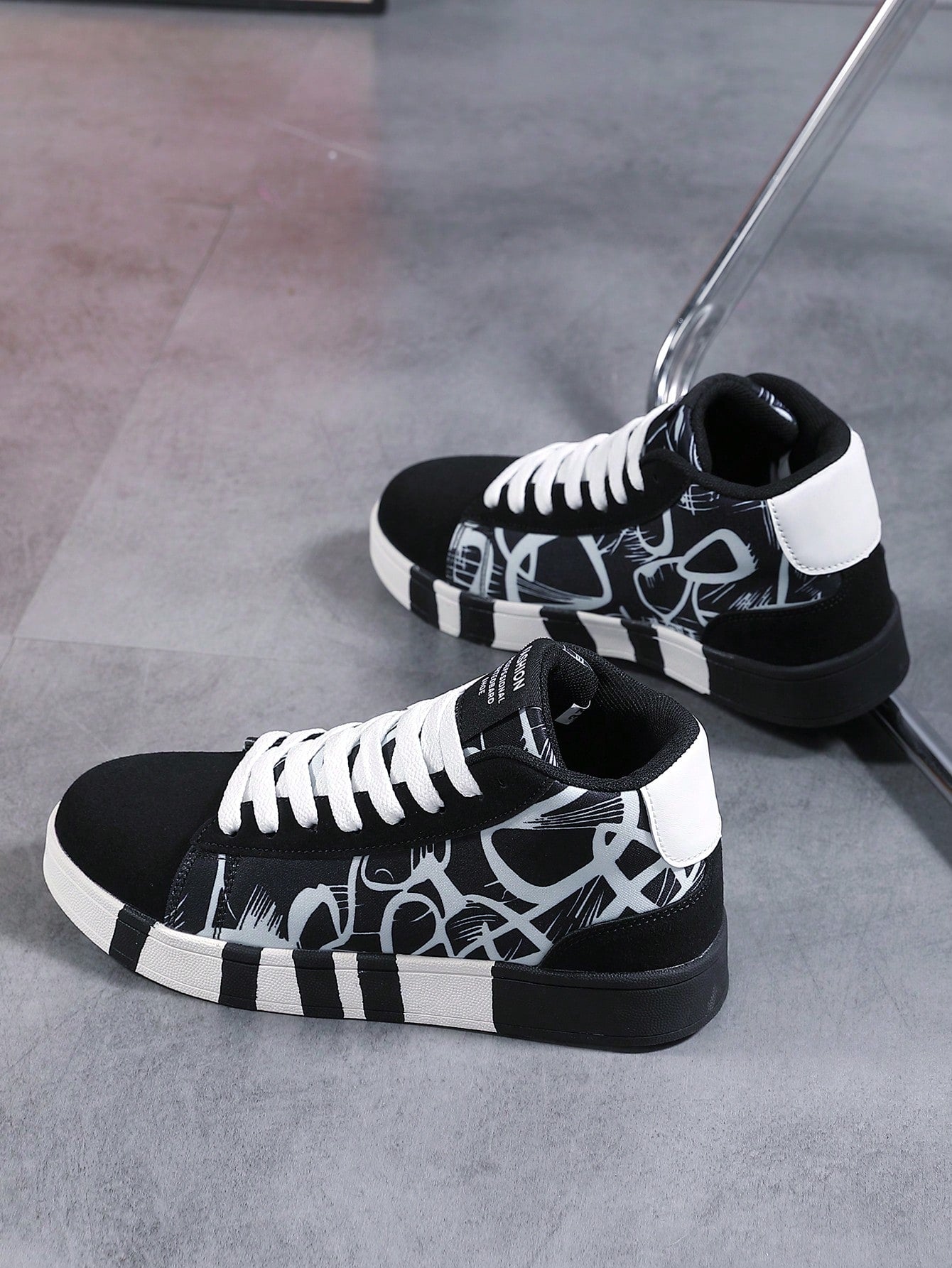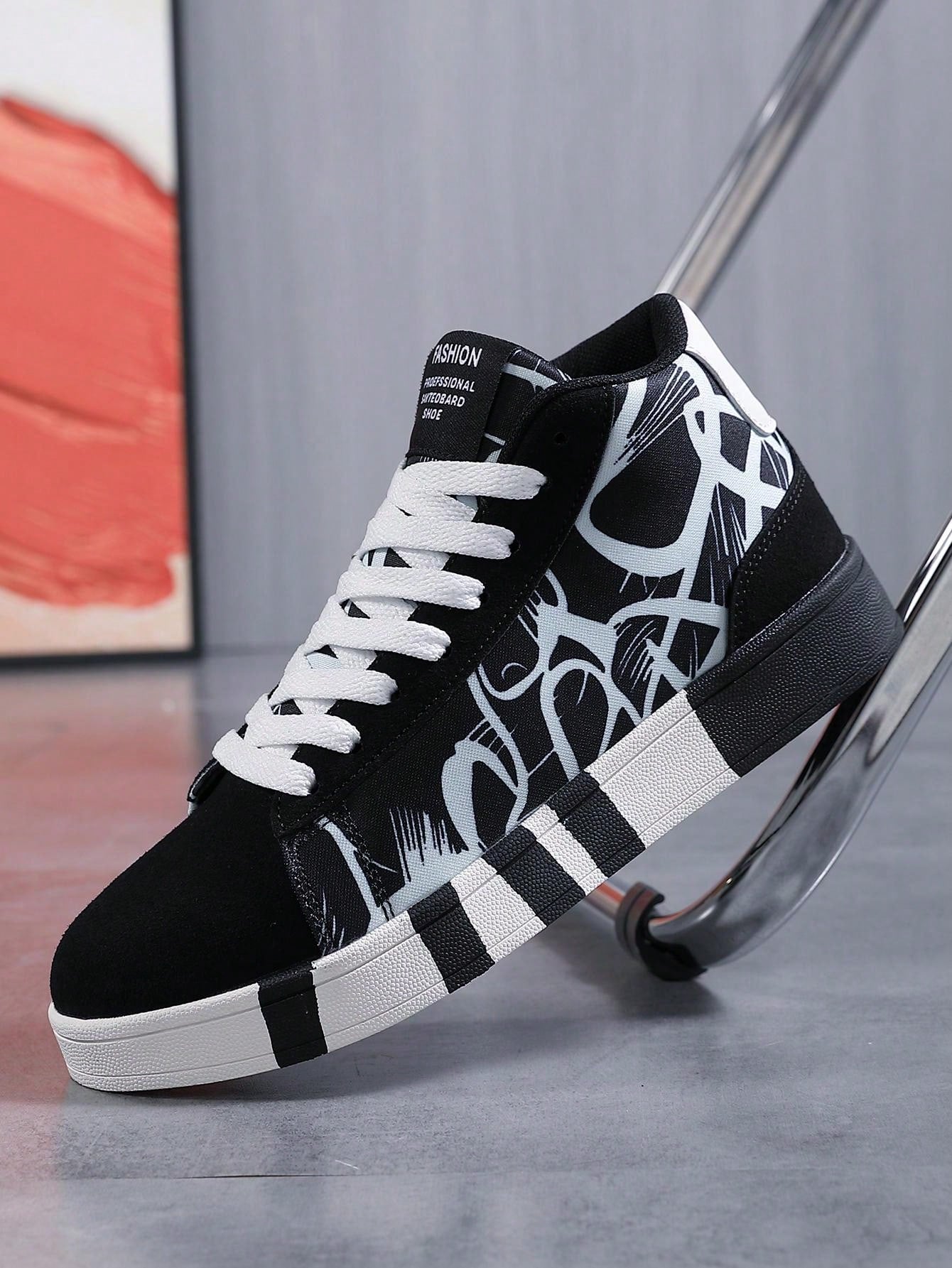 حذاء تزلج عادي عالي للجنسين بنمط رسوم الجرافيتي باللونين الكلاسيكيين الأبيض والأسود، إغلاق رباط أمامي مثالي للأنشطة الخارجية والمشي لمسافات طويلة، الخريف / الشتاء