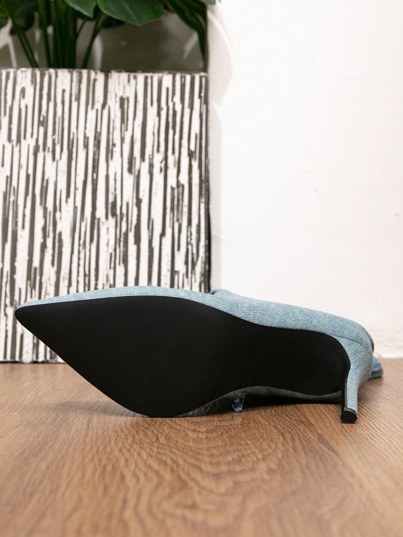 حذاء جينز فوق الركبة نسائي بكعب عال ومقدمة حادة وزمزمة تفصيلية، لون أزرق