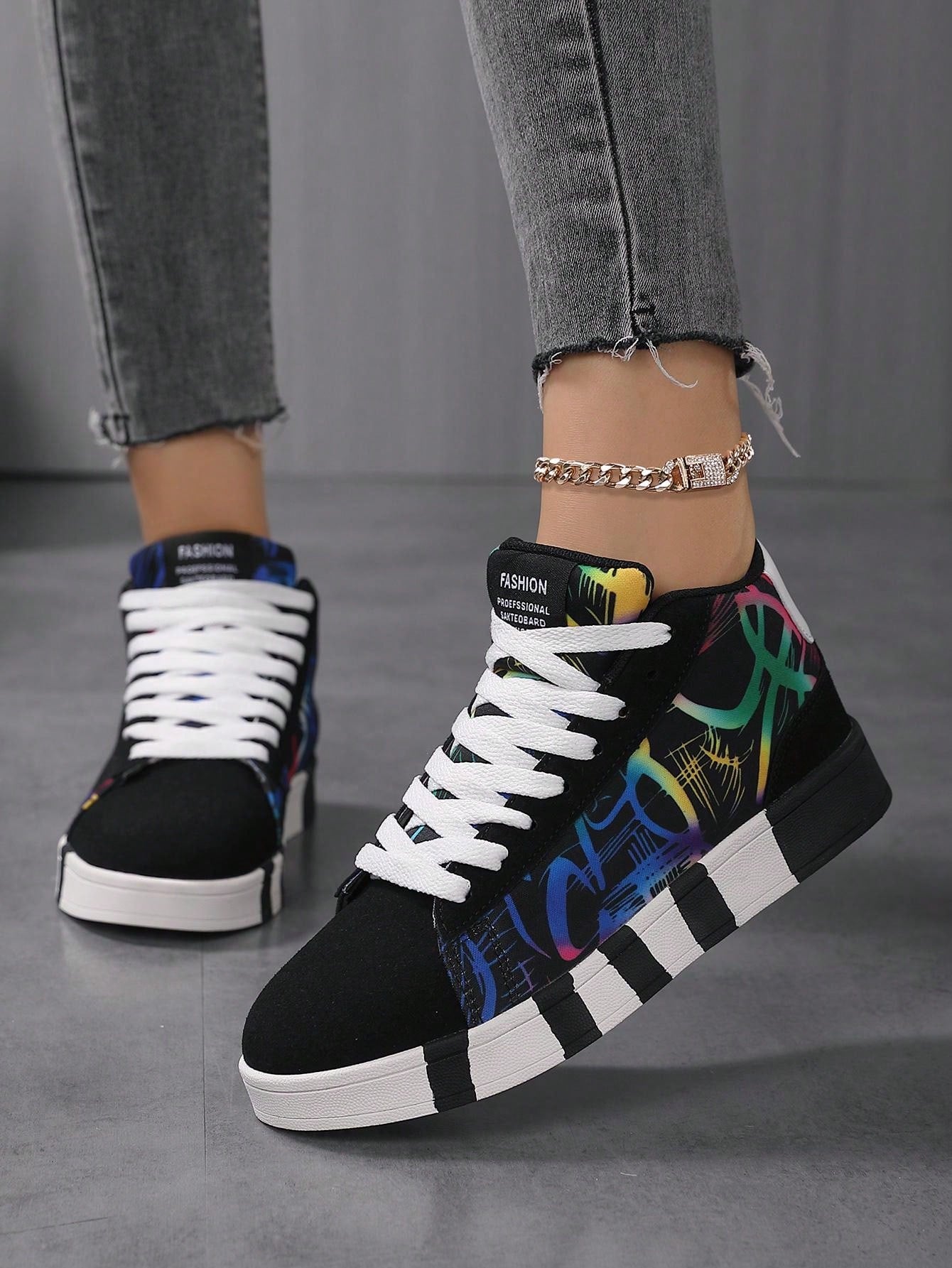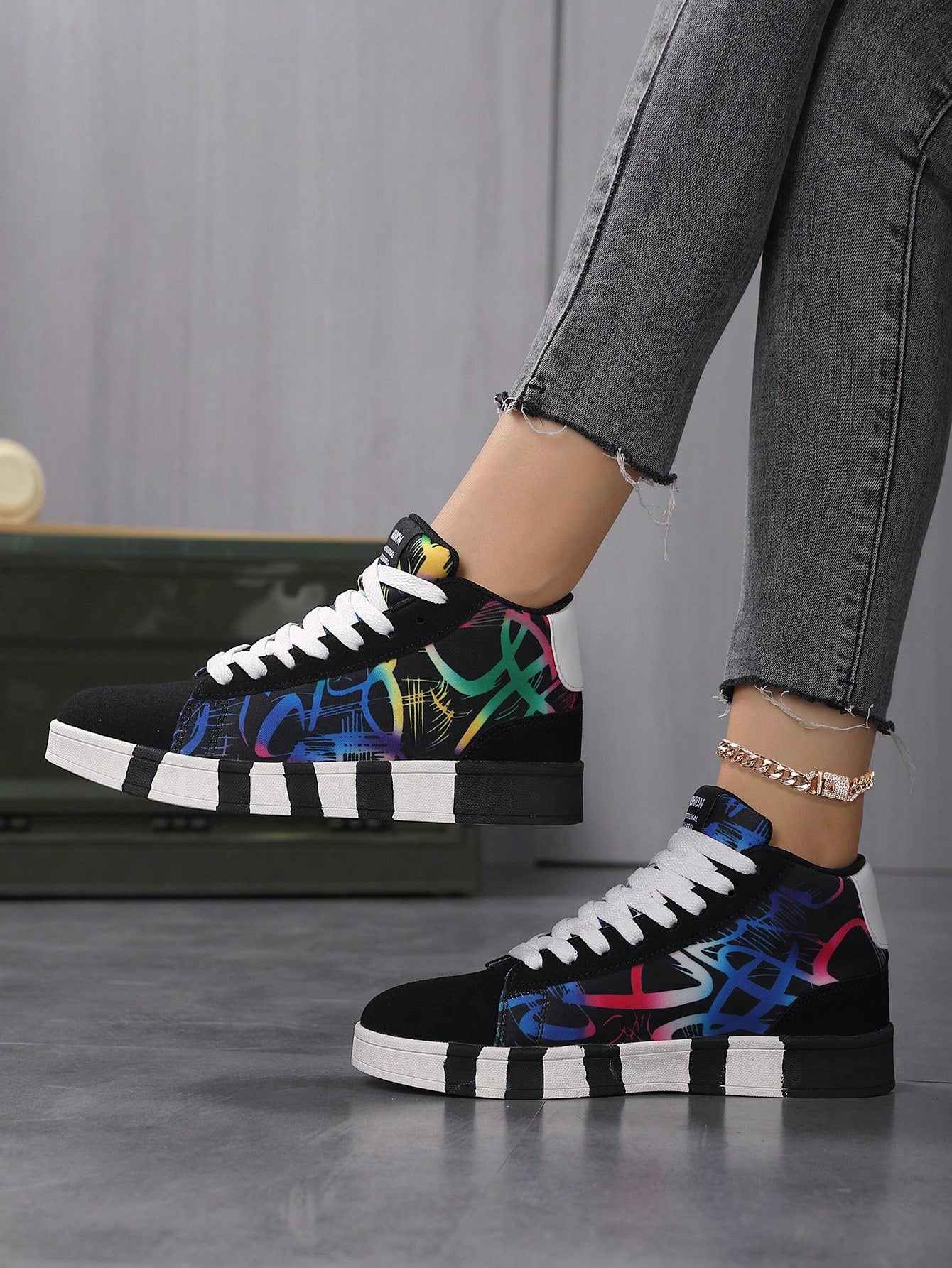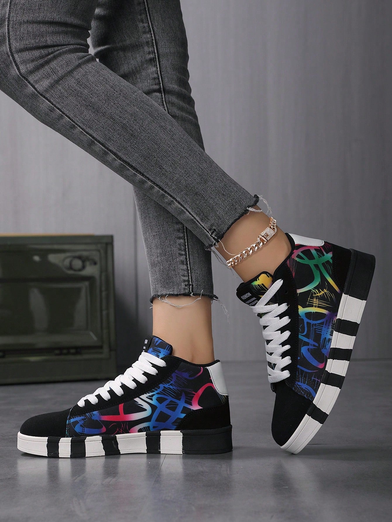حذاء ركوب التزلج على الجليد عالي القمة الشخصية غير المشروطة برسوم جرافيتية للنساء لخريف وشتاء جديد ، تصميم كلاسيكي ملون ، حذاء مشي للجنسين خارجي يربط بالأربطة المخصص لرياضة المشي والتسلق