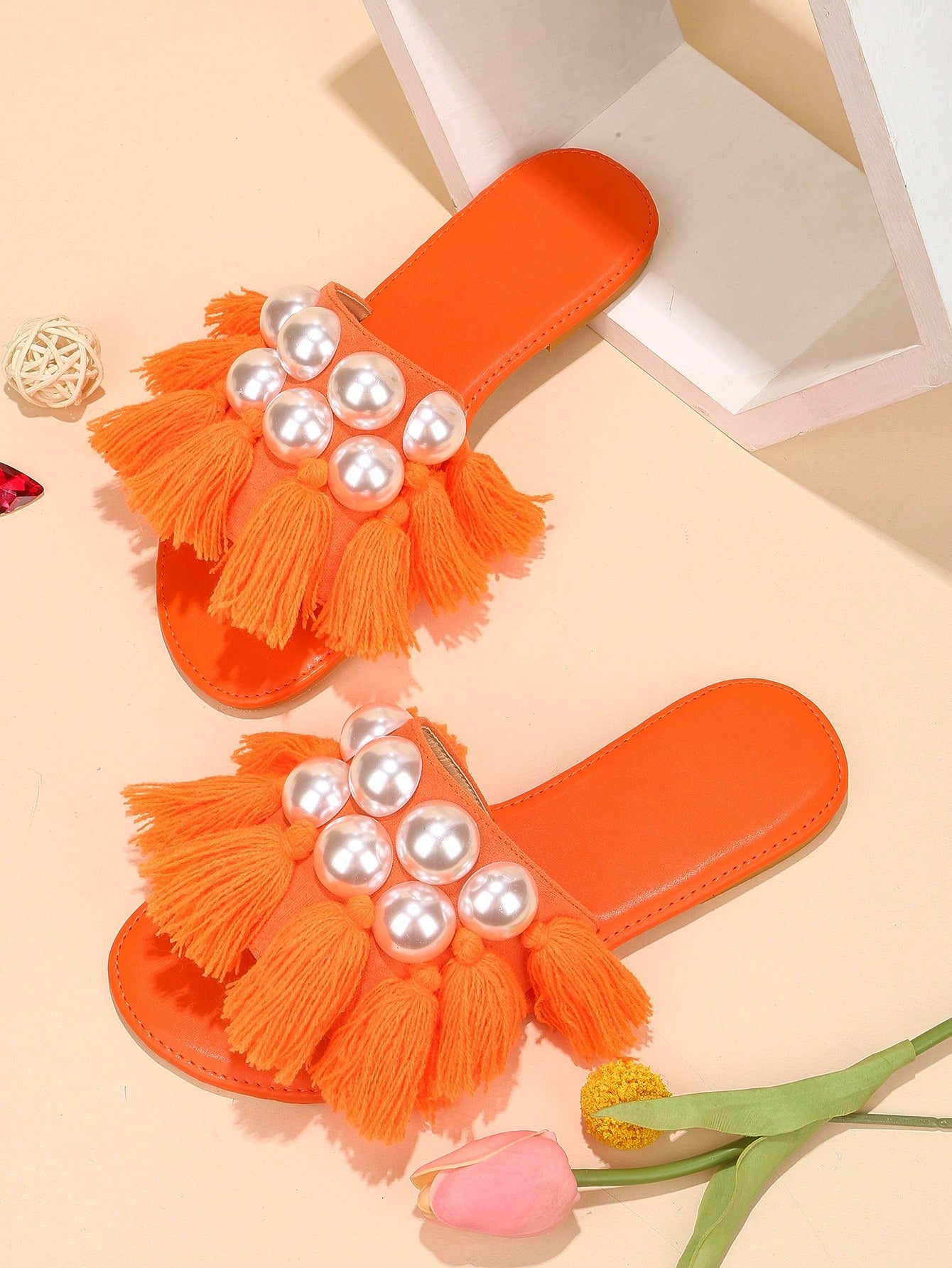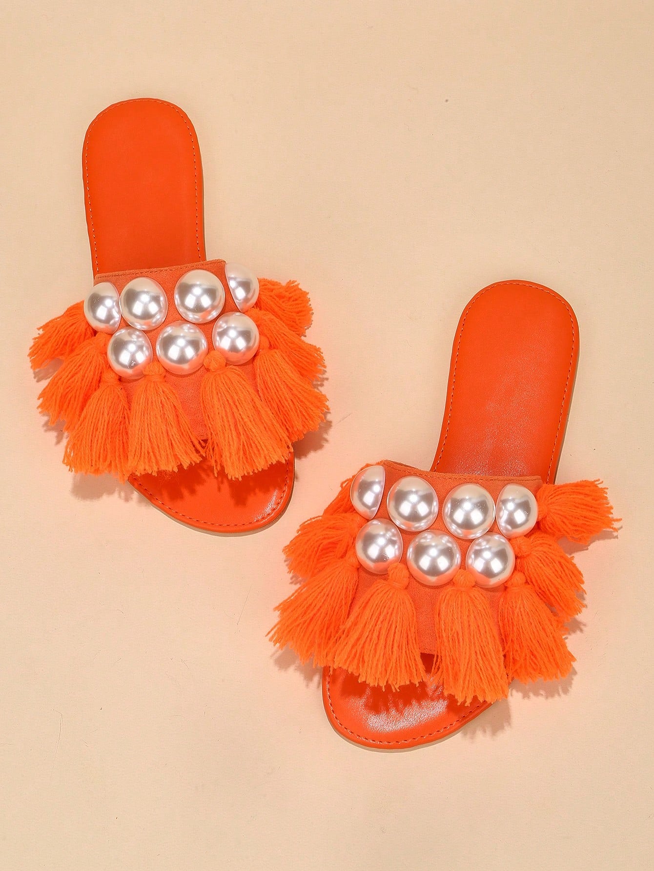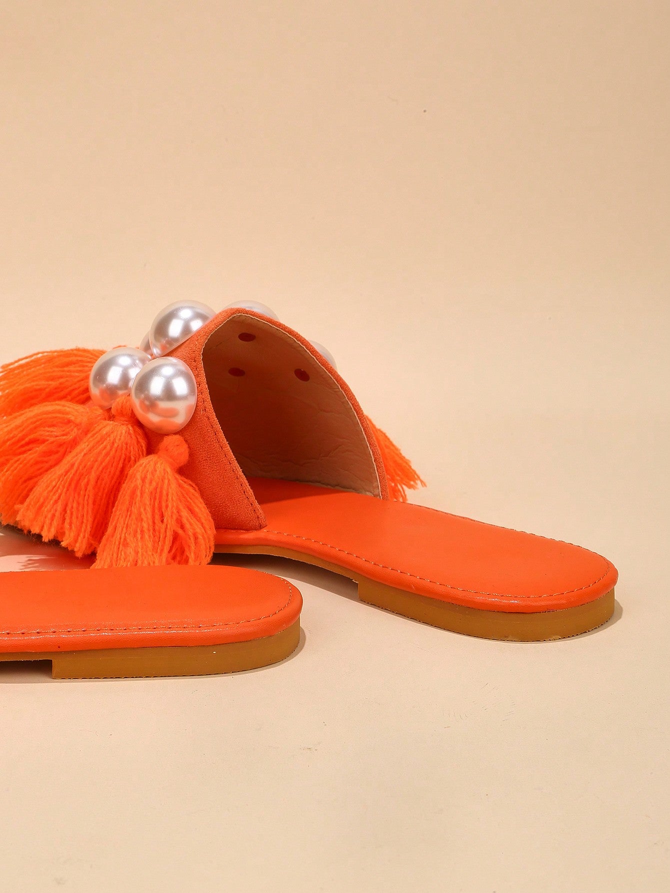 حذاء رملي مسطح مرصع باللؤلؤ والزينة ونعل شفاف يعتبر موضة
