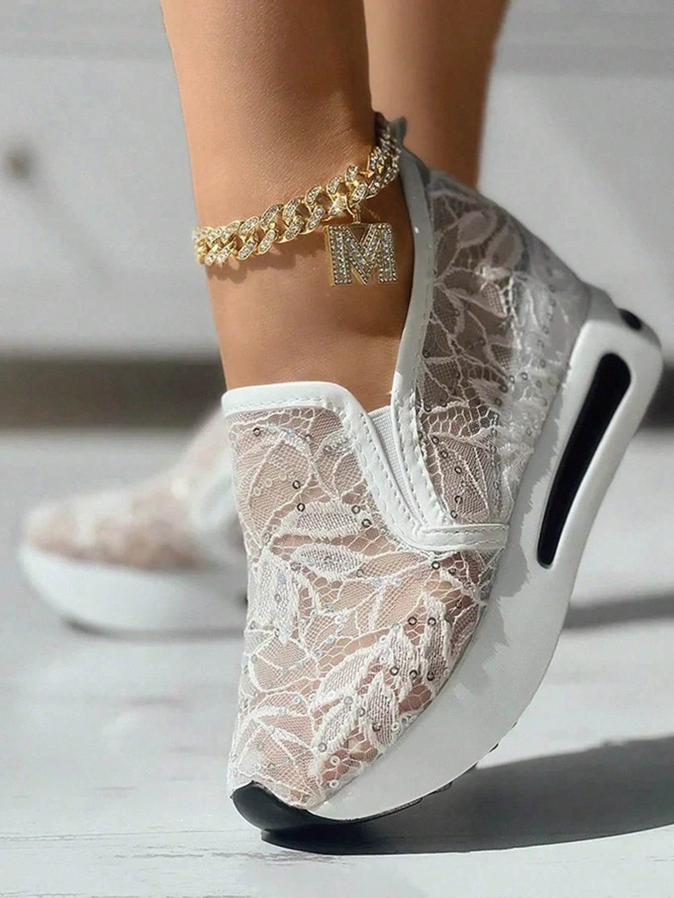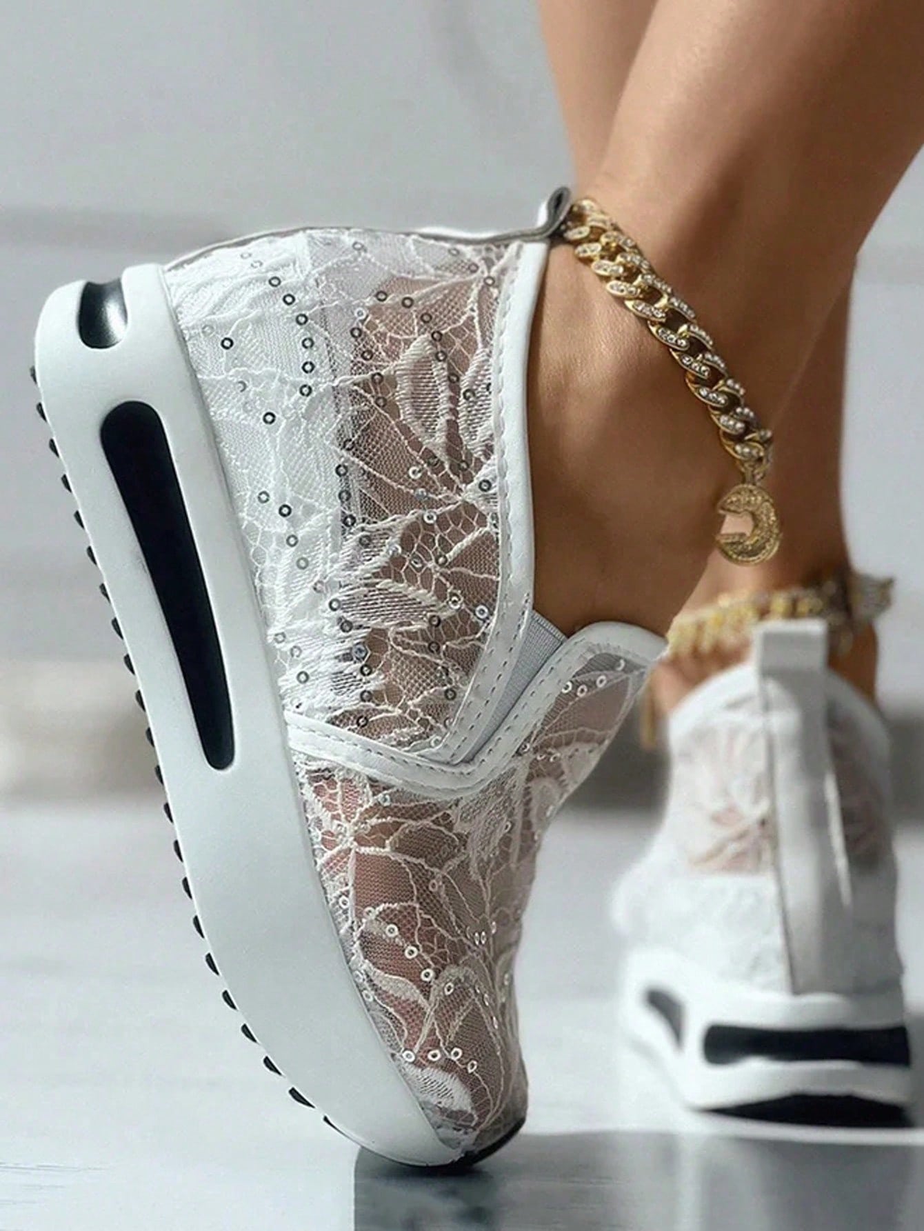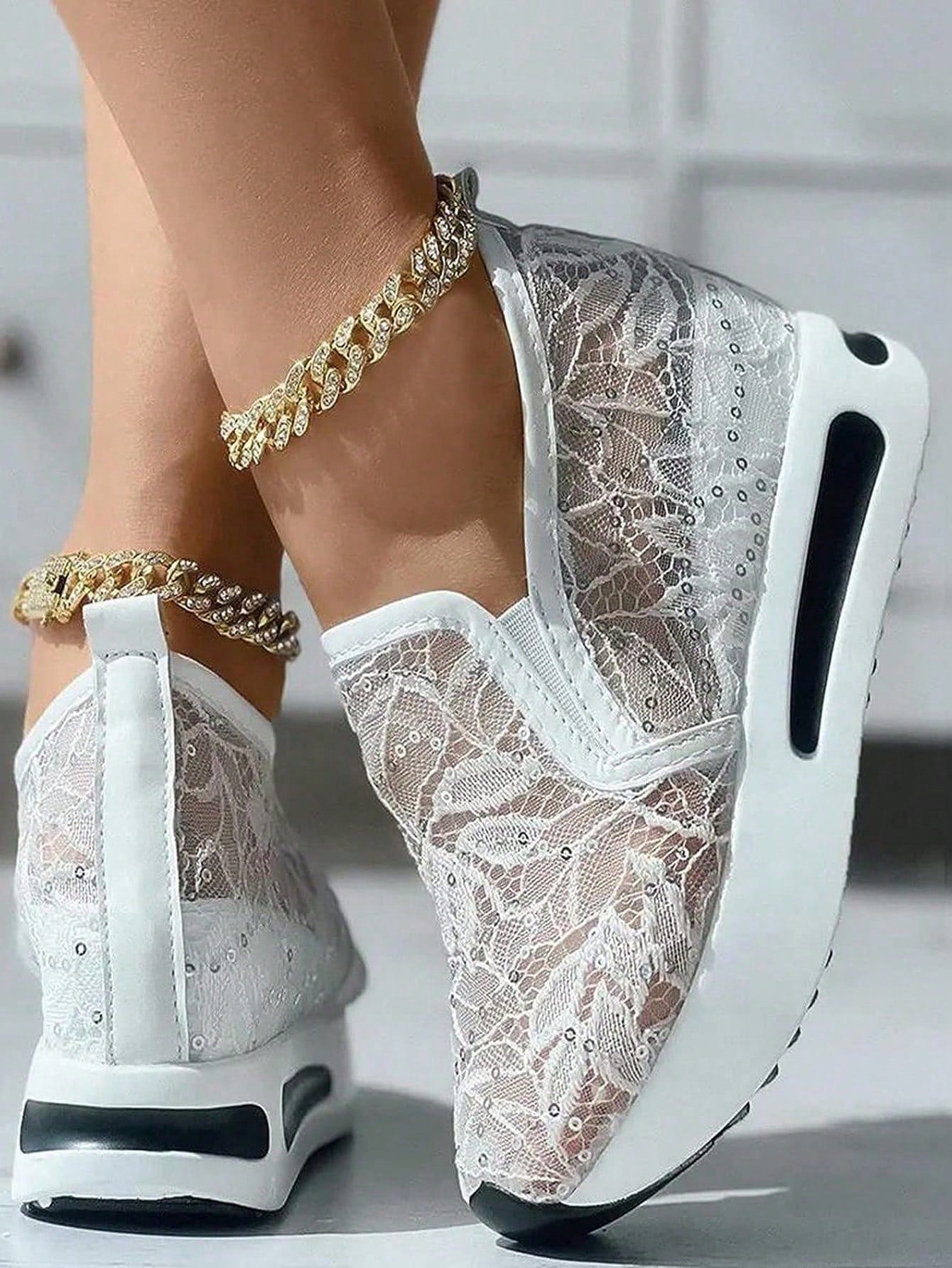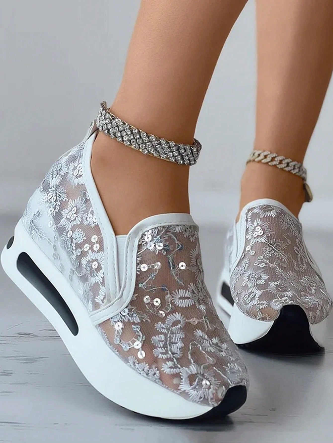 حذاء نسائي عادي بكعب سميك مزين بالدانتيل والزهور واللمعة