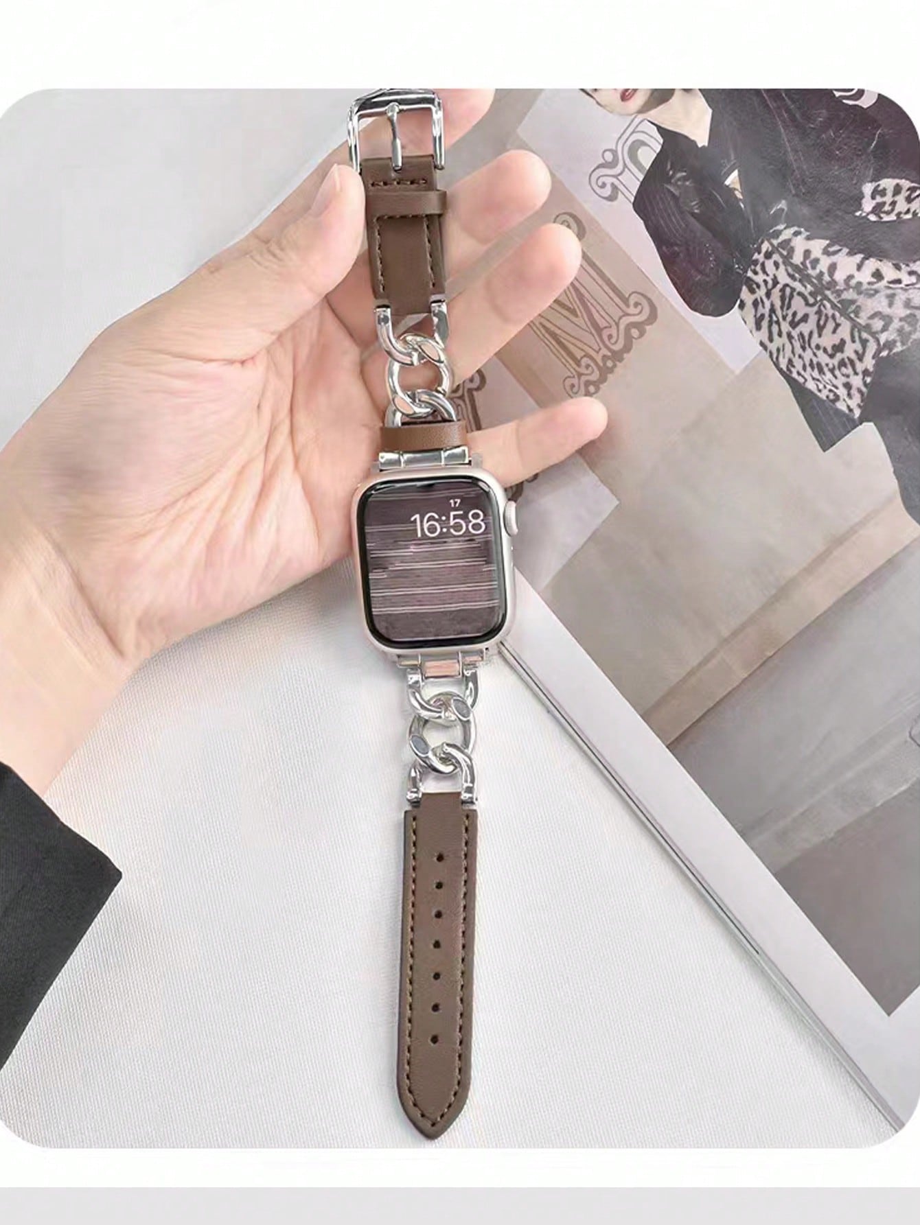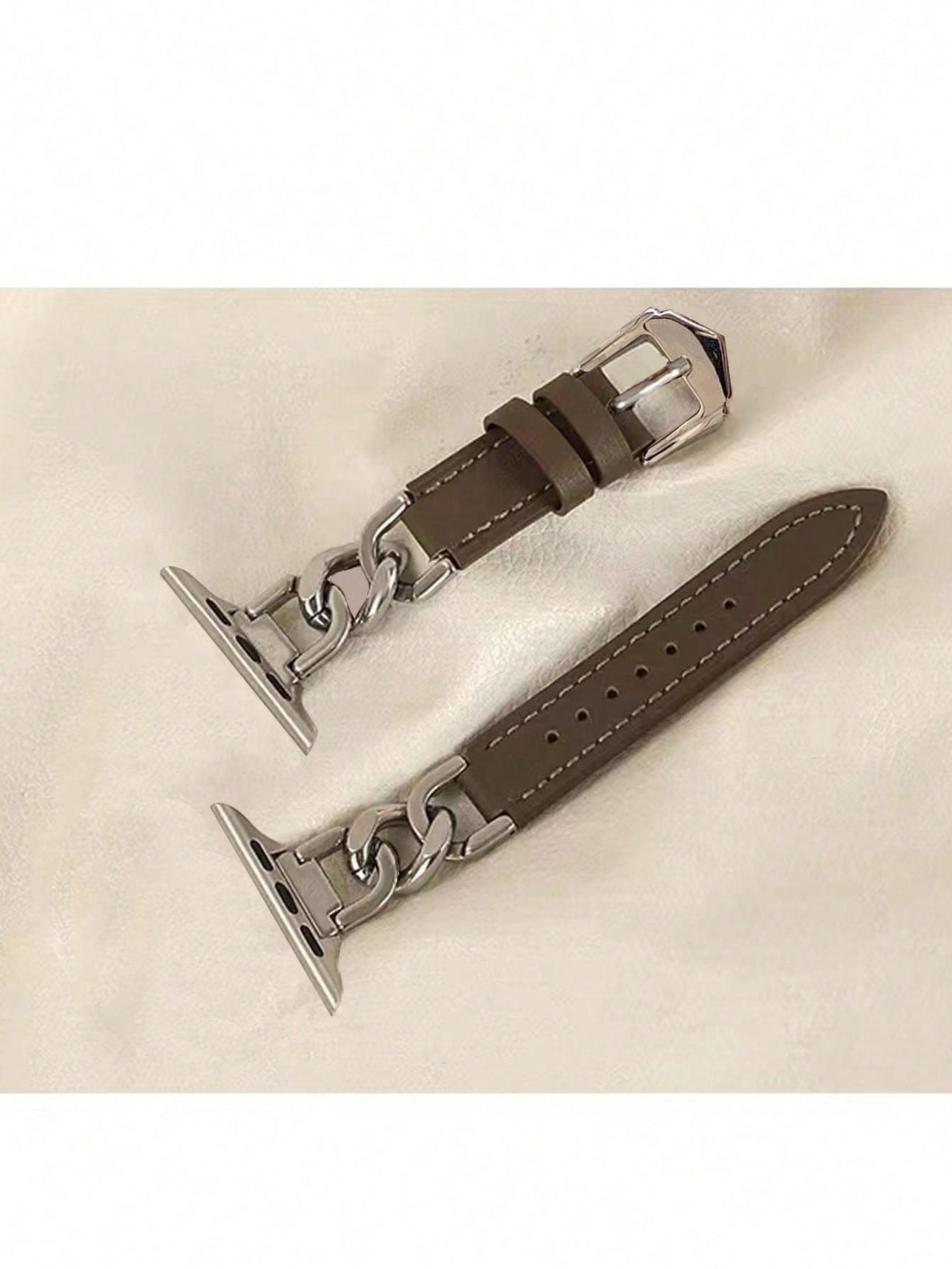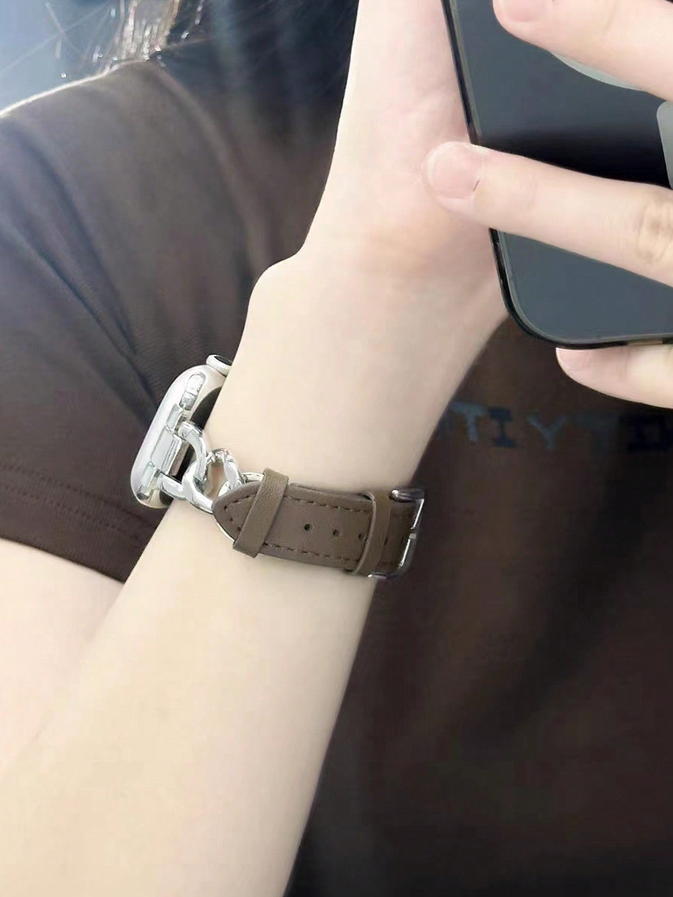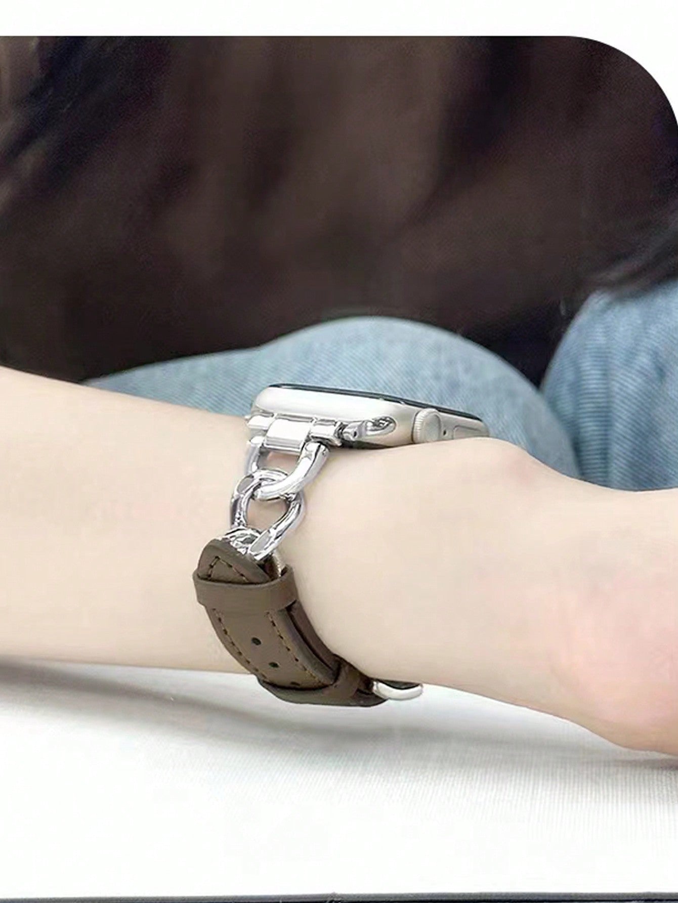 حزام ساعة آبل معدني تأثير الجينز فضي الخياطة جلد بني