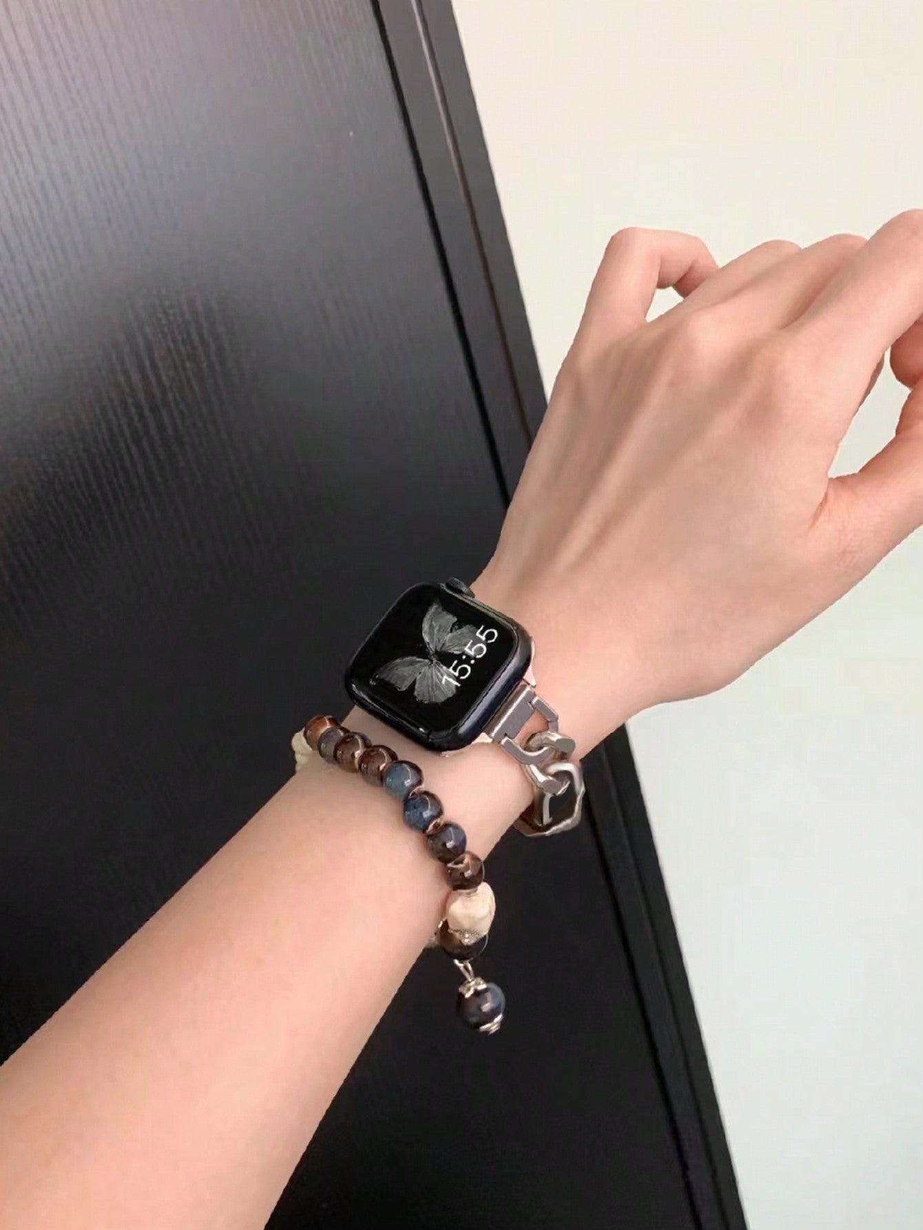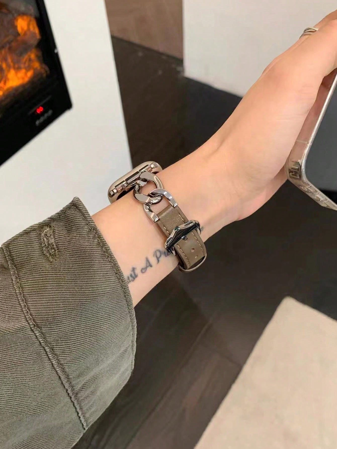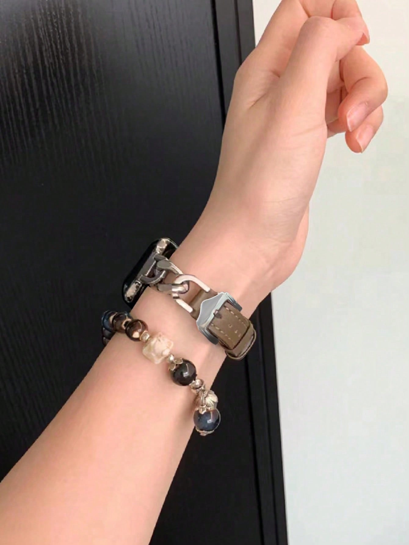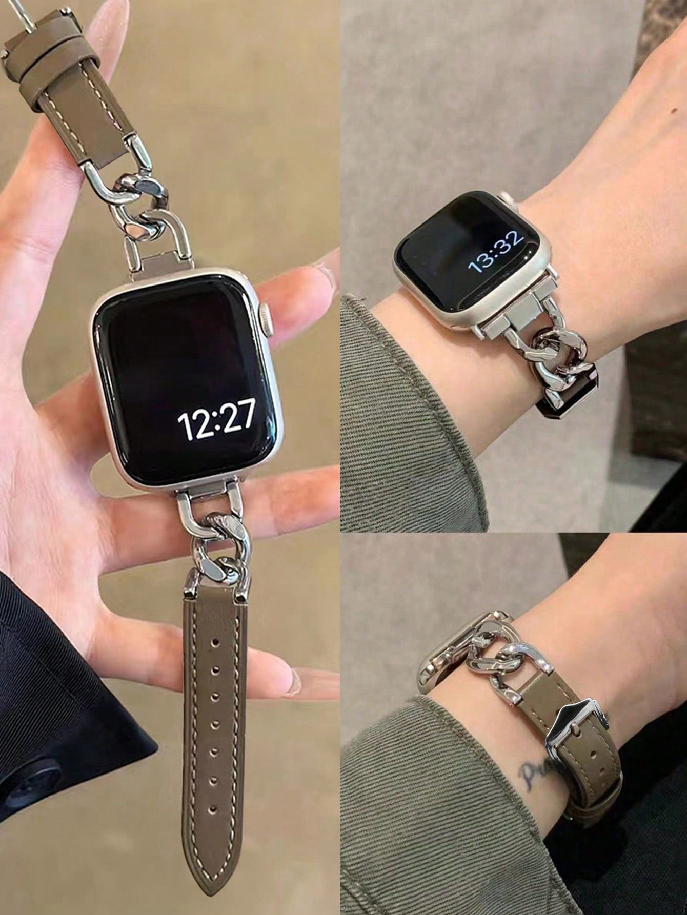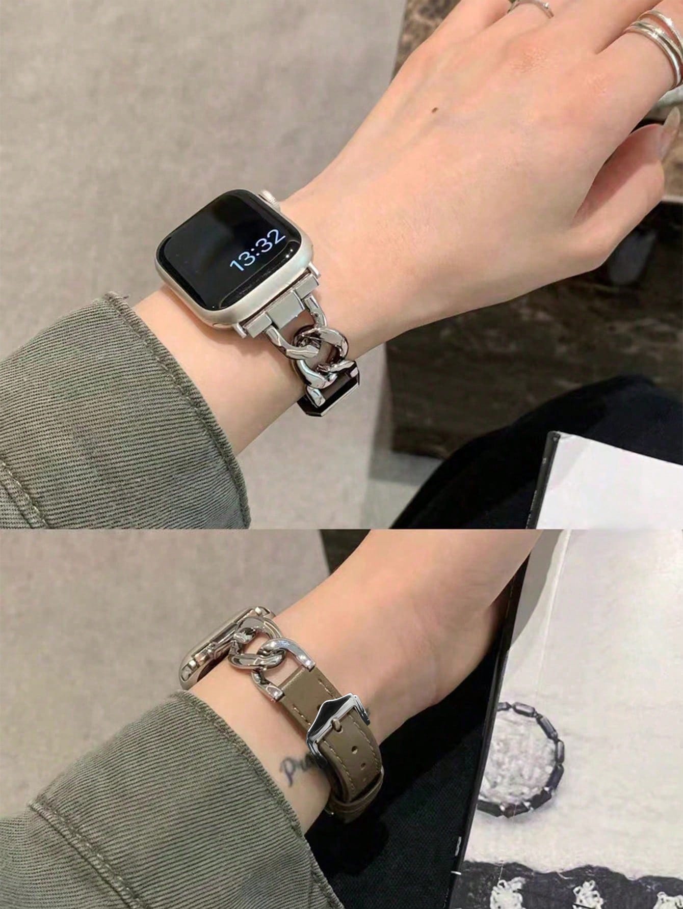 حزام ساعة آبل معدني تأثير الجينز فضي الخياطة جلد بني