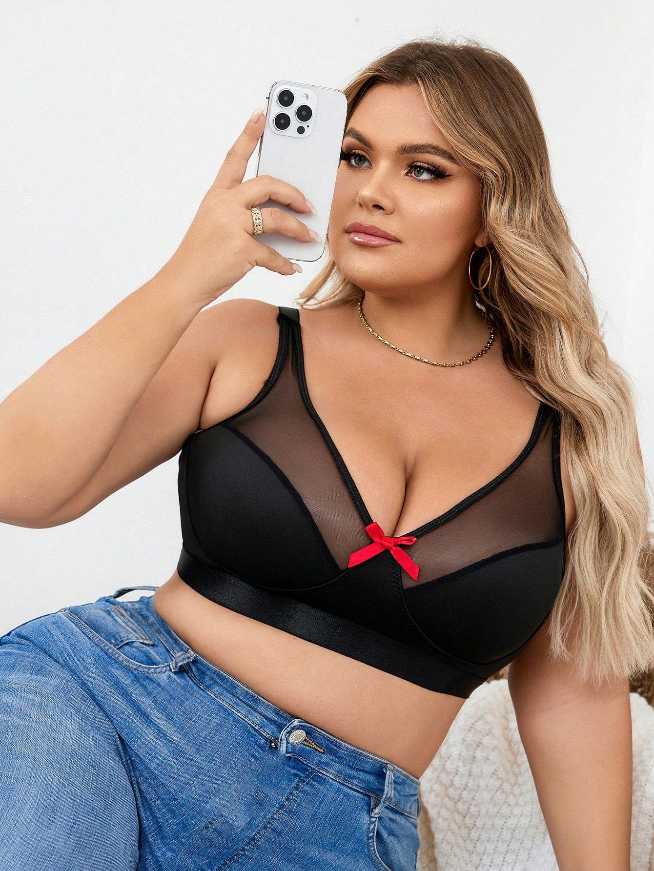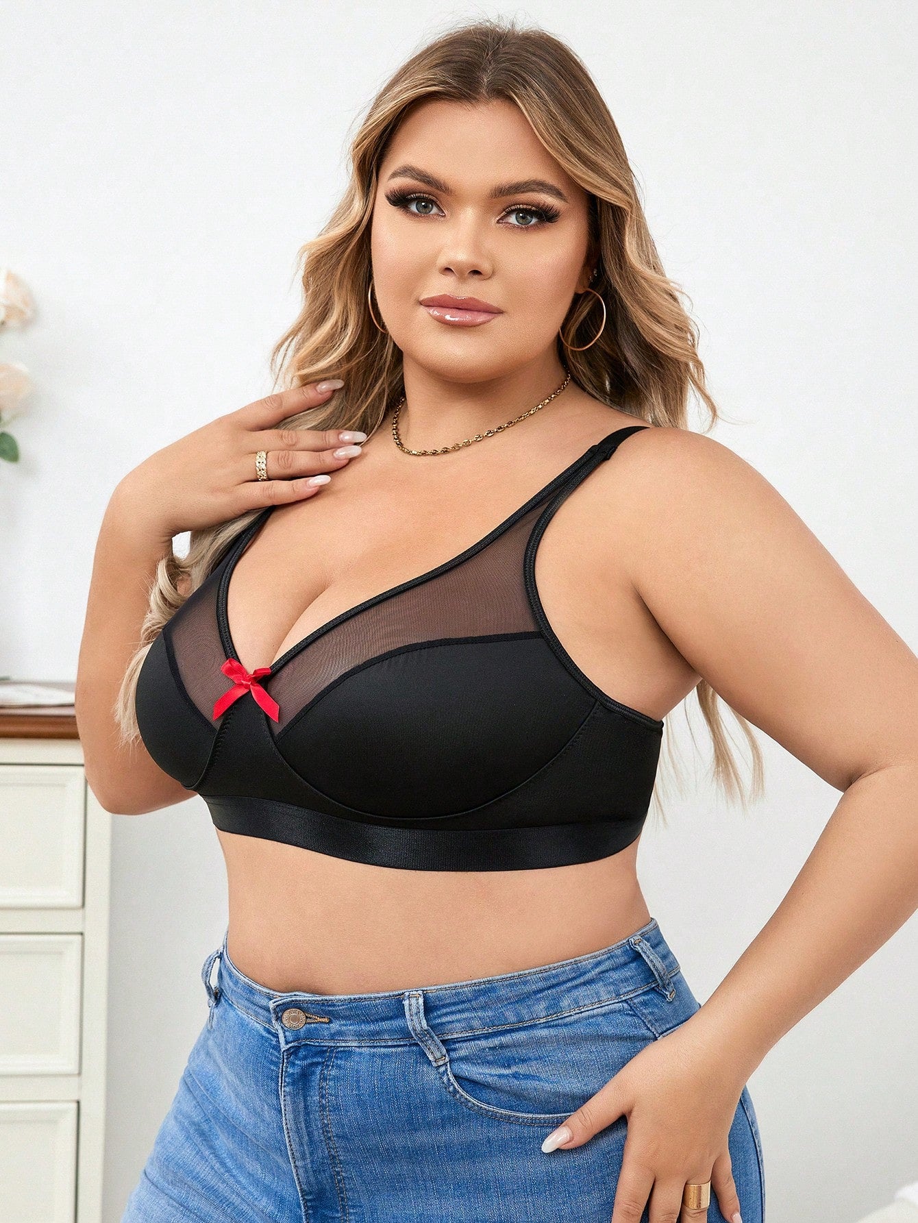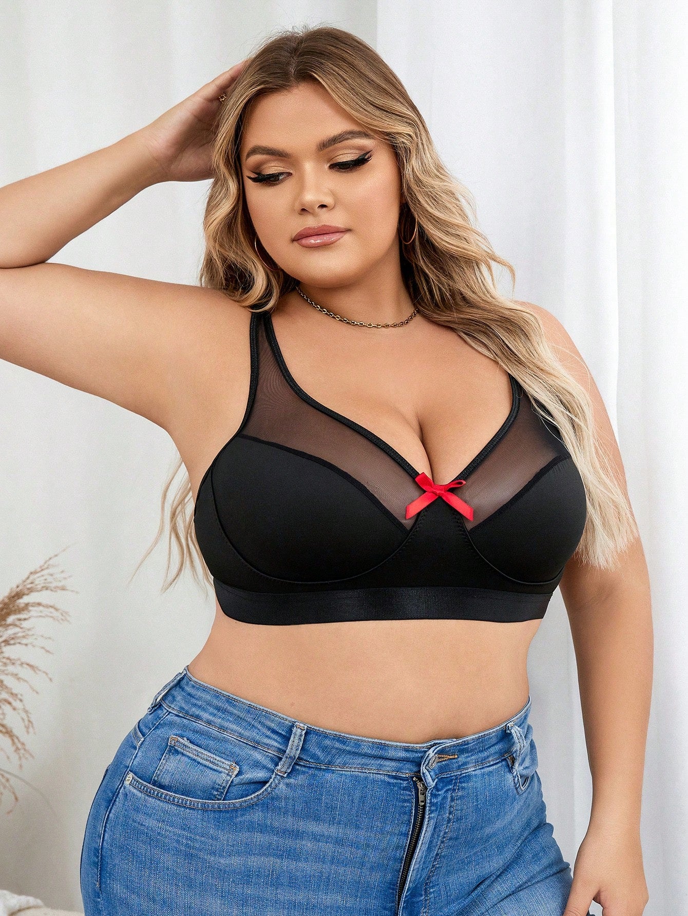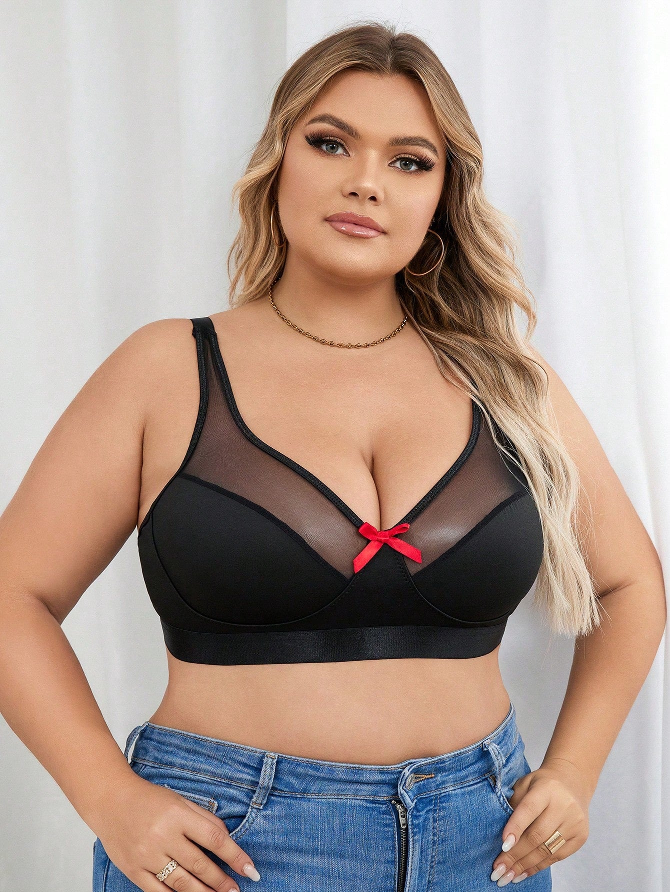 حمالة صدر من الحرير اللبني ذات مقاس زائد مع شبكة شفافة (قطعة واحدة)