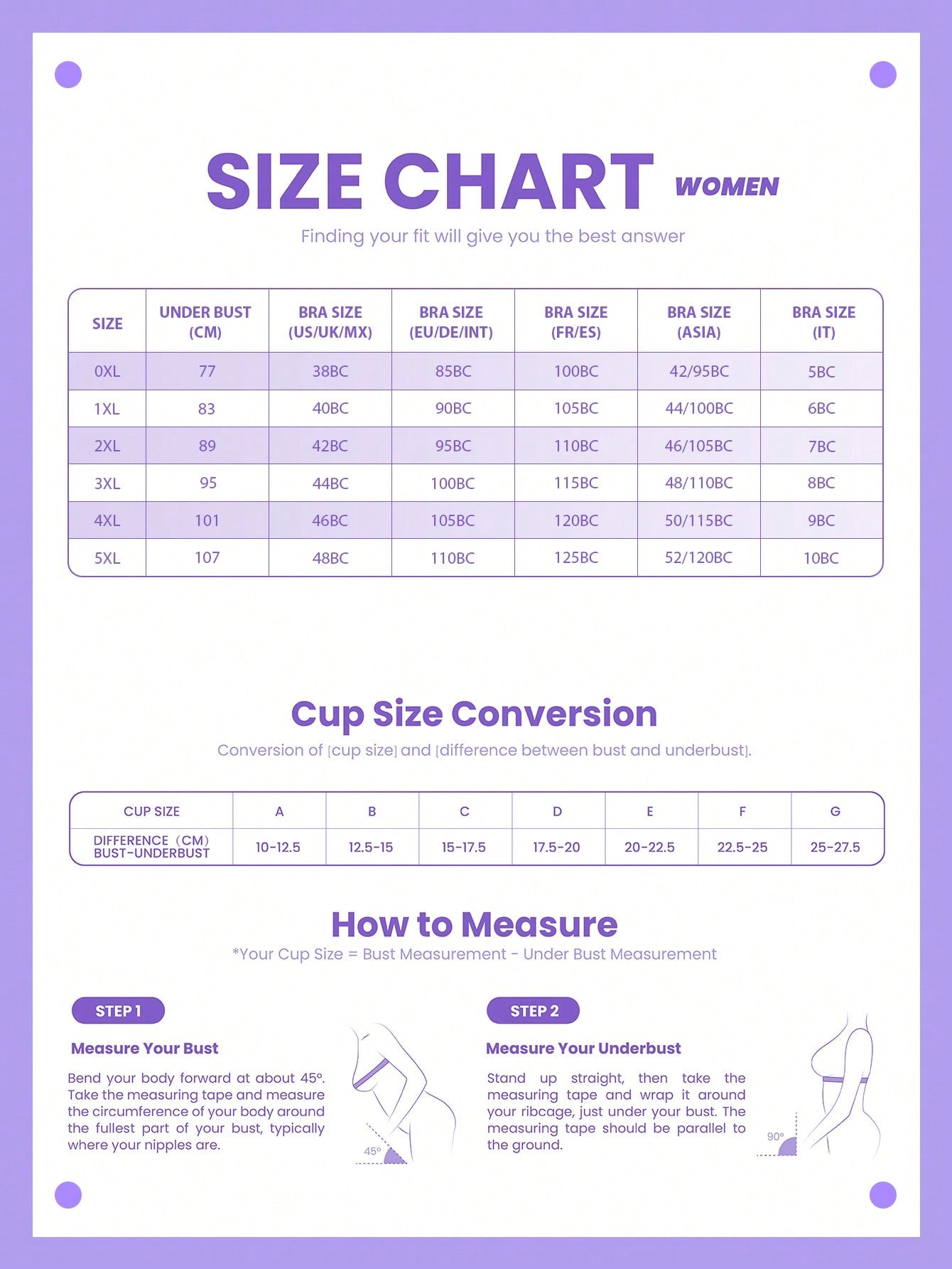 | 0XL | 36DD,36DDD,36G,38D,38DD,40C | 36DD,36E,36F,38D,38DD,40C | 80E,80F,80G,85D,85E,90C | 95E,95F,95G,100D,100E,105C | 80F,80G,85E,85F,90D | 3DD,3E,3F,4D,4DD,5C | 14DD,14E,14F,16D,16DD,18C | 44DD,44E,44F,46D,46DD,48C |