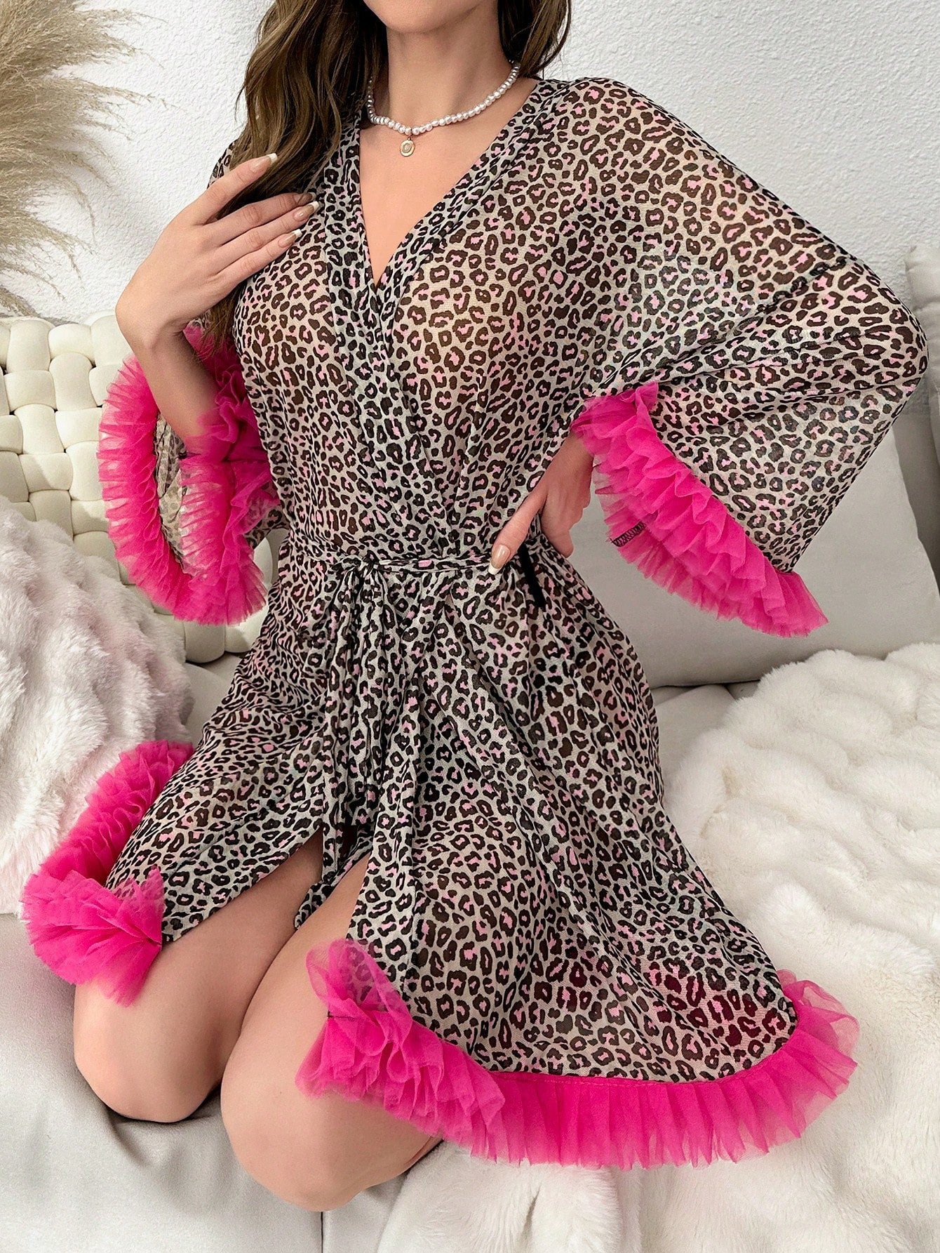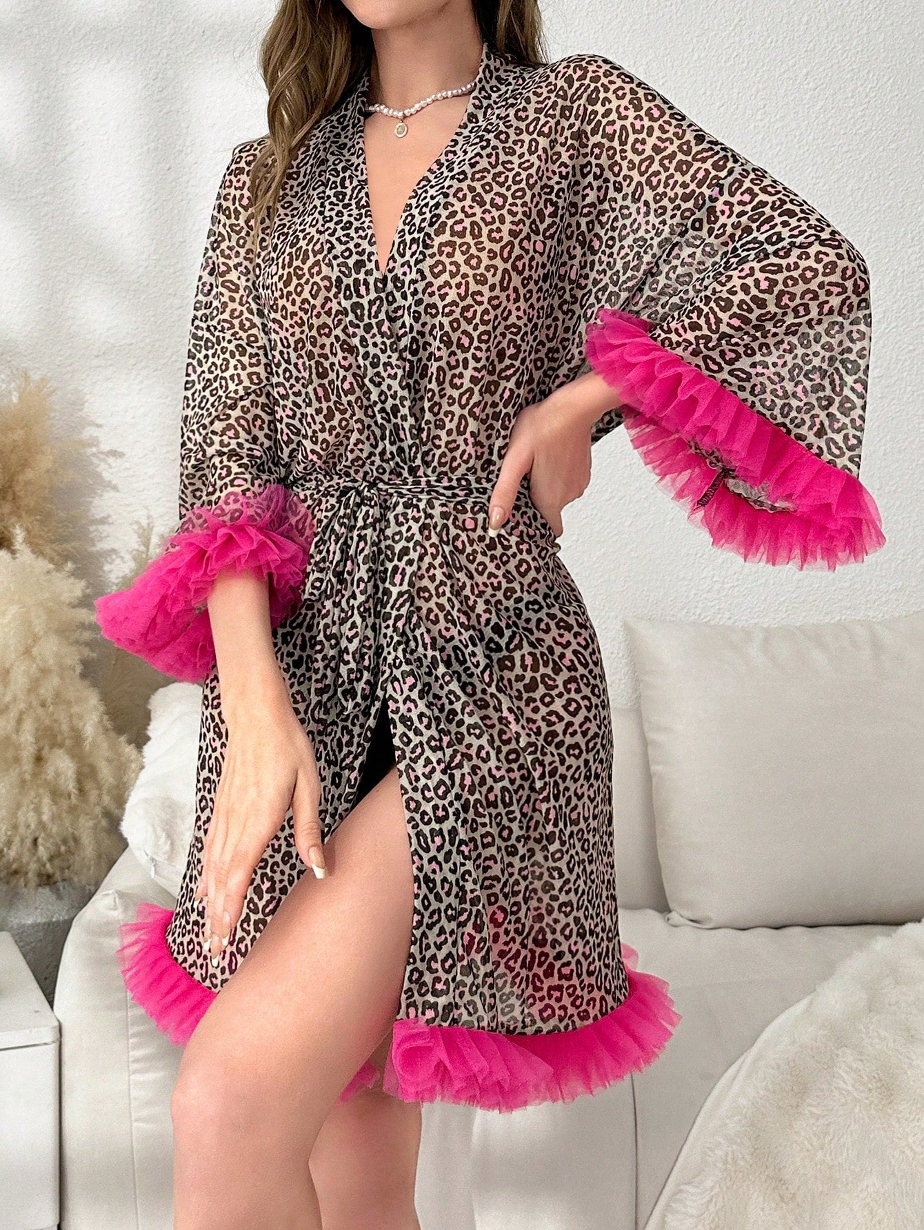 روب بحزام طباعة الفهد مقلم زغبي
