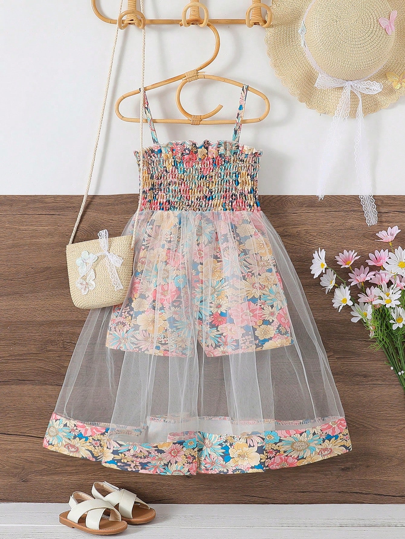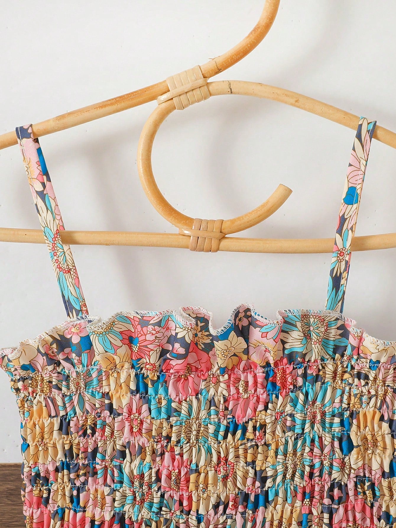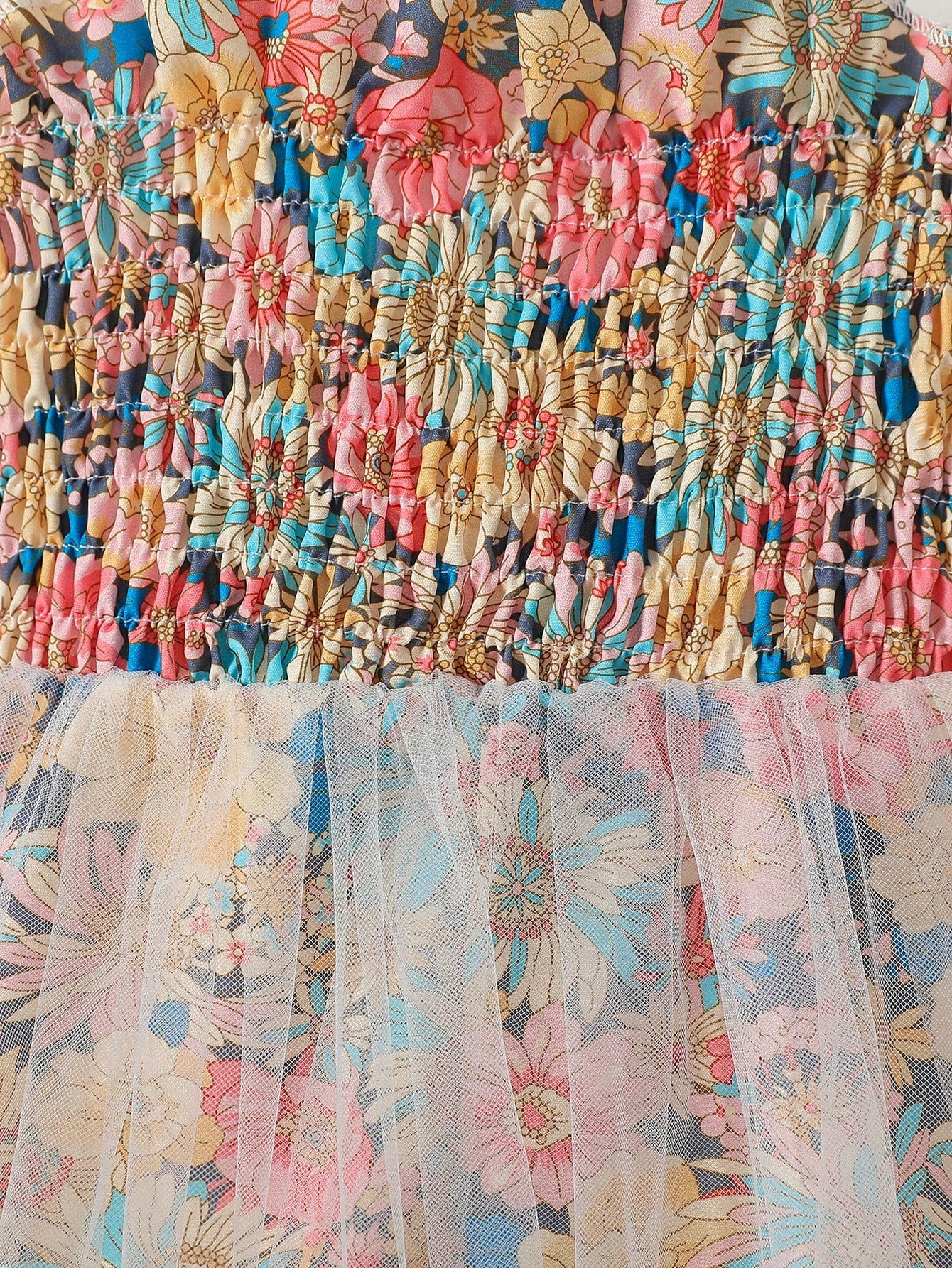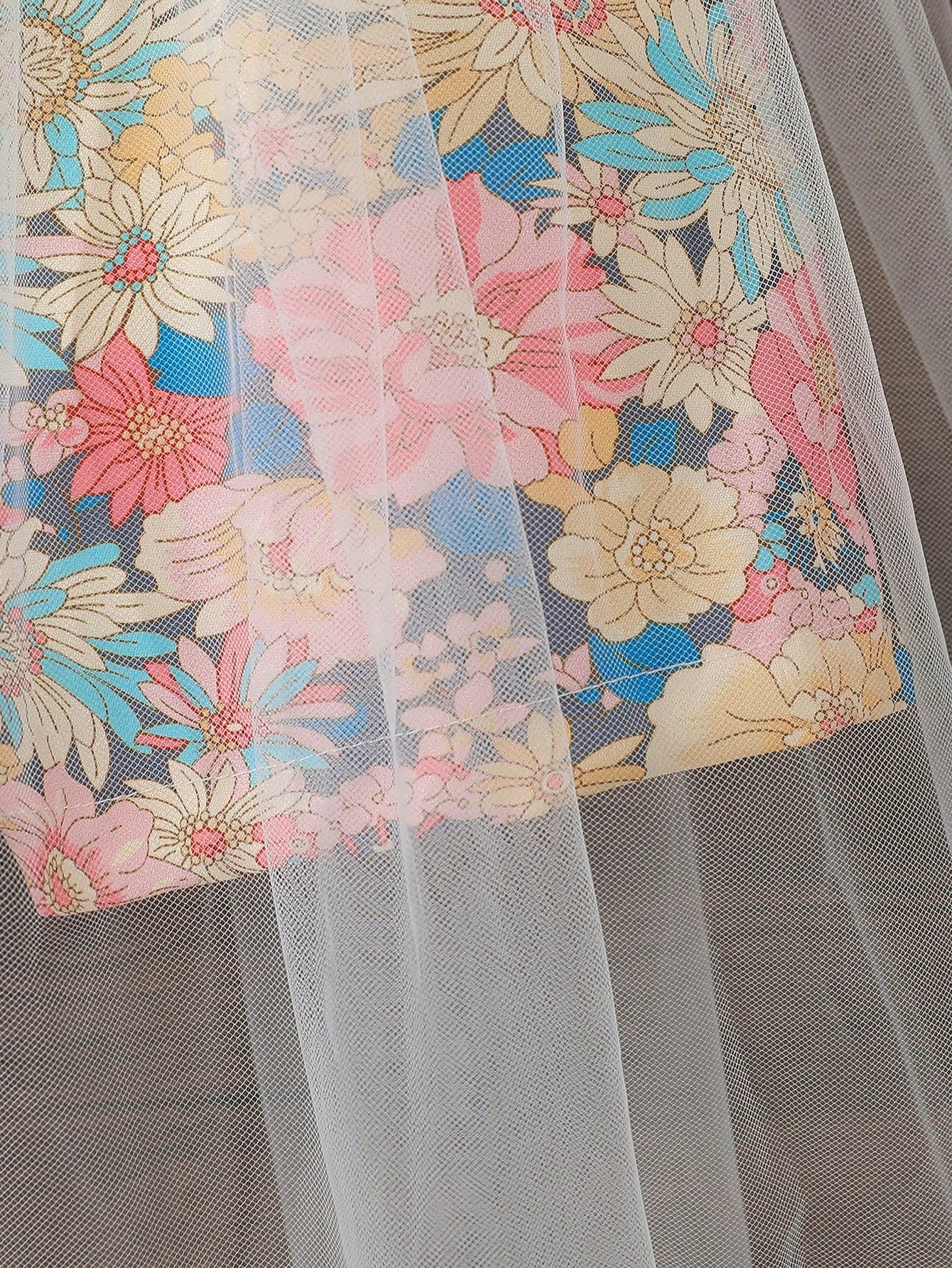 رومبر بطبعة زهور واسلوب فتاة صغيرة لإجازة على الشاطئ مع حافة من الشبكة مزينة بالريش ورقبة على شكل حرف V