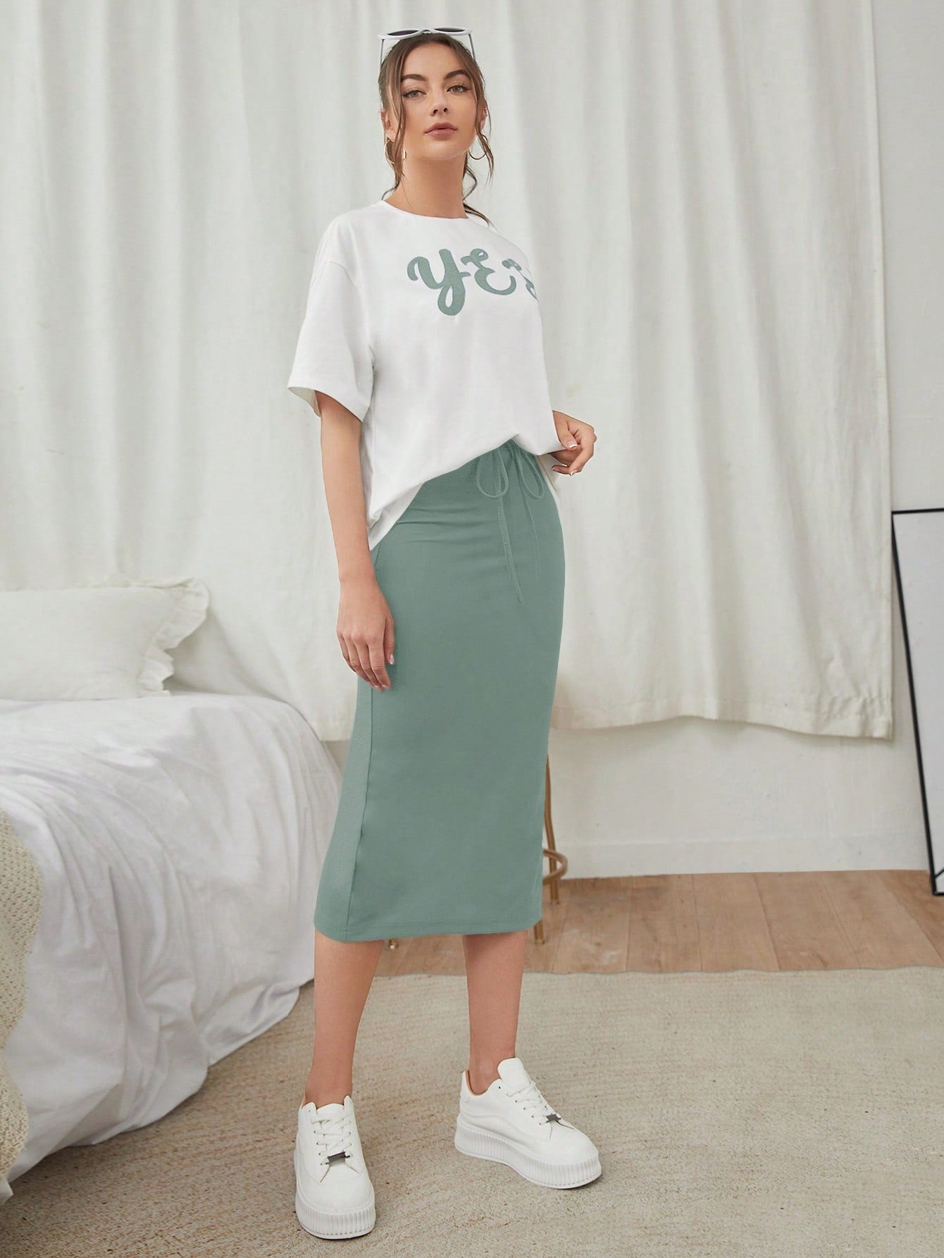 زي بتي شيرت نسائي يتكون من تيشيرت بياقة دائرية مطبوع عليها حرف وتنورة بربطة عند الخصر عدد 2