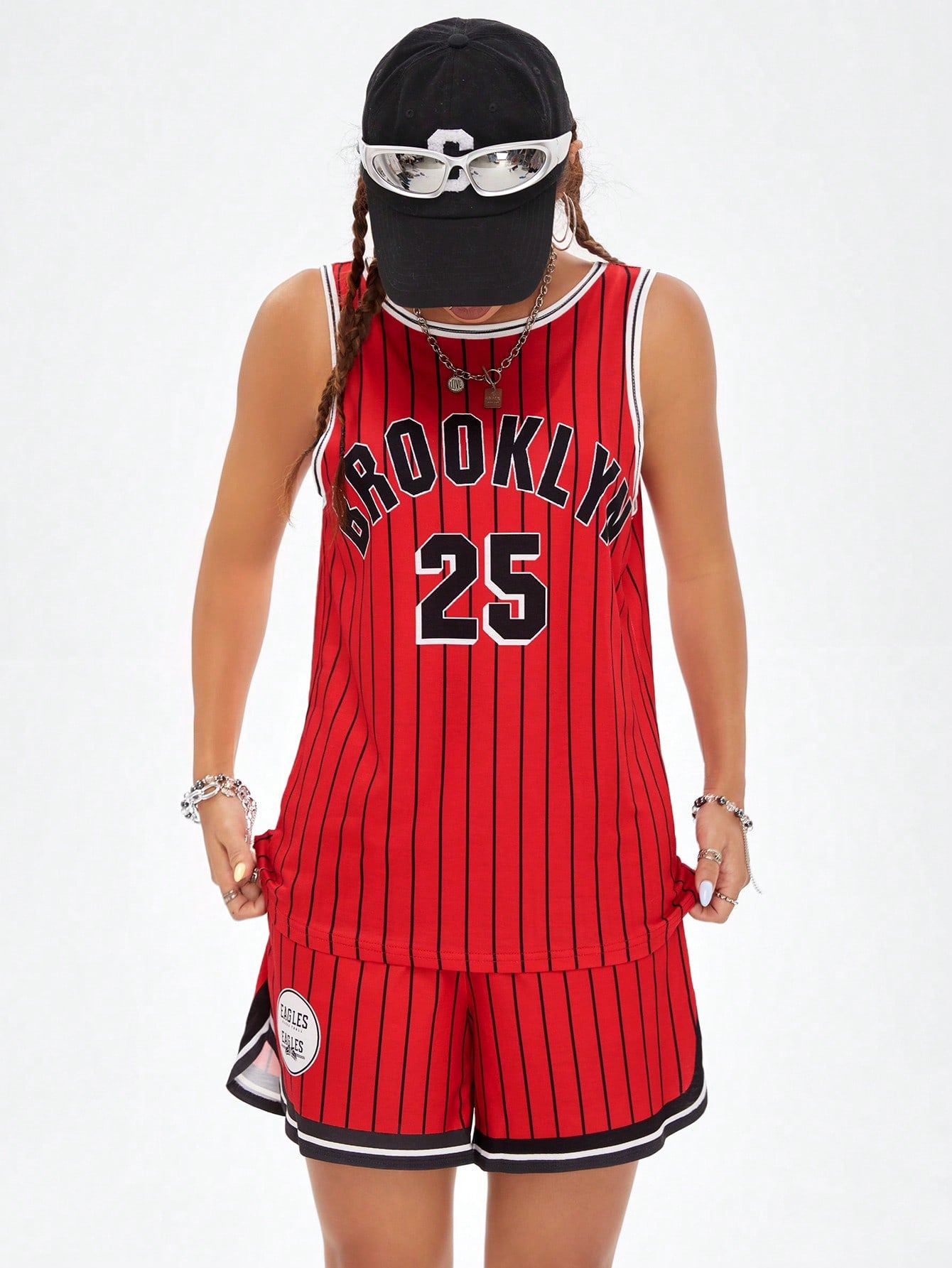 زي رياضي للسيدات عبارة عن قطعتين: قميص بطبعة خطوط رياضية