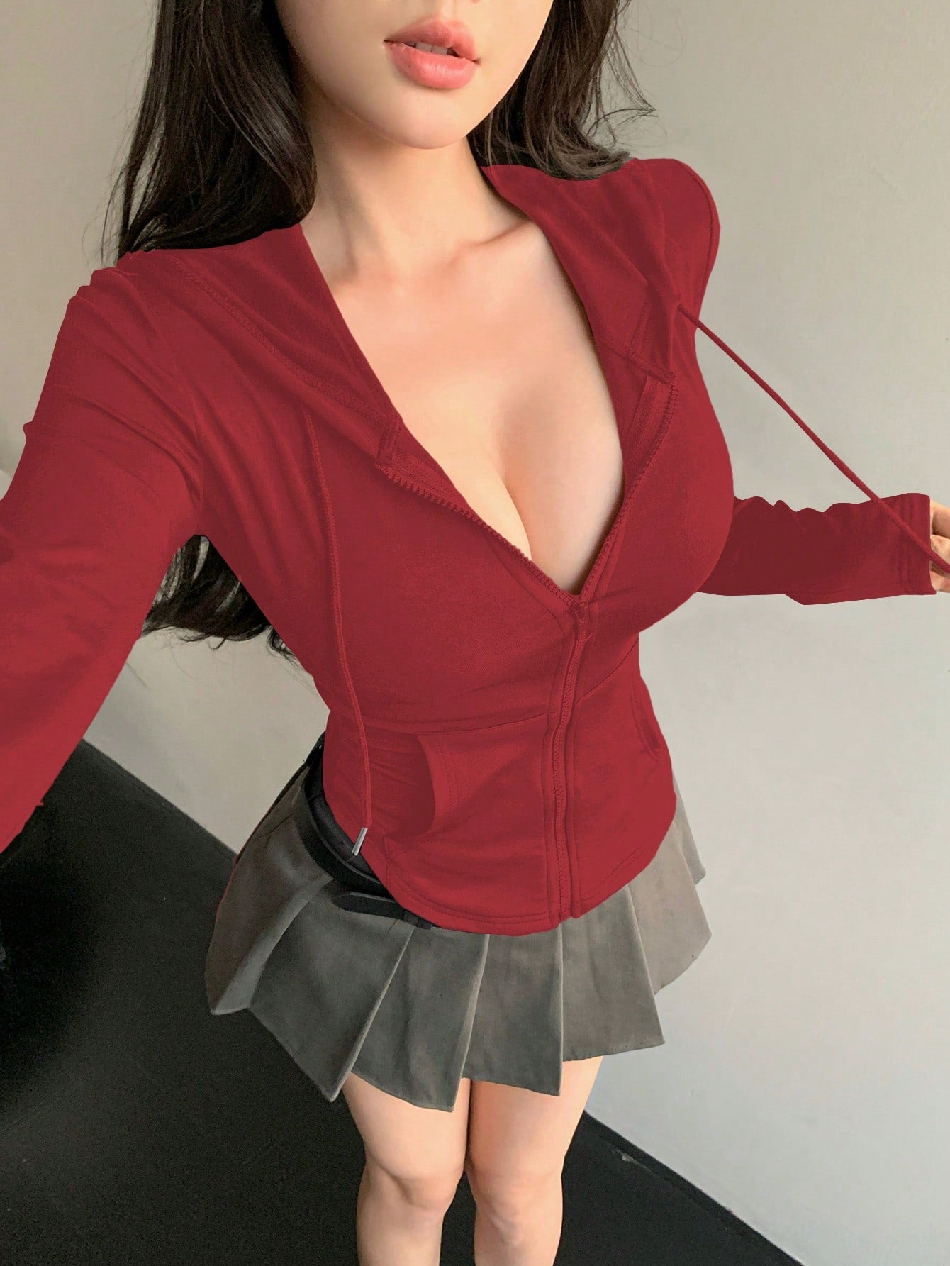 سترة نسائية بغطاء رأس وطول قصير وخصر برباط وإغلاق بسحاب وجيب