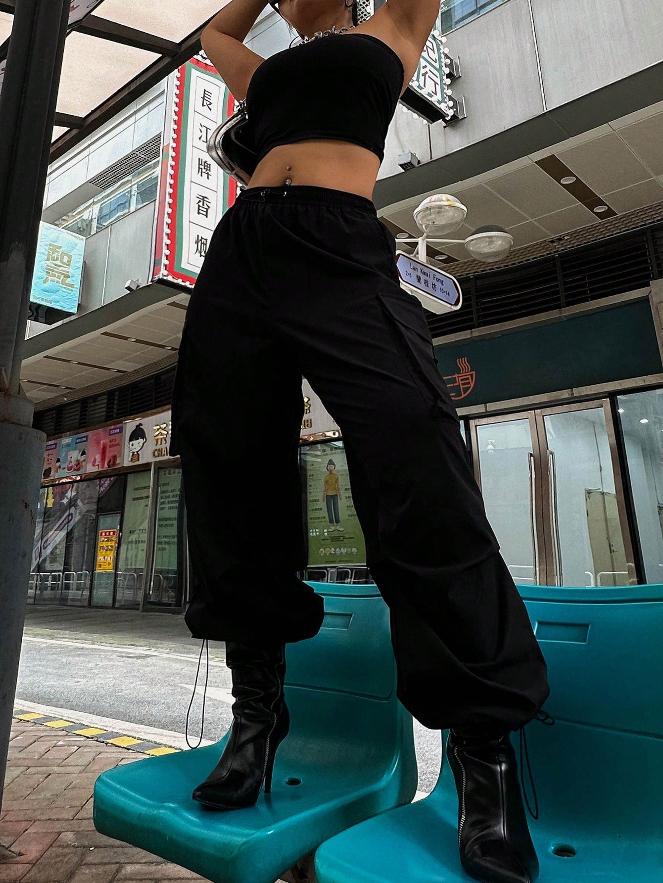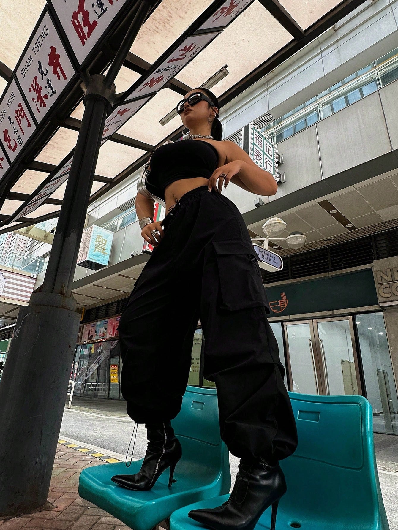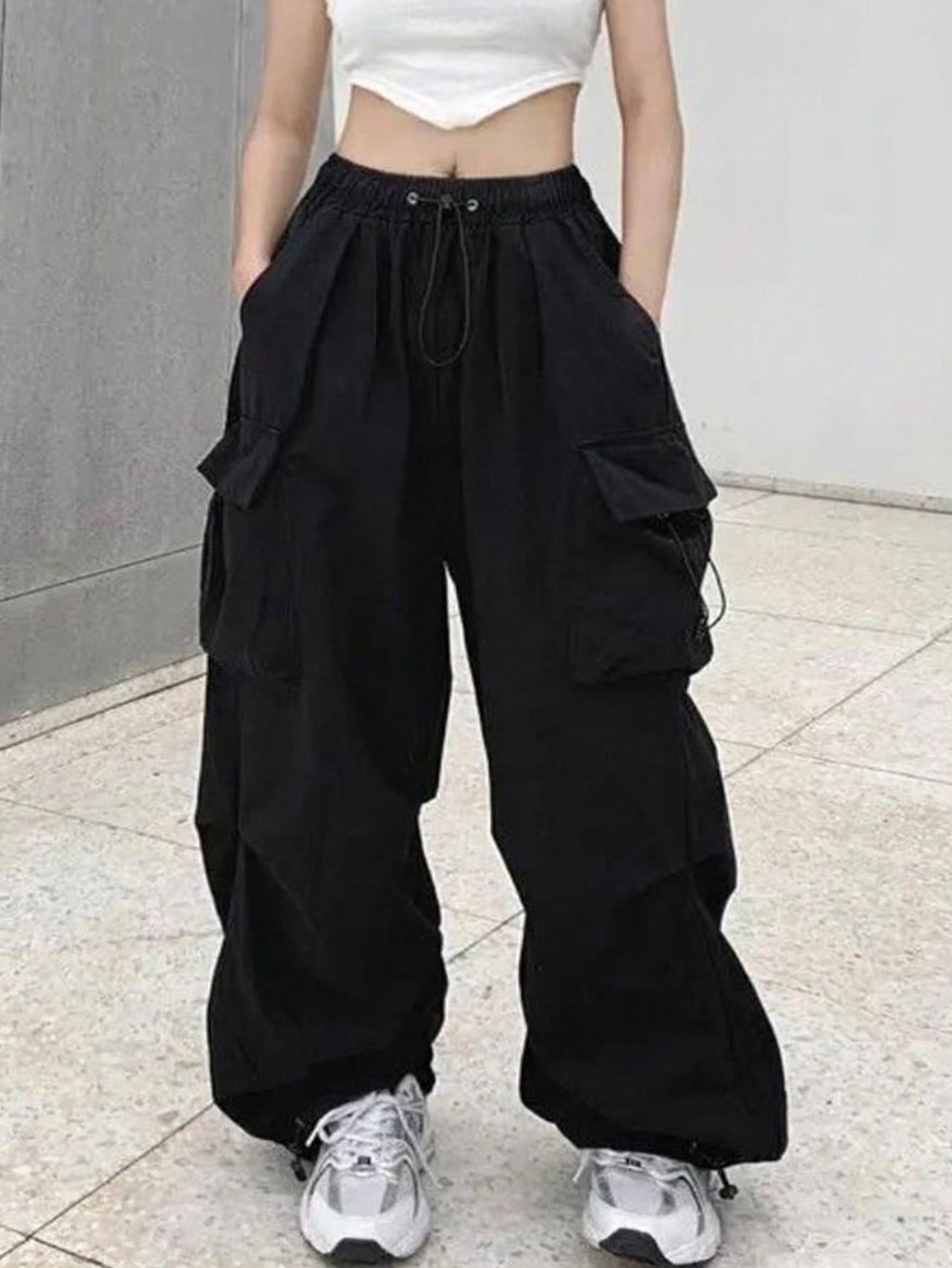 سراويل شحن سوداء فضفاضة متحررة مع جيوب كبيرة الحجم للاستخدام اليومي العادي