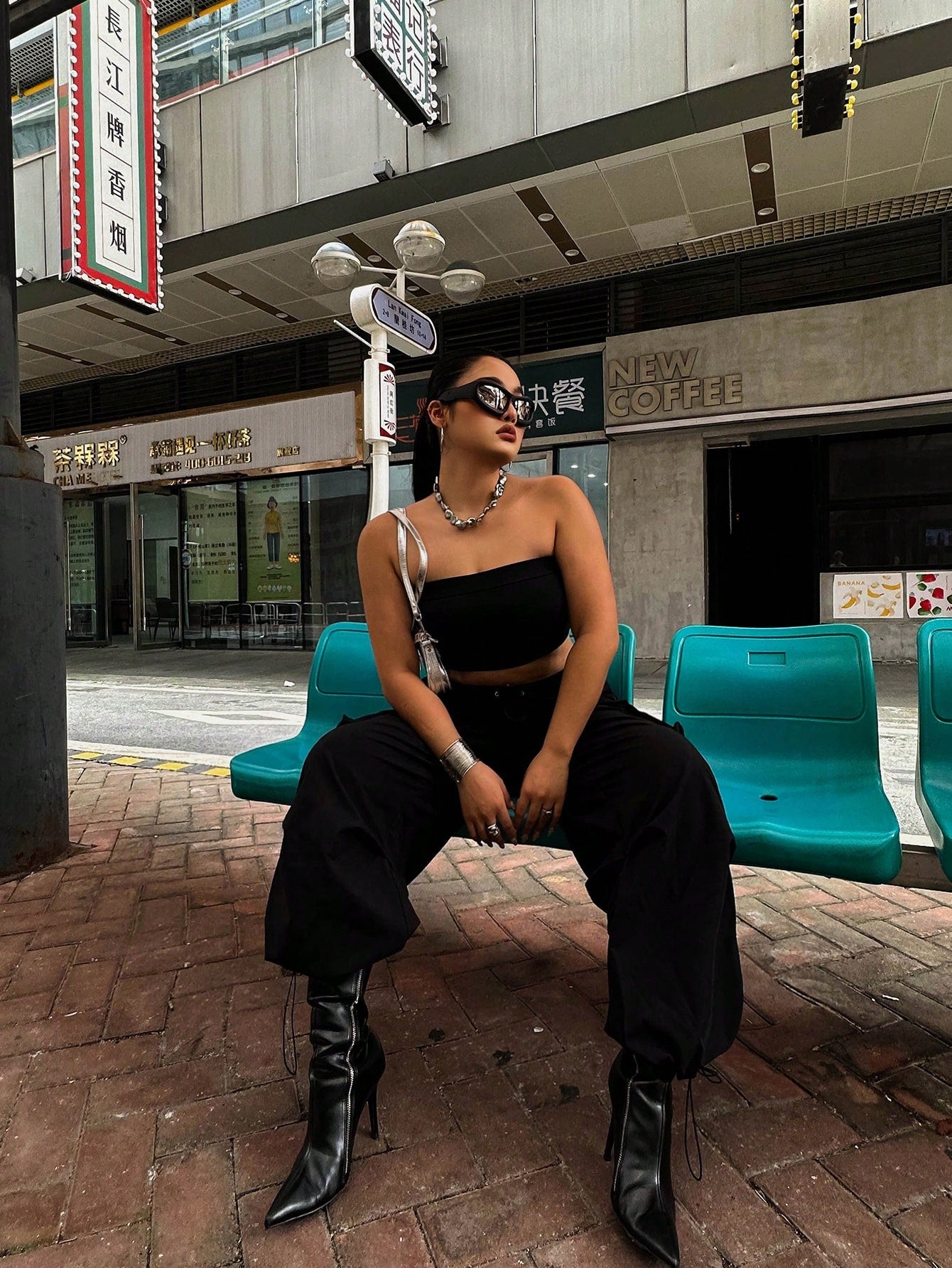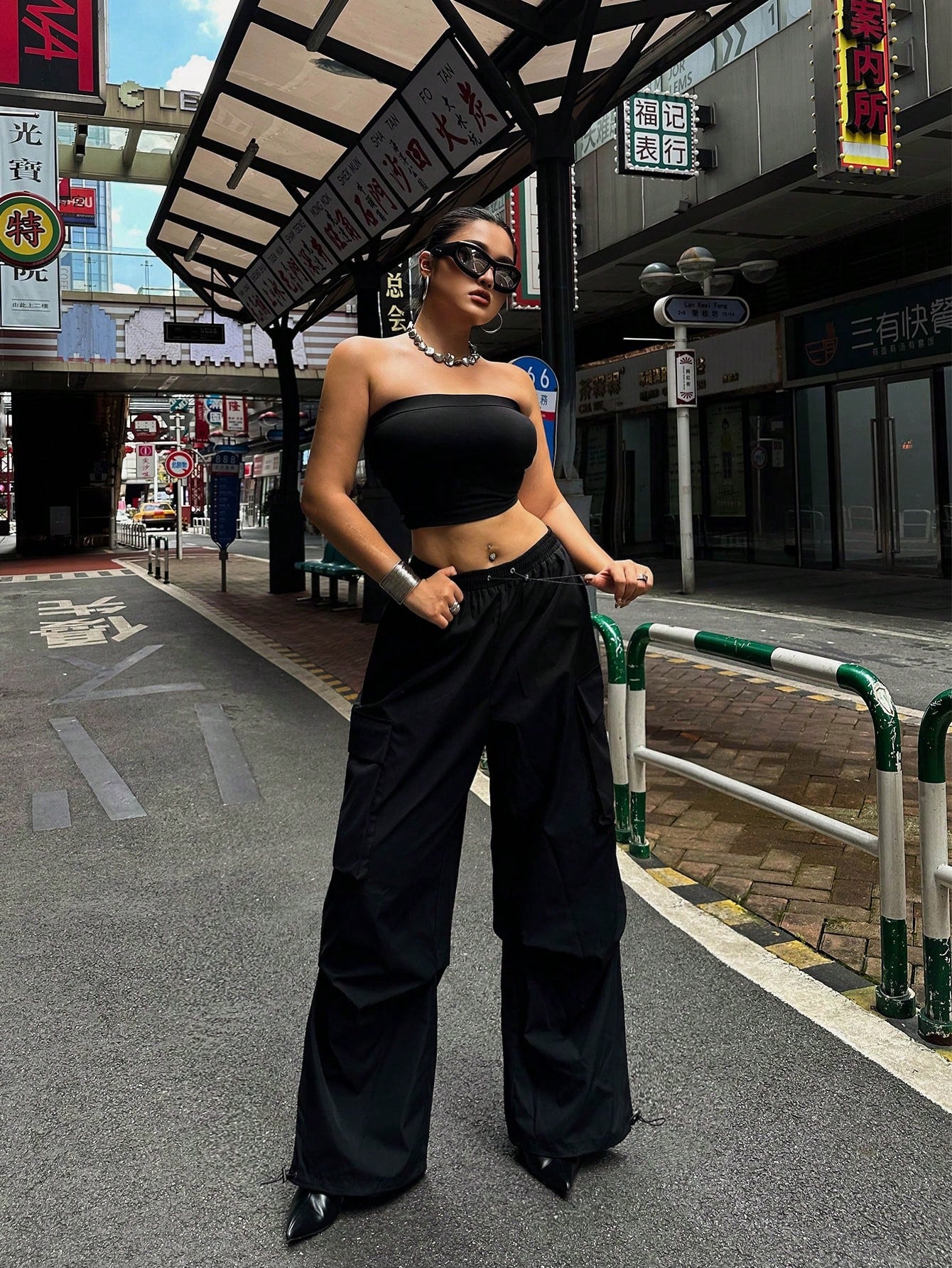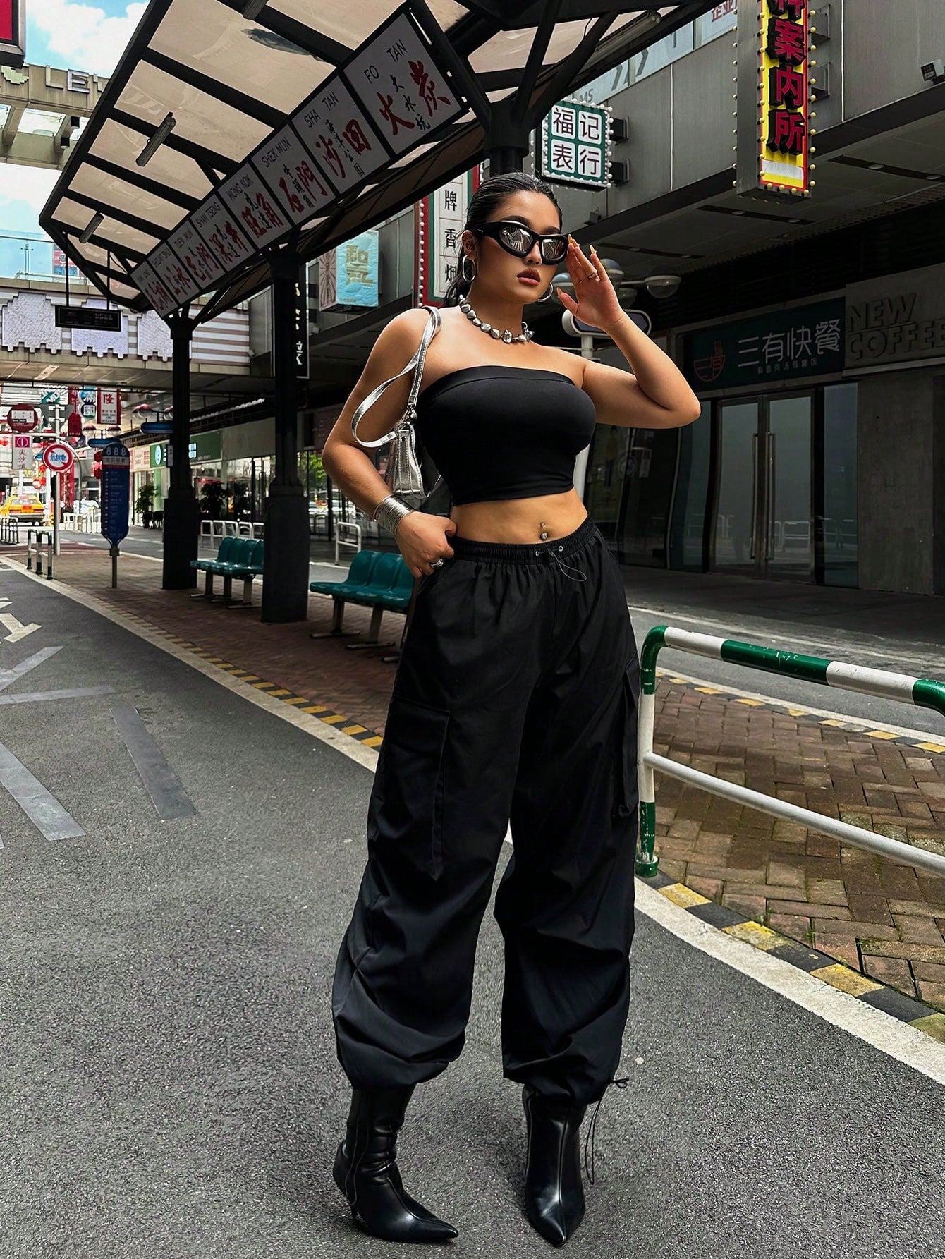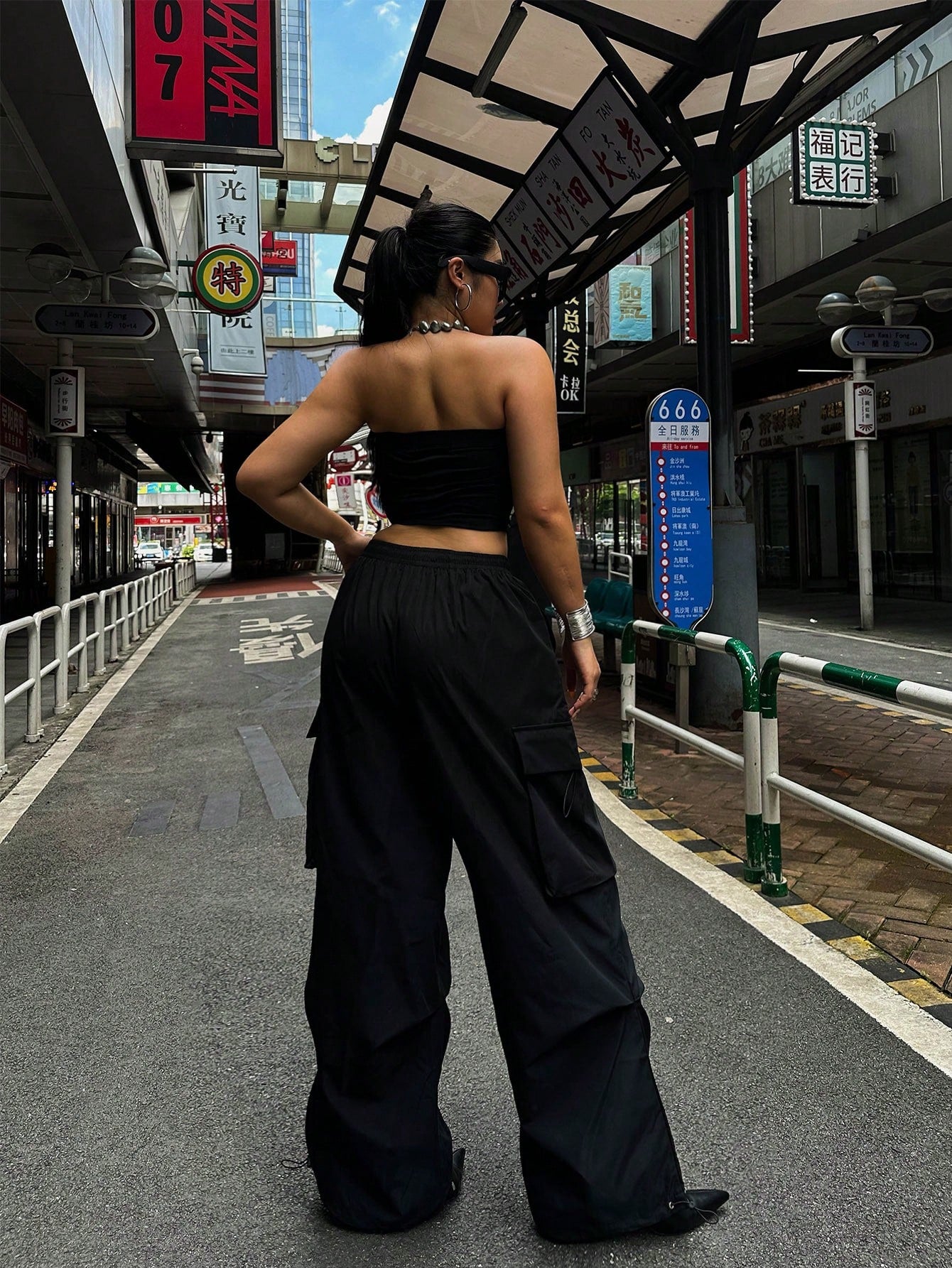سراويل شحن سوداء فضفاضة متحررة مع جيوب كبيرة الحجم للاستخدام اليومي العادي