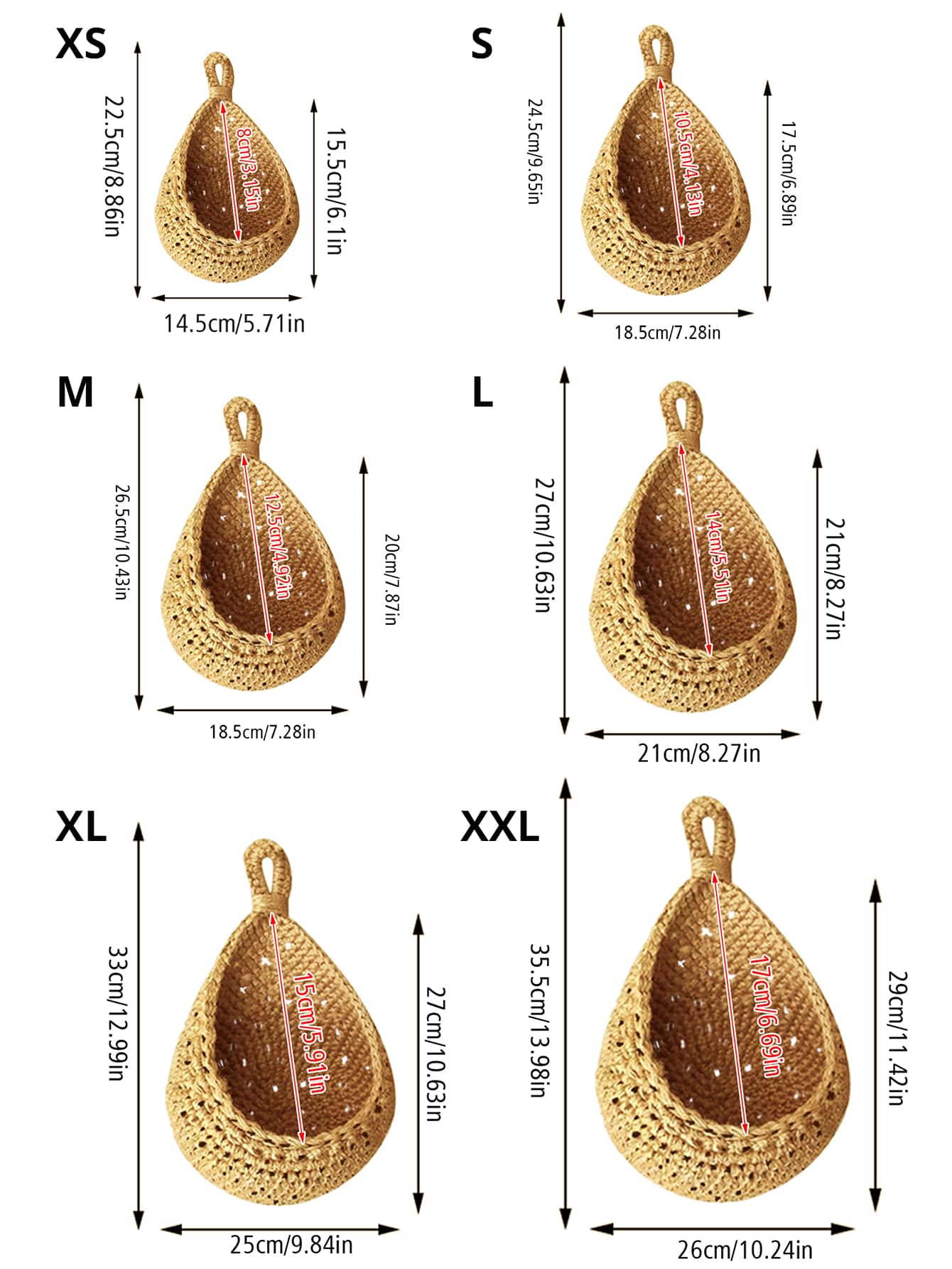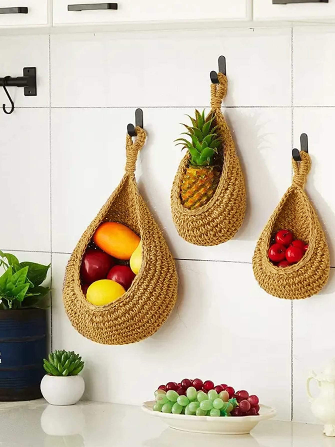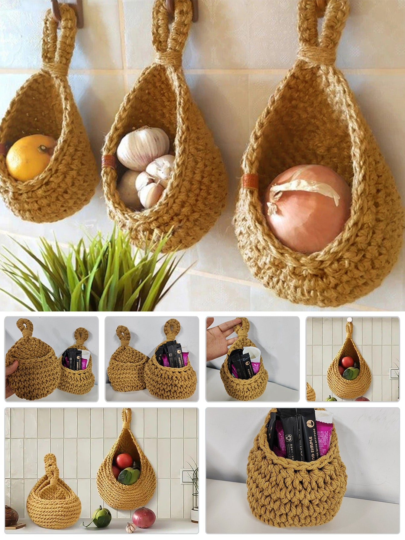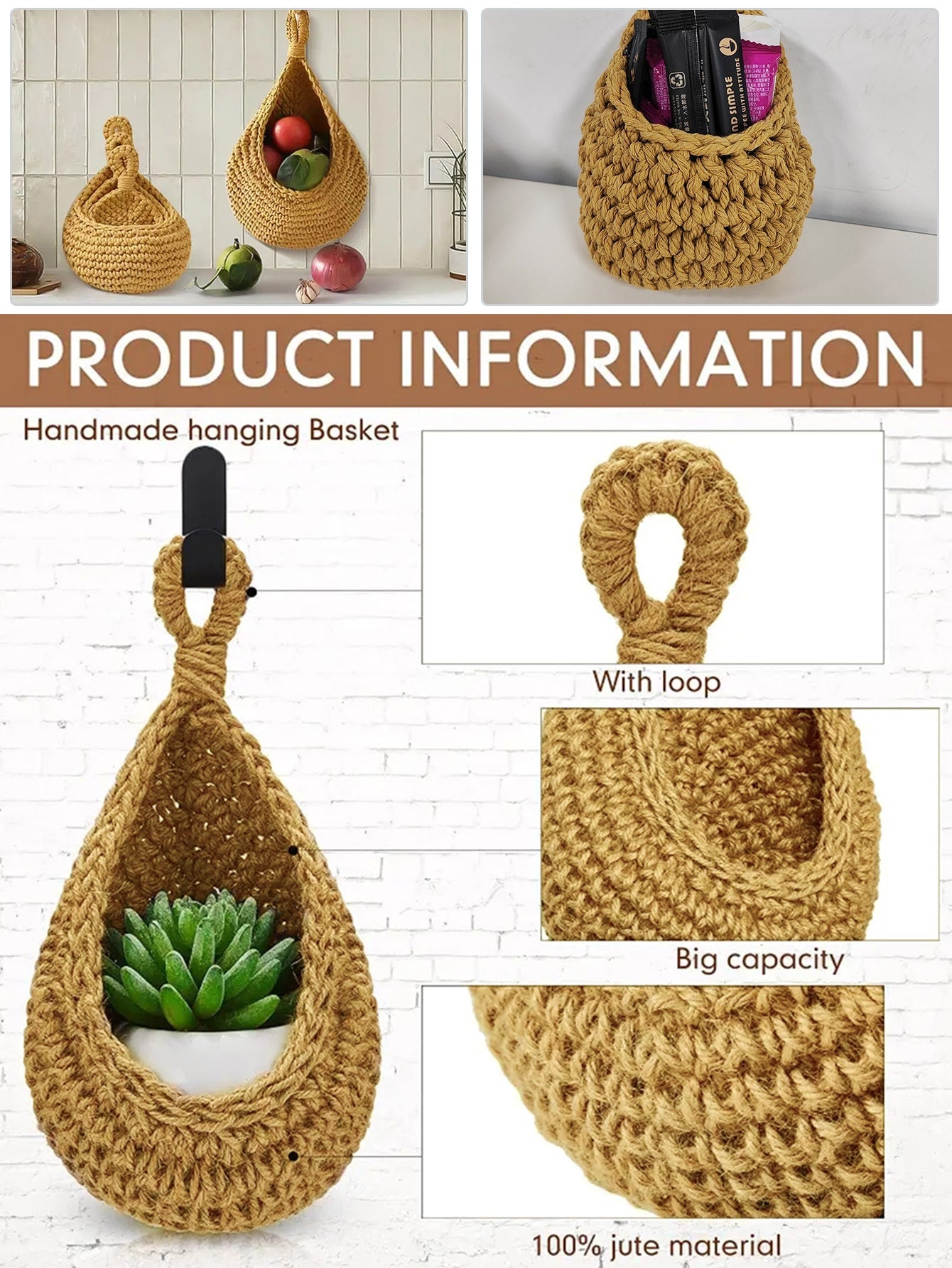 سلة معلقة جدران مضفرة على الطراز البوهيمي، سلة يدوية مضفرة للخضروات والفواكه في المطبخ لديكور بوهو في شكل دمعة للتخزين وزراعة النباتات وتنظيم الحاويات