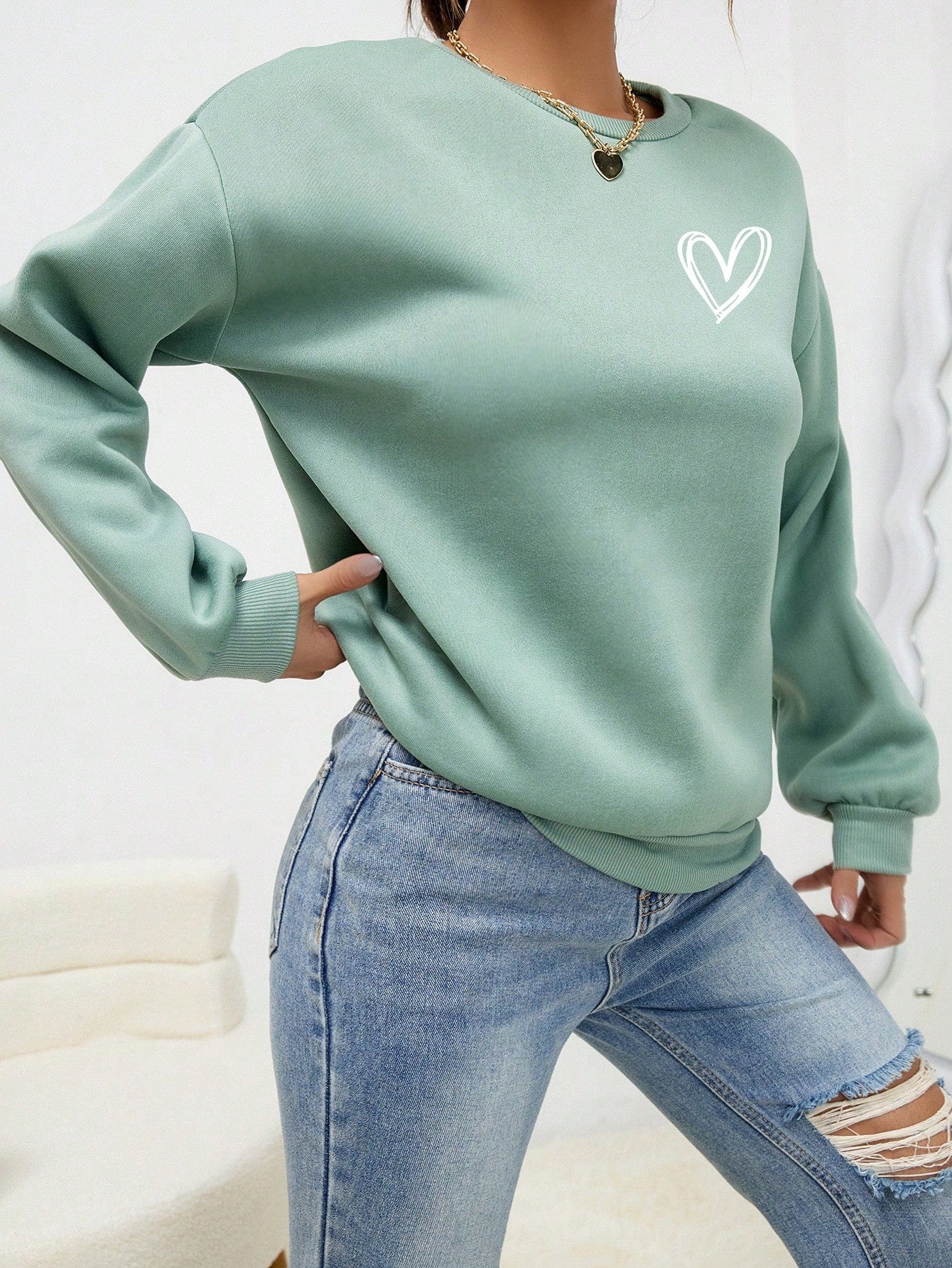 سويت شيرت بظهر قصير مطبوع بالقلوب ، نساء الربيع/الخريف كاجوال أكمام طويلة ياقة دائرية فضفاضة منتظمة كتف منخفض بلوفر أخضر فضفاض هوديس نسائية