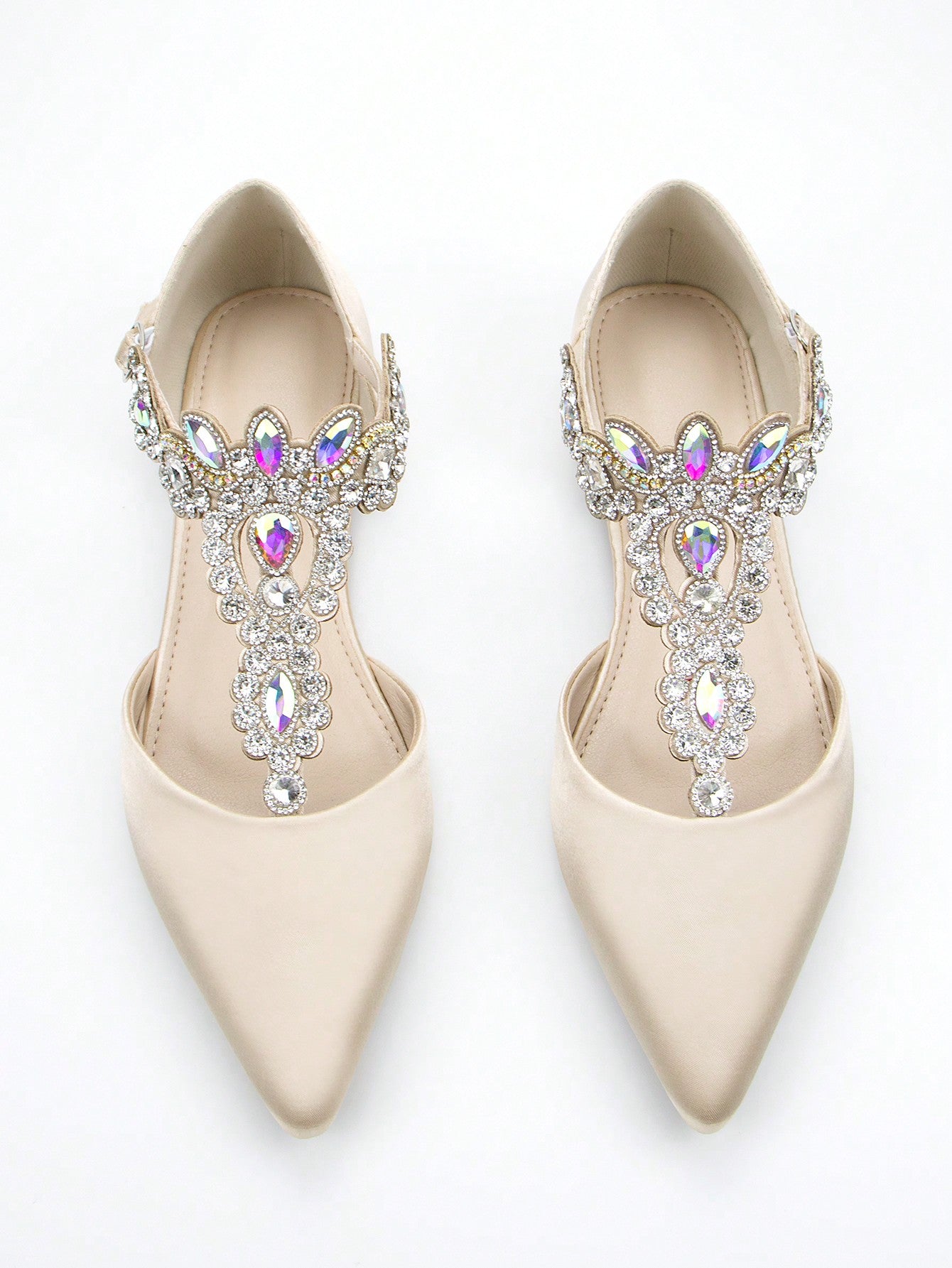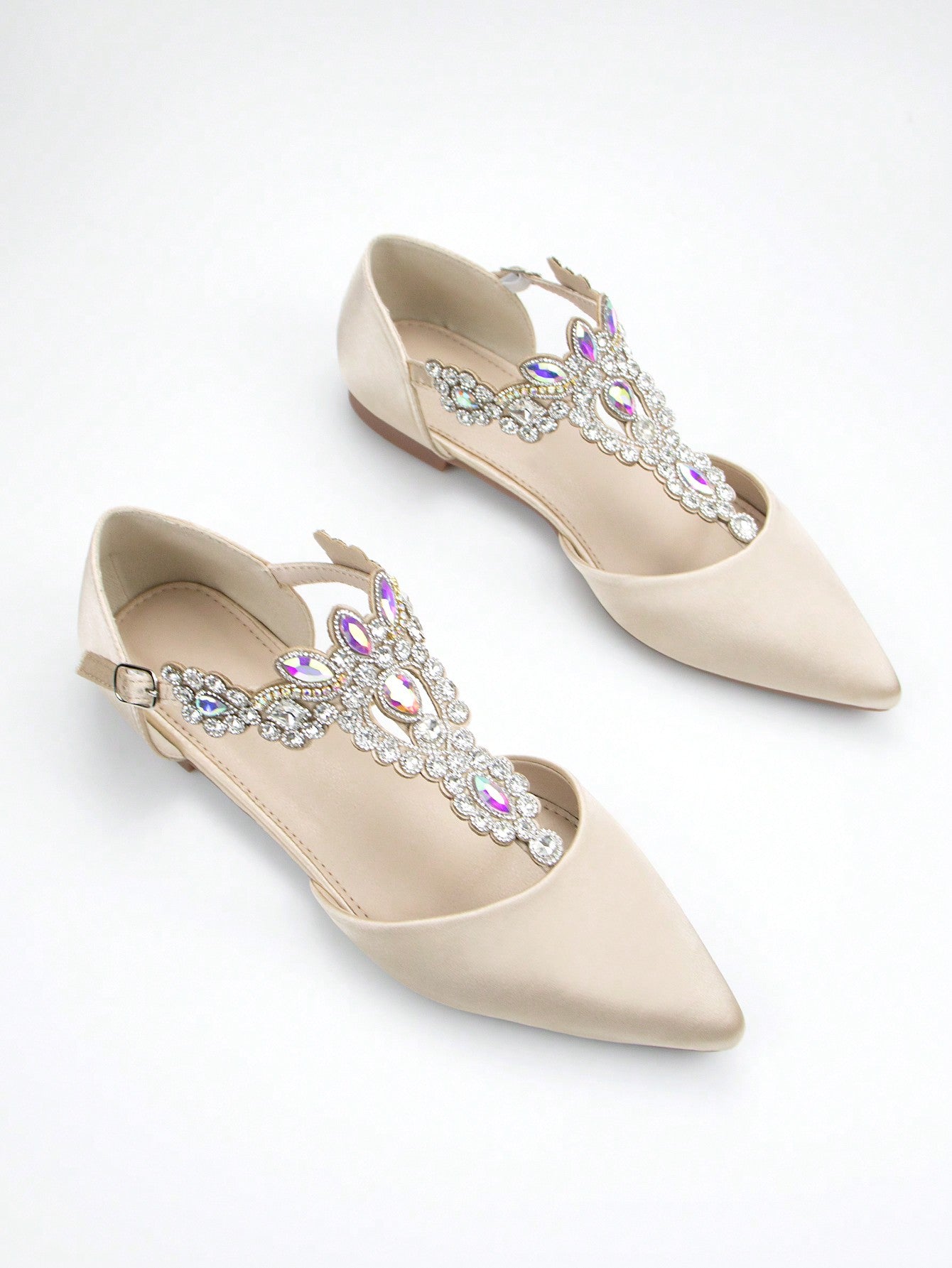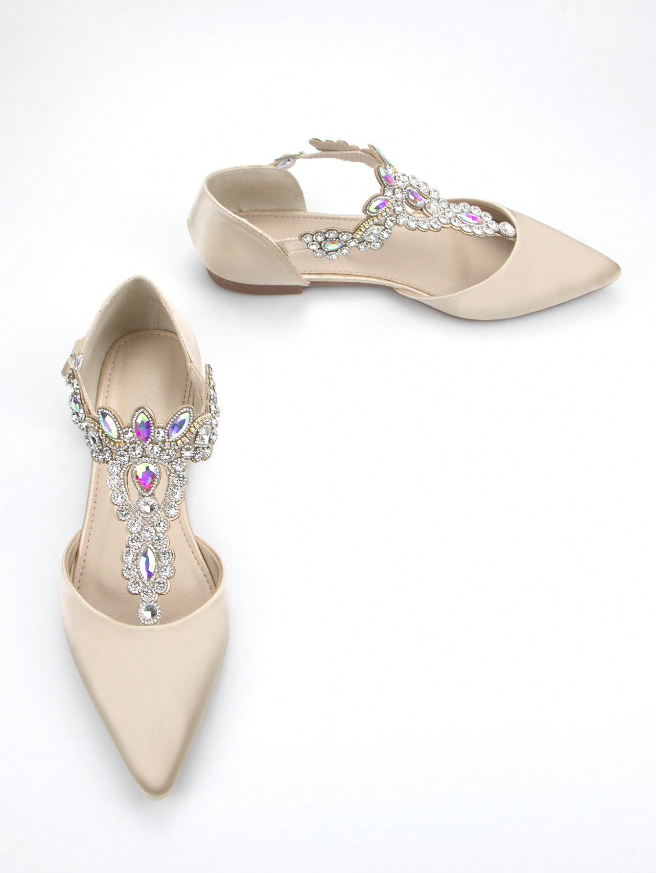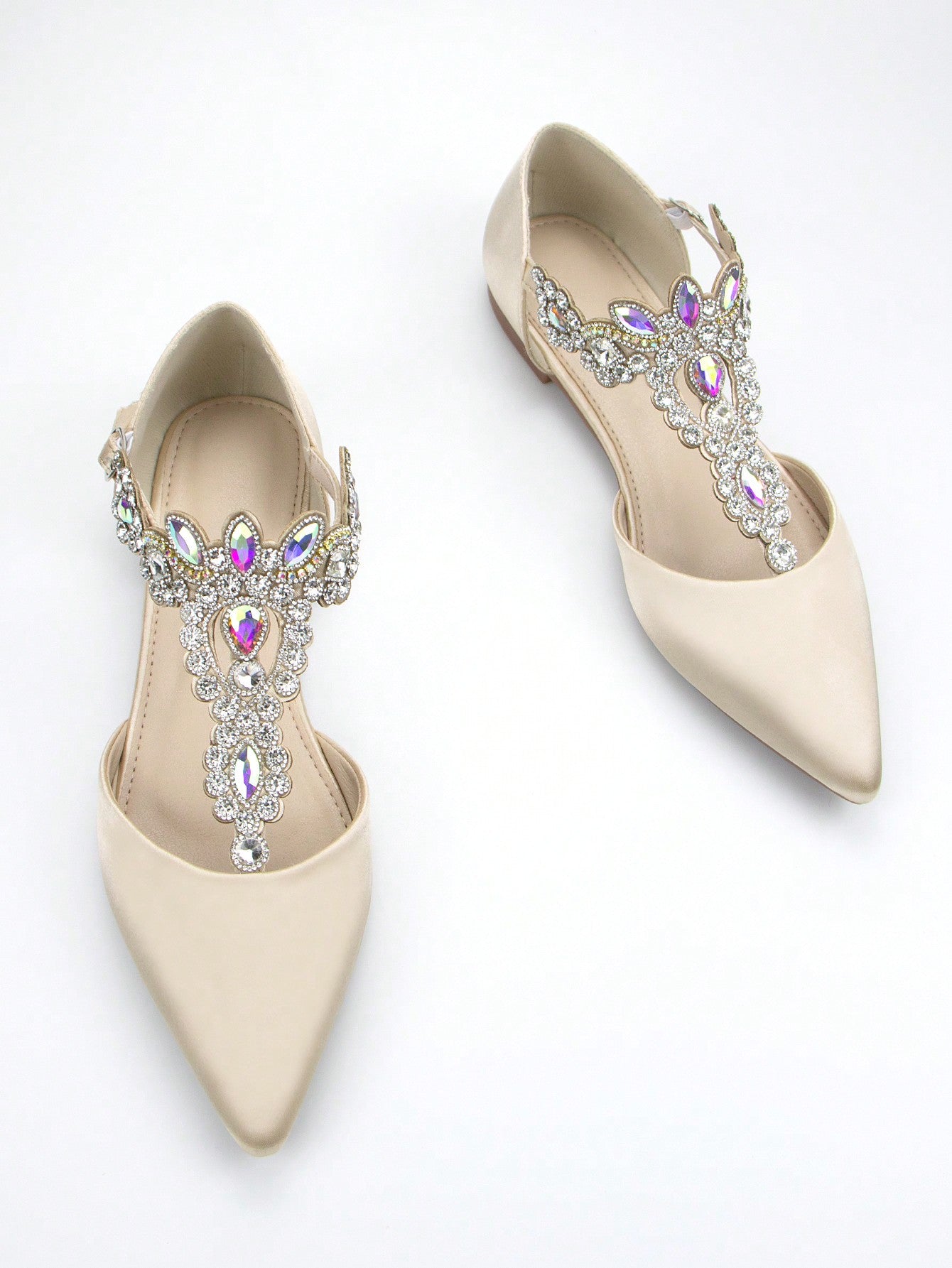 شقة نسائية بمقدمة حذاء مدببة وحزام كاحل بزينة من الراين و قماش ساتان ذهبي ضحل للارتداء اليومي والاحتفالي