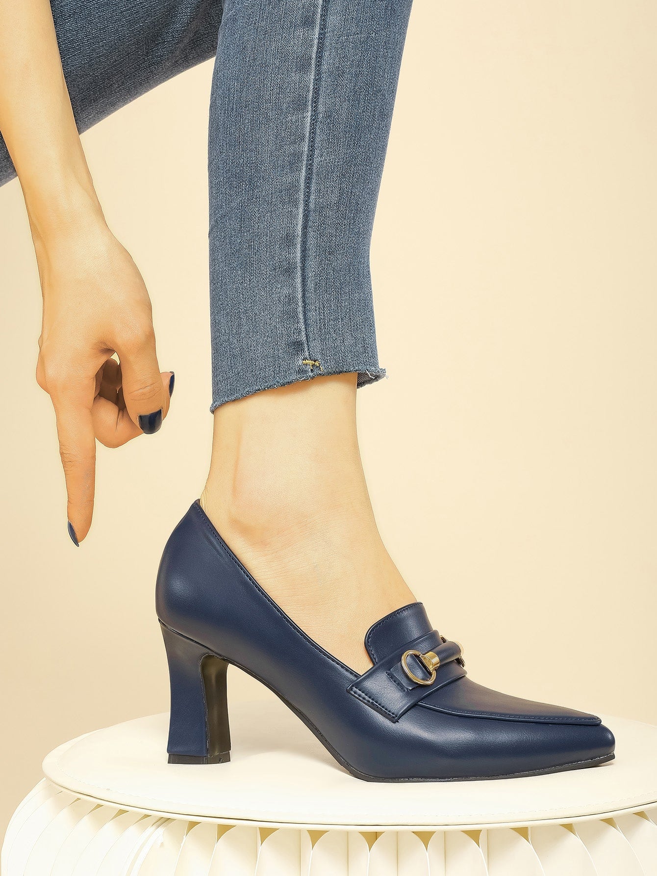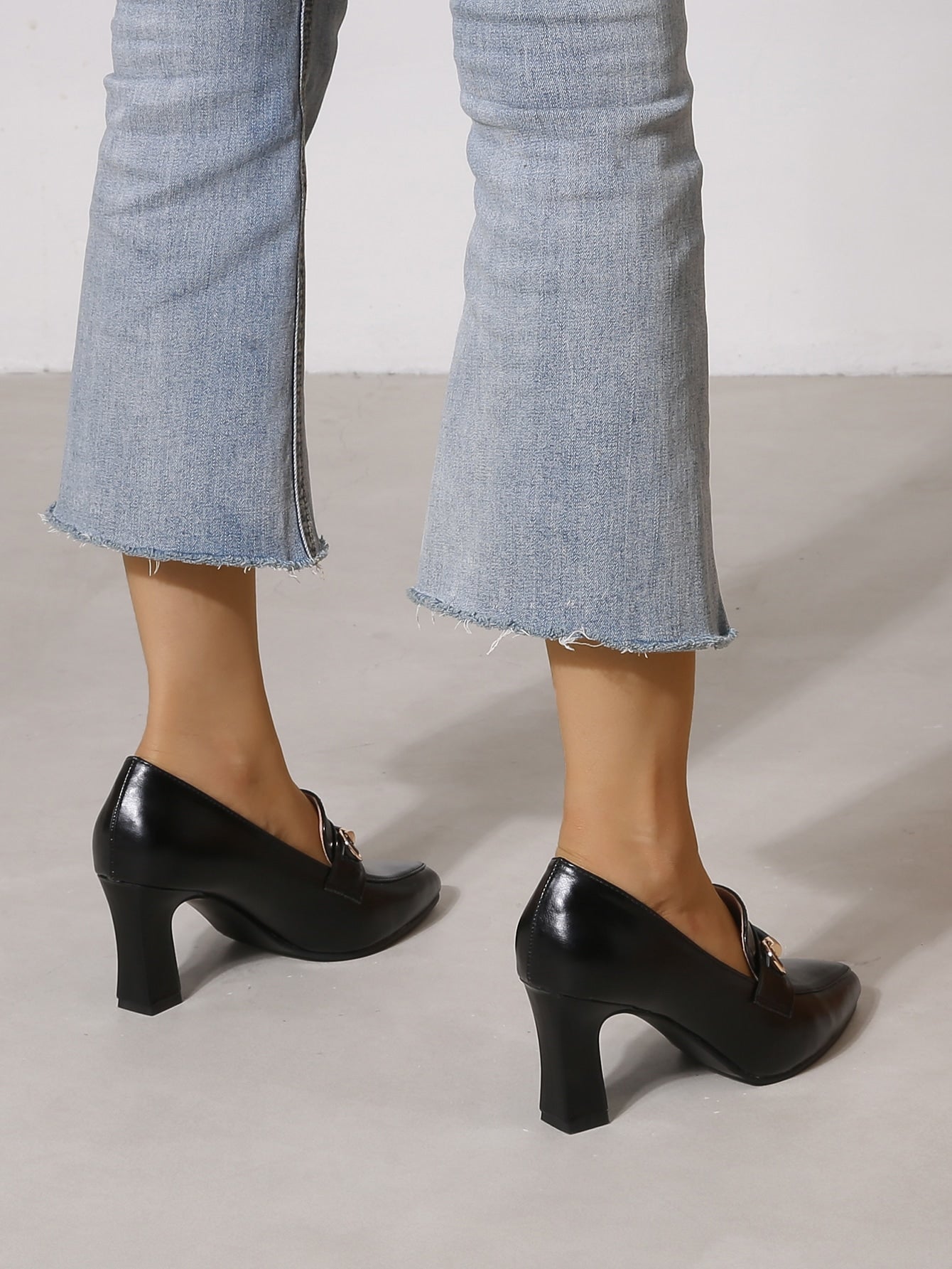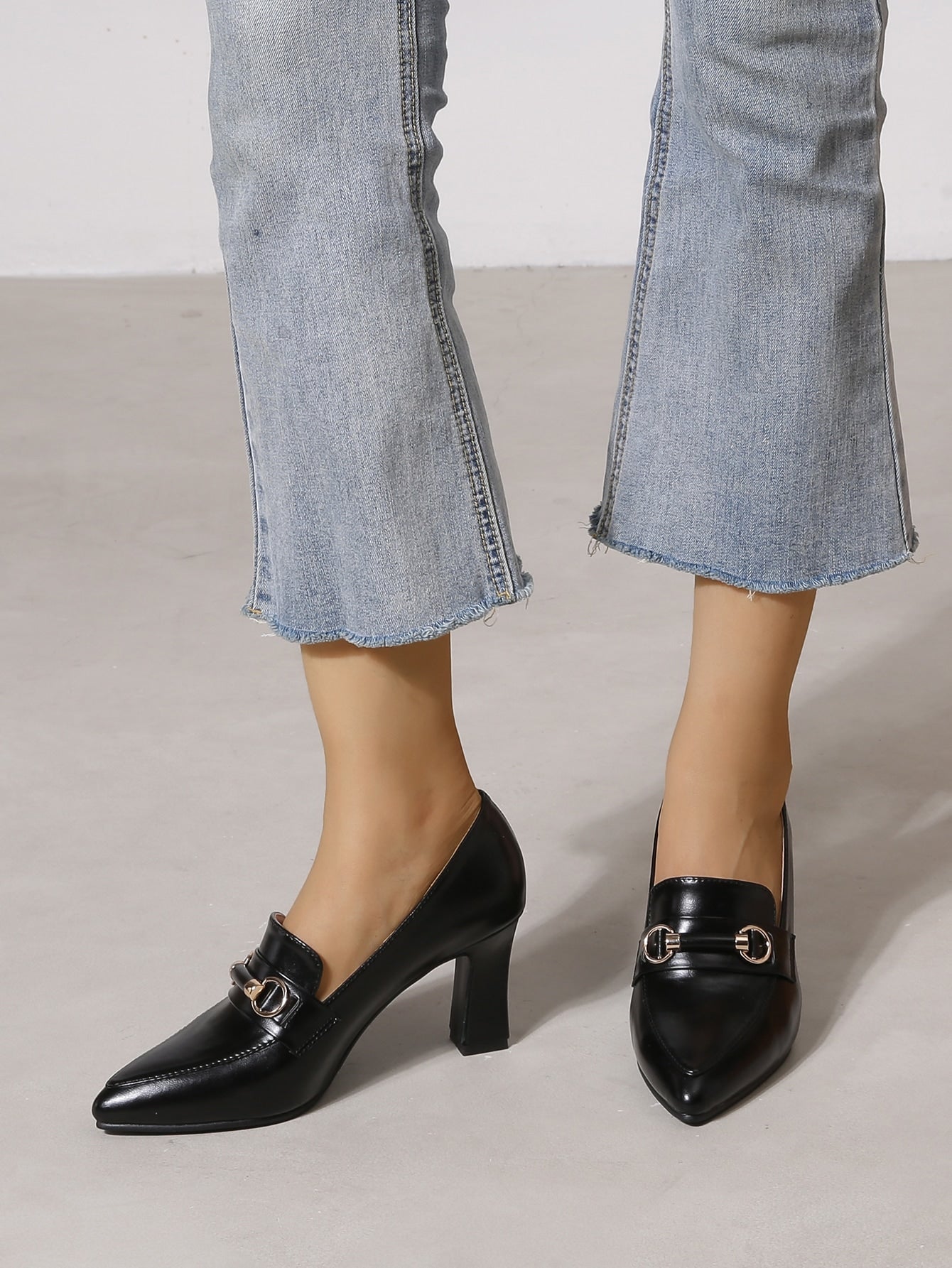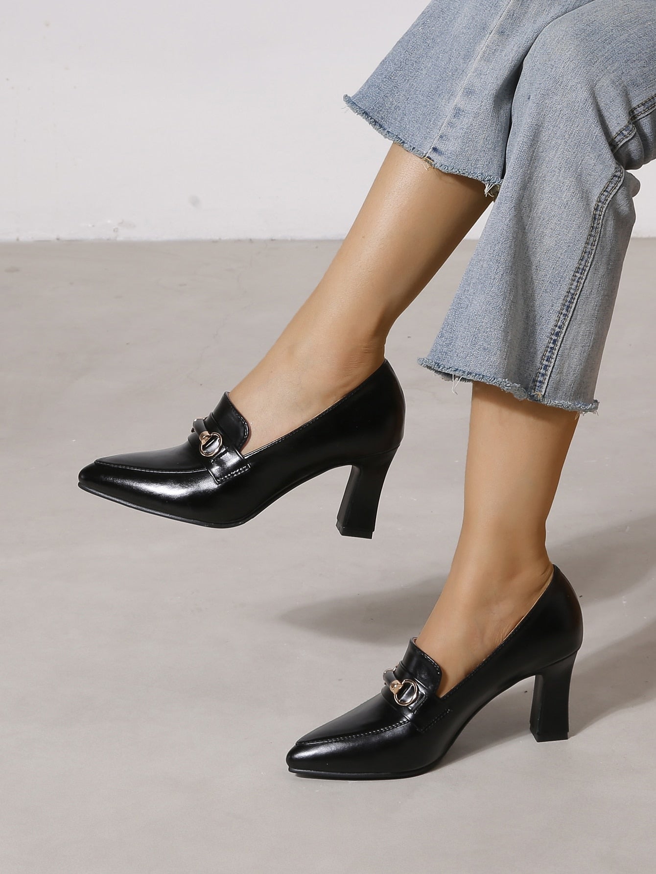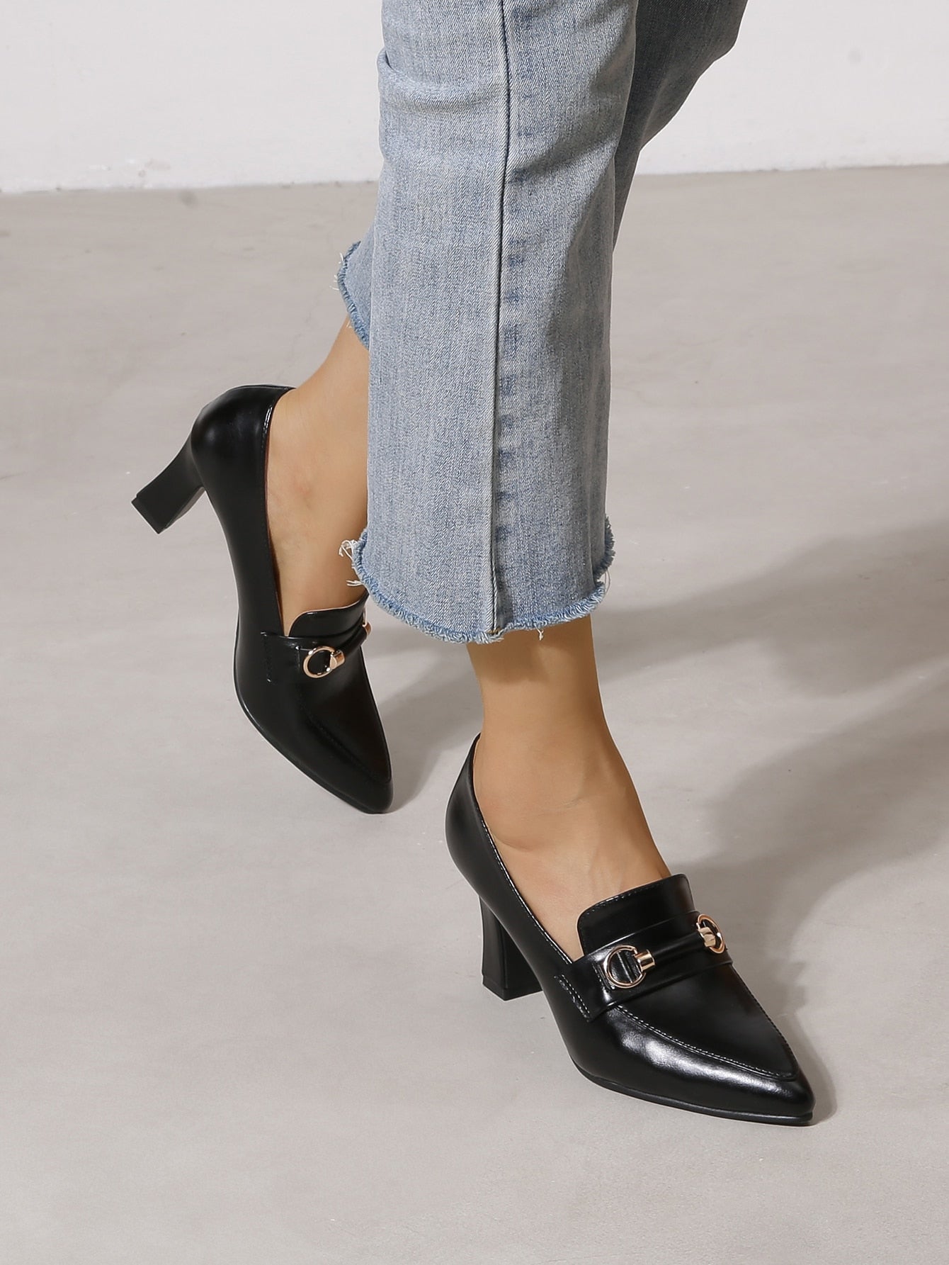 شكيمة زخرفة باصابع قدم مدبب حذاء كعب مكتنز أحذية لوفر , أسود أنيق موحد اللون للنساء كعب عالي احادي حذاء