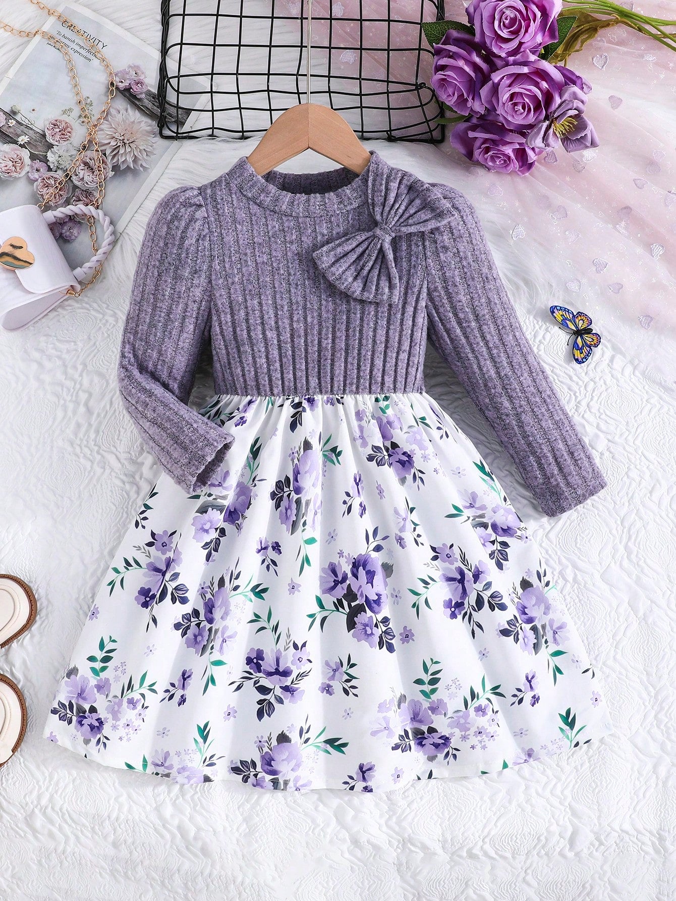 صغيرة الفتاة ملابس علوية قصير بأكمام منفوخة محبوكة زهري وفستان أميرة مطبوع بنقشات نقاط ، باللون الأزرق ، للخريف والشتاء