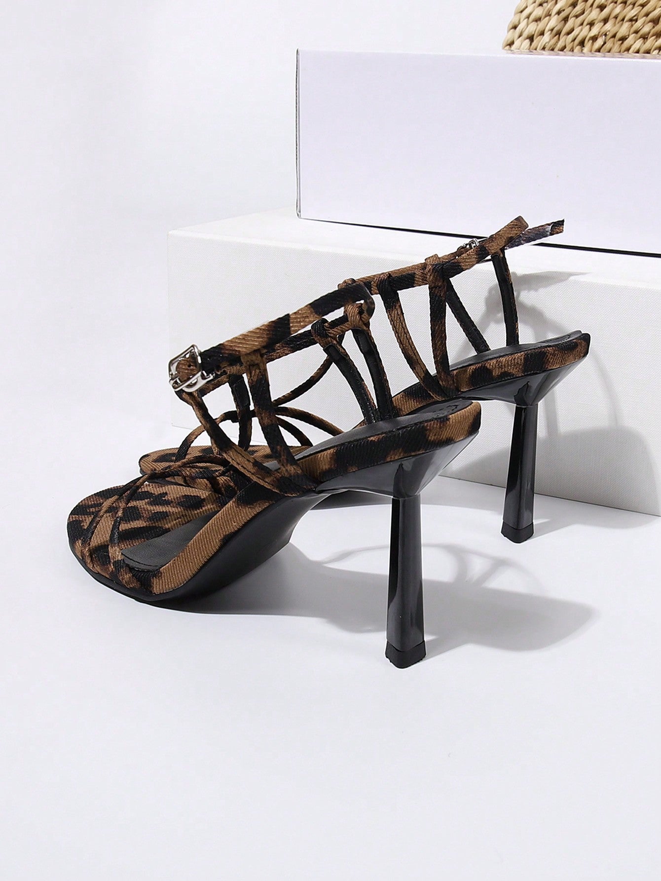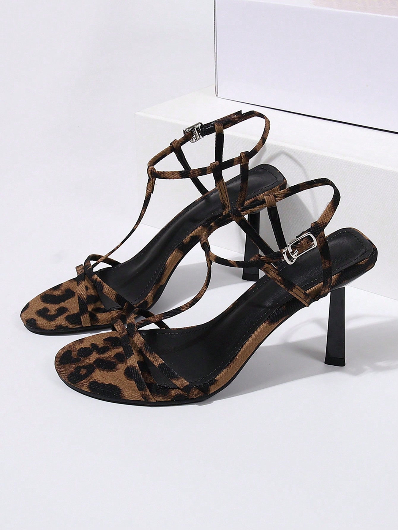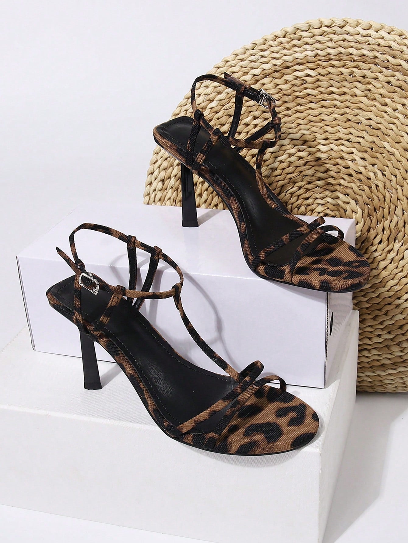 صنادل بكعب عالٍ بطبعة الفهد وإبزيم بشريط للكاحل ومقدمة مدببة، لملابس الكريسماس