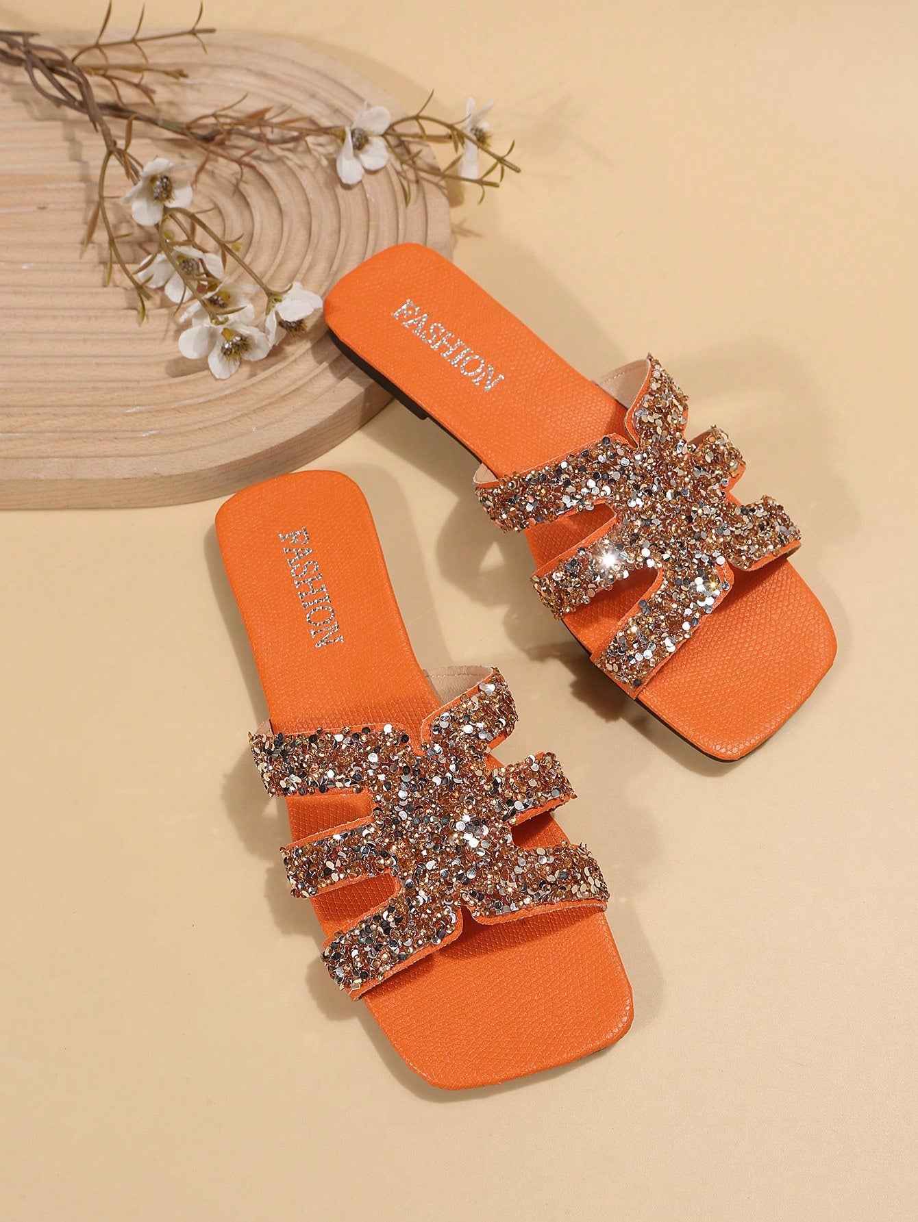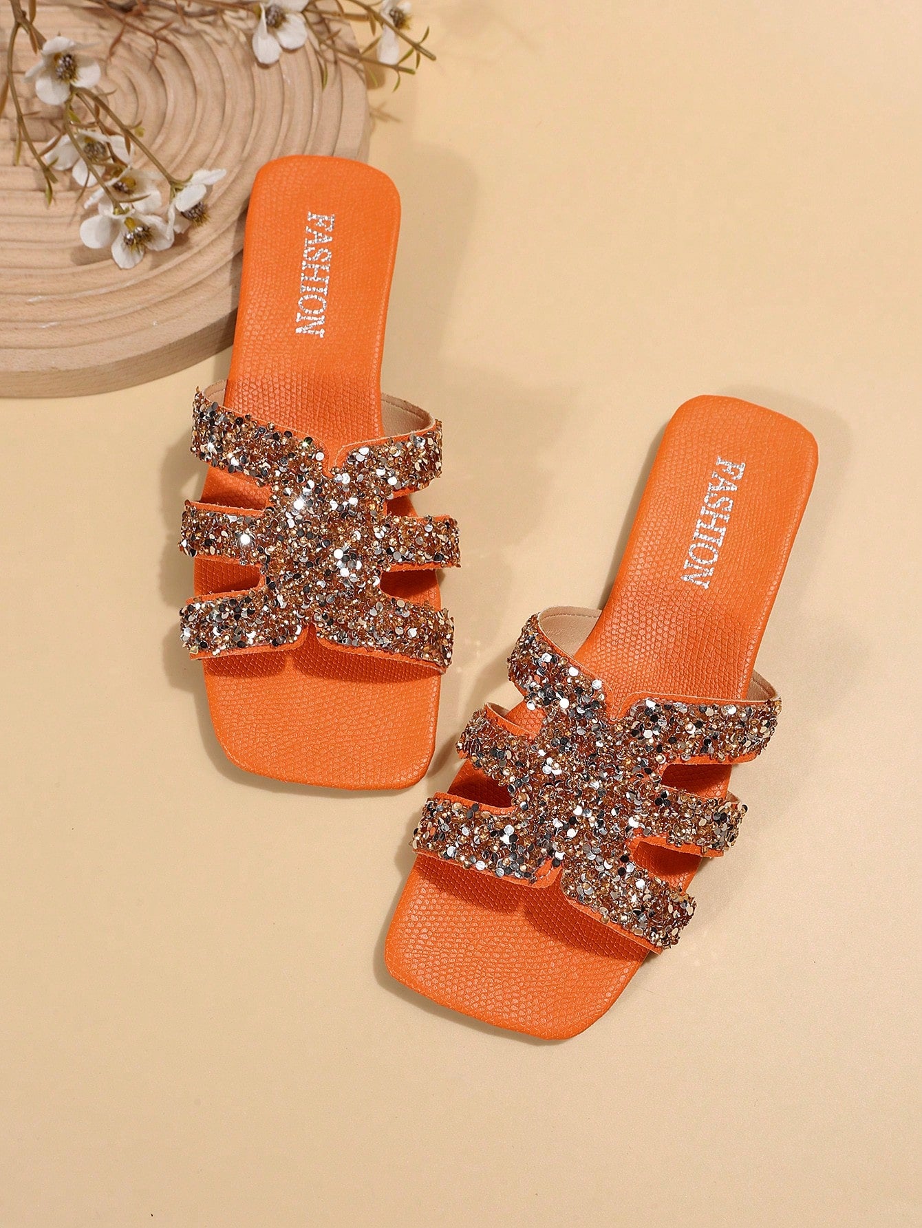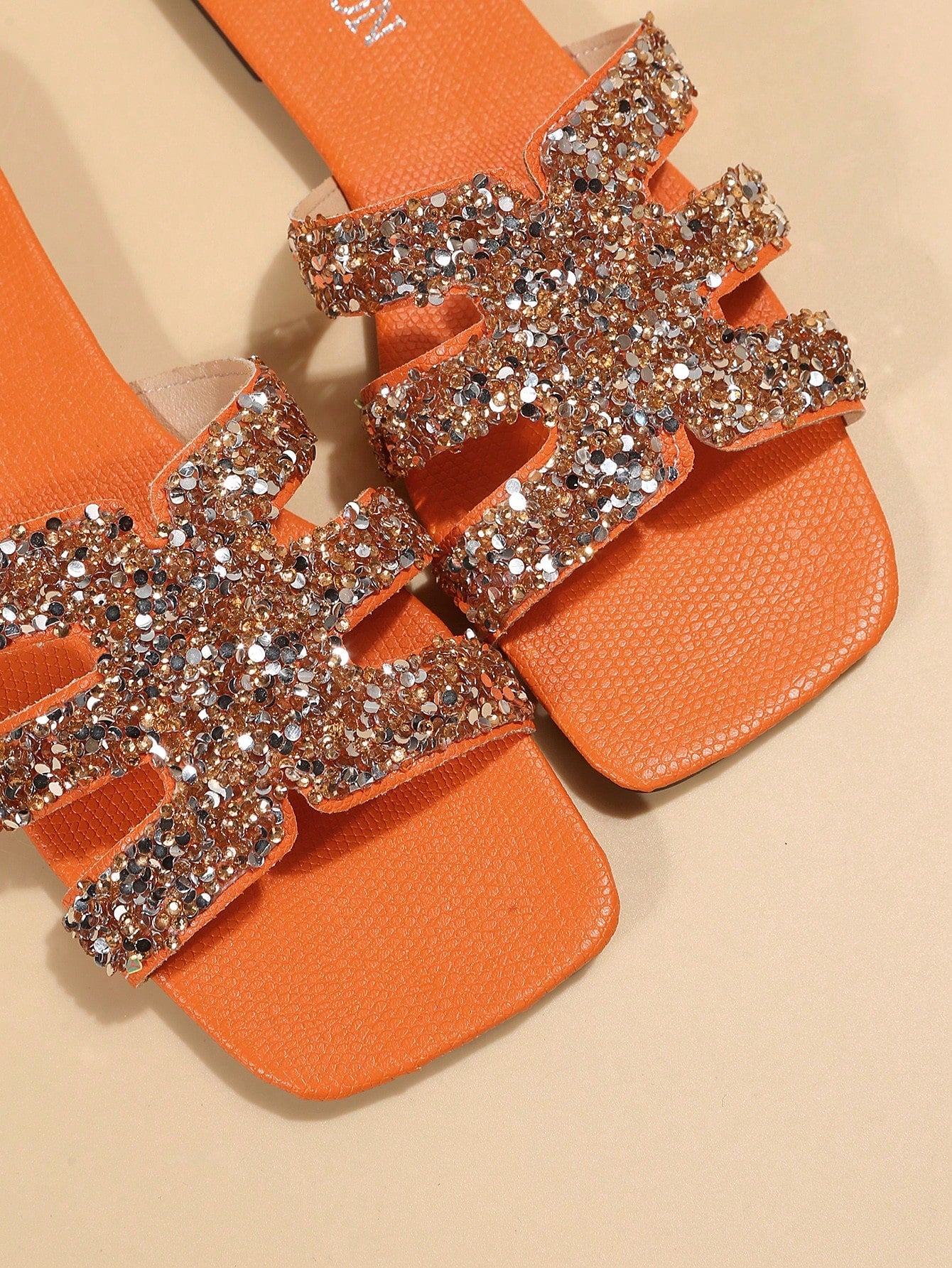 صنادل سلايد بديكور حجر الراين مسطح براقة الصيف نساء