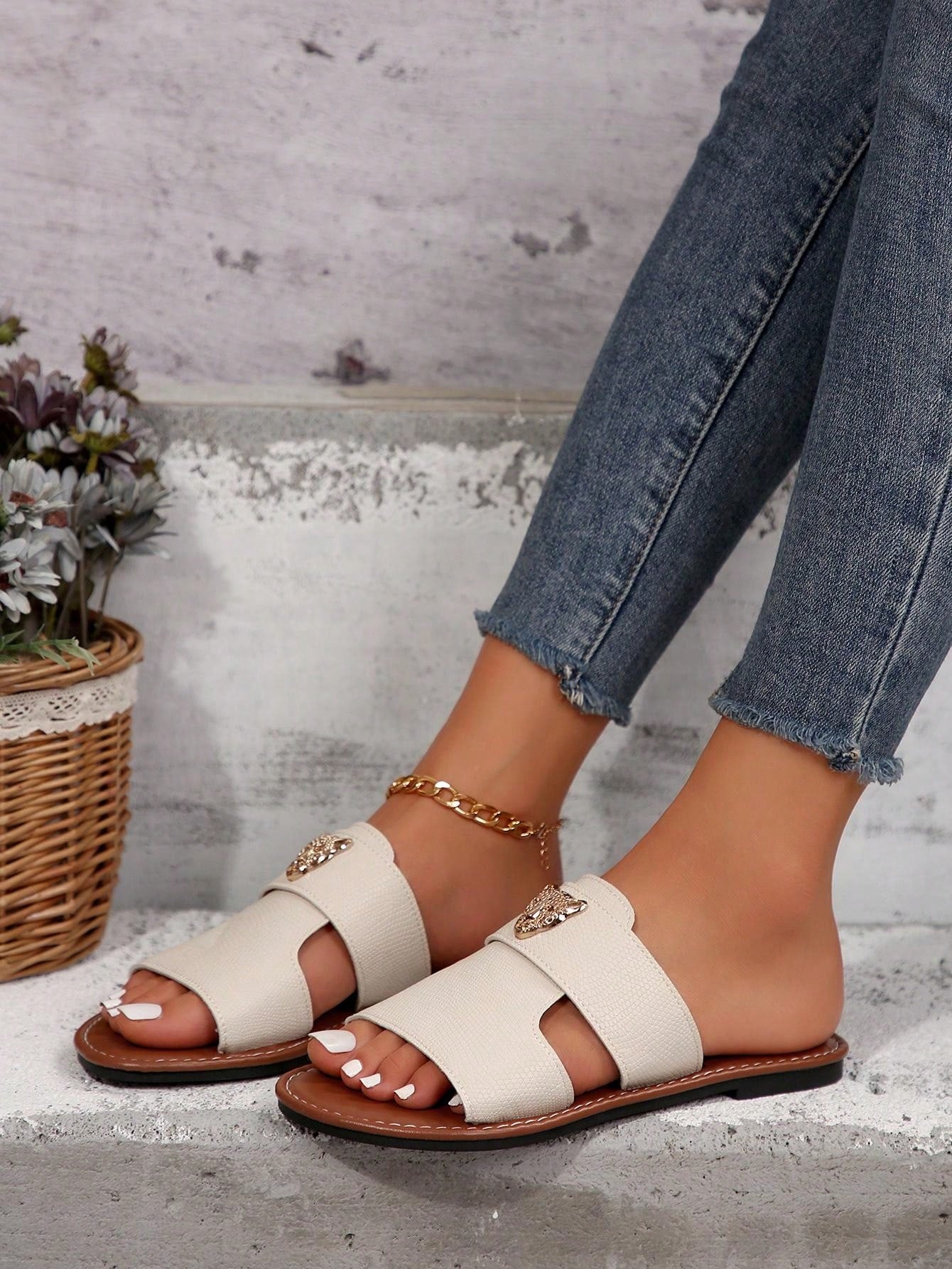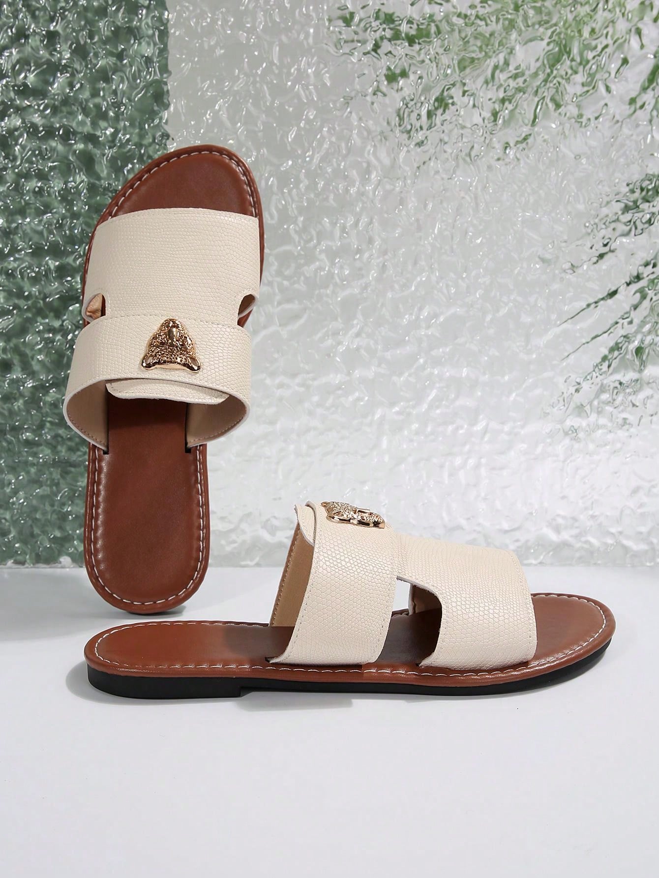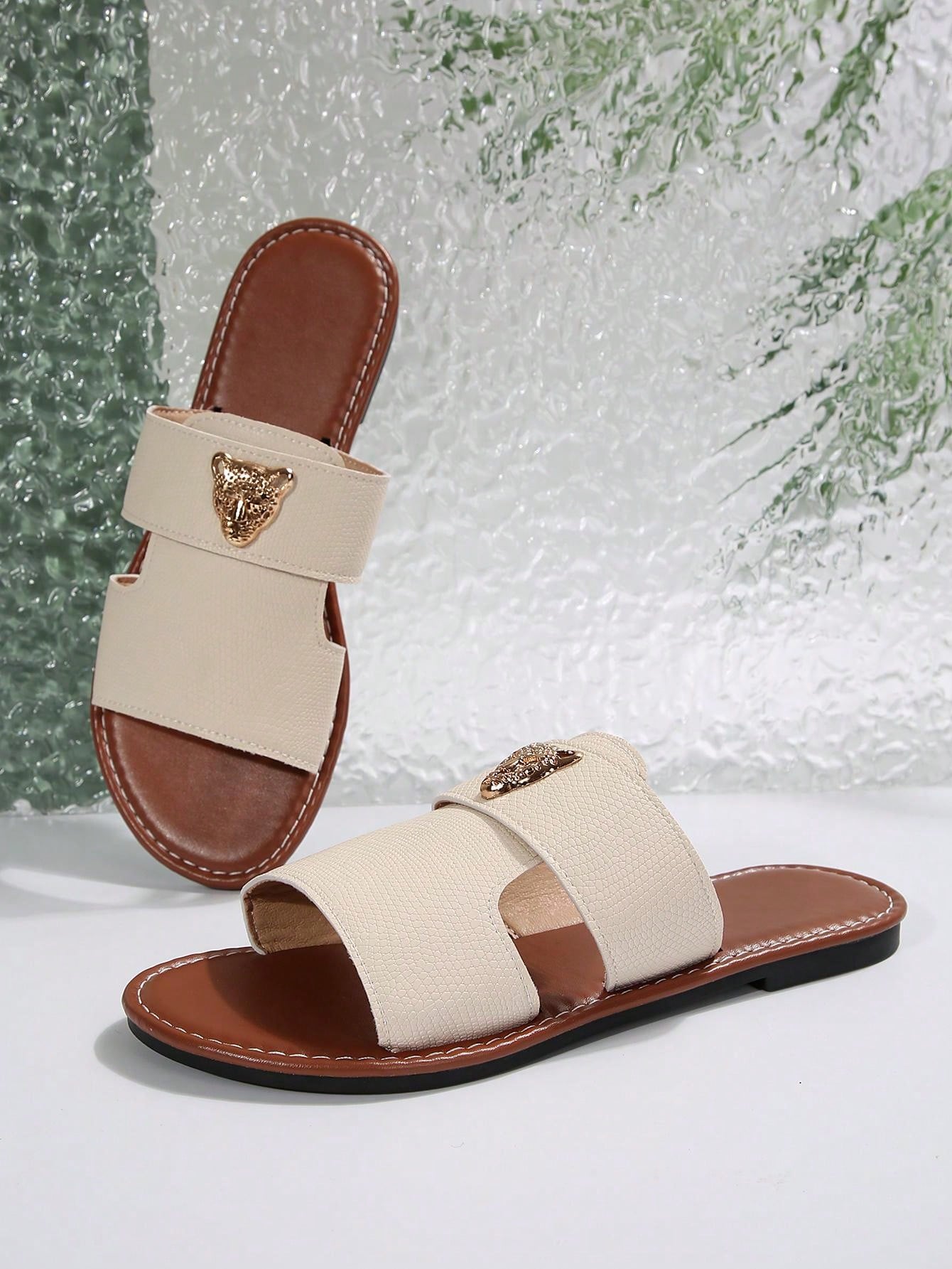 صنادل شرائح مزينة بعنصر معدني بنمط النمر للنساء، صنادل شاطئية مفتوحة الأصبع أنيقة مسطحة للصيف