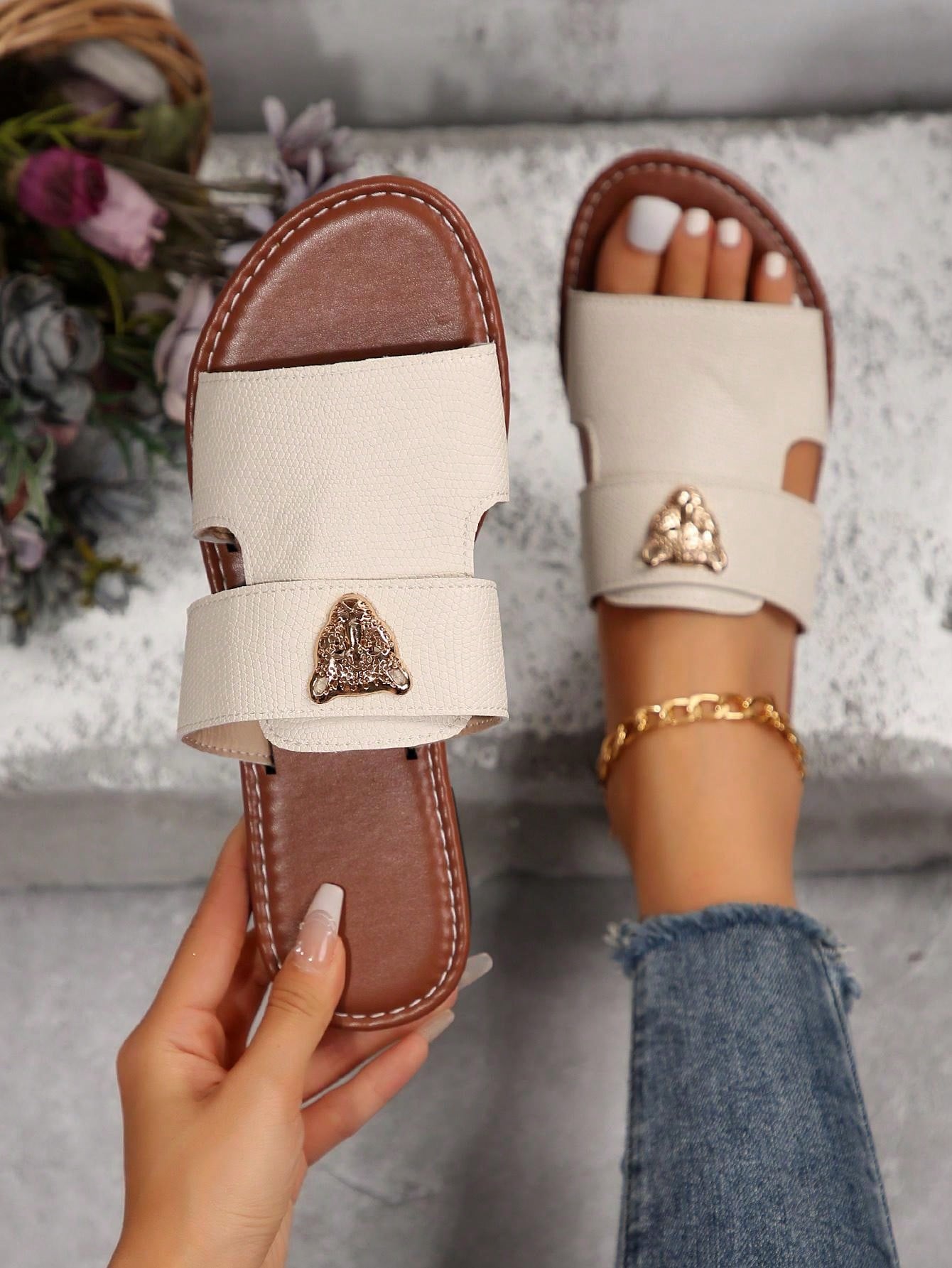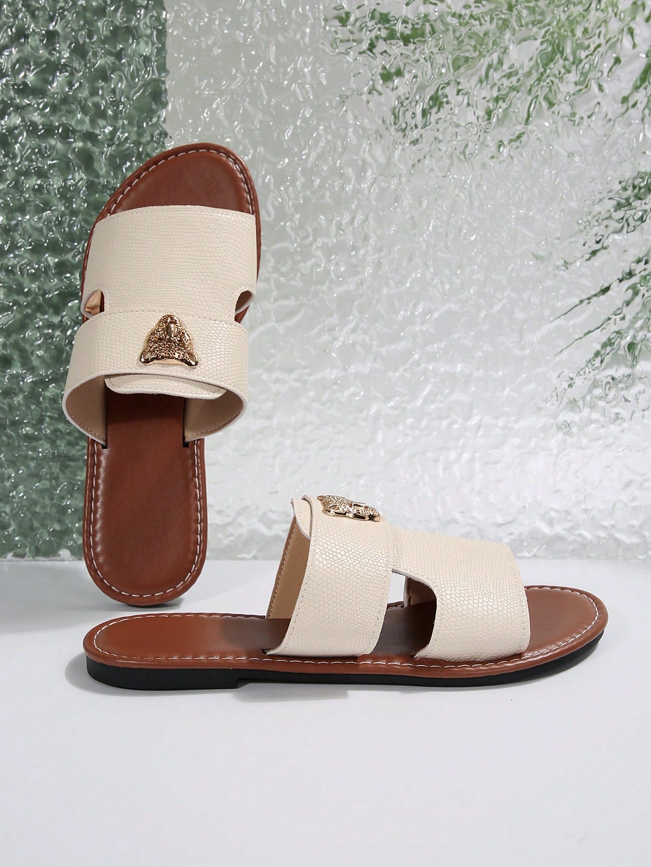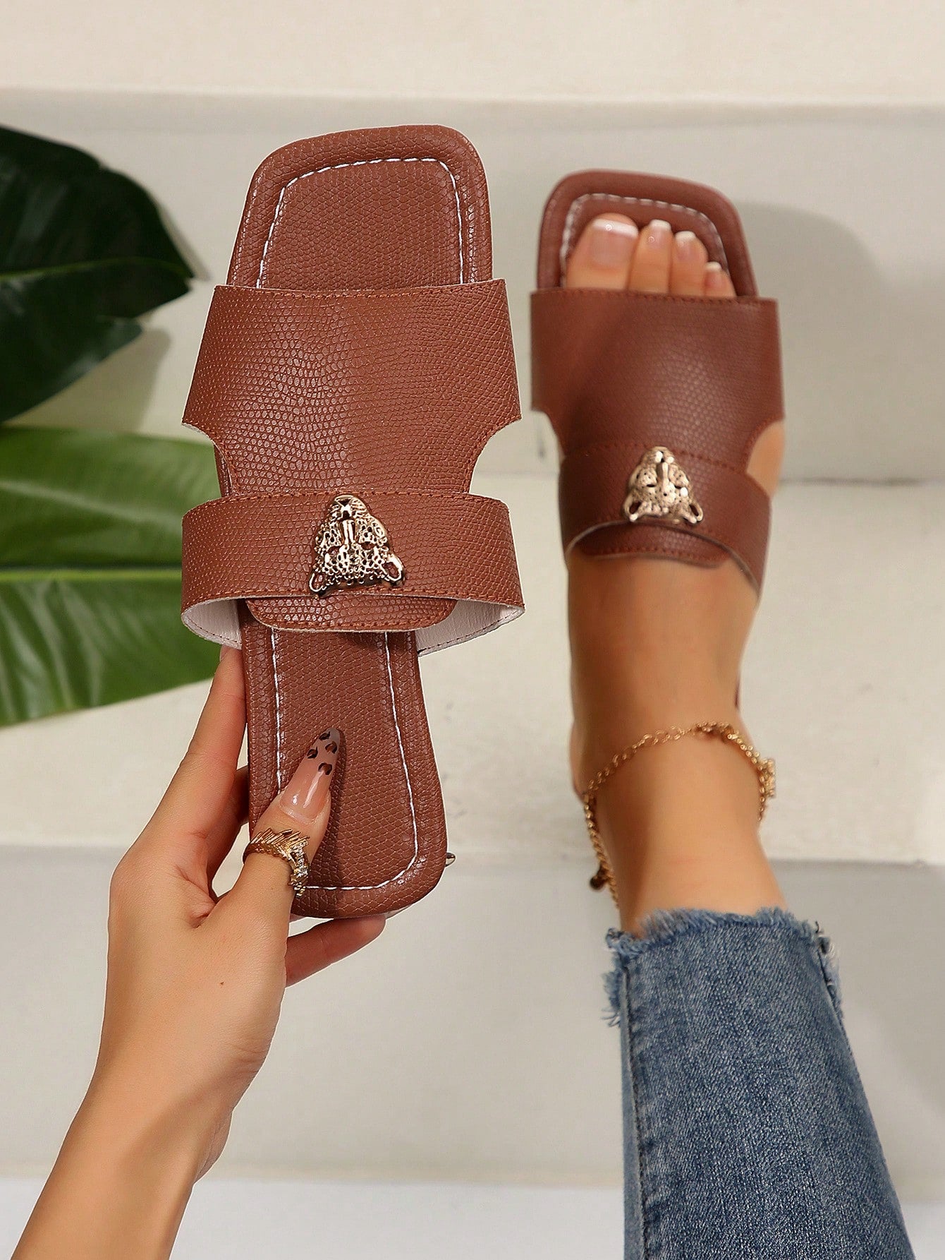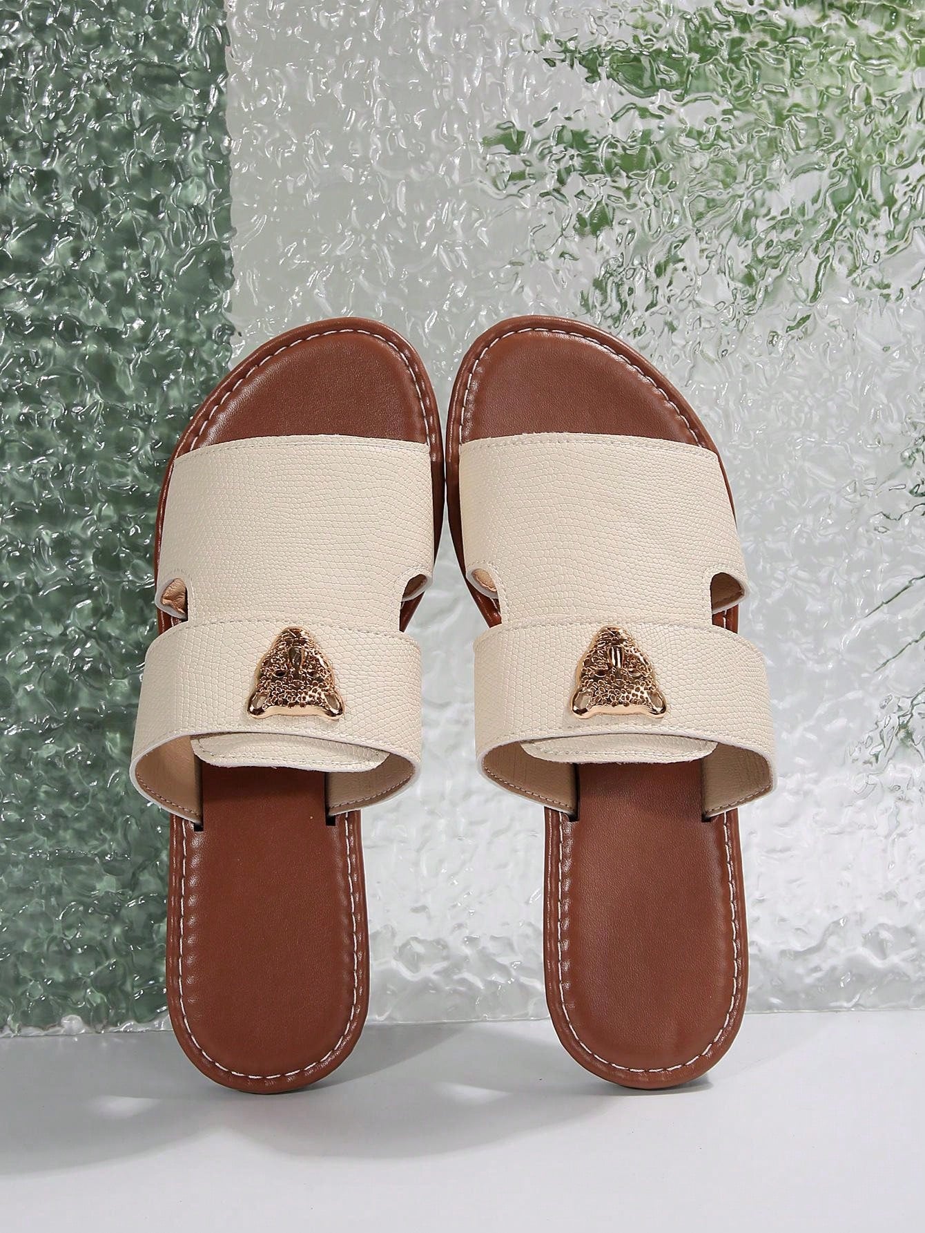 صنادل شرائح مزينة بعنصر معدني بنمط النمر للنساء، صنادل شاطئية مفتوحة الأصبع أنيقة مسطحة للصيف