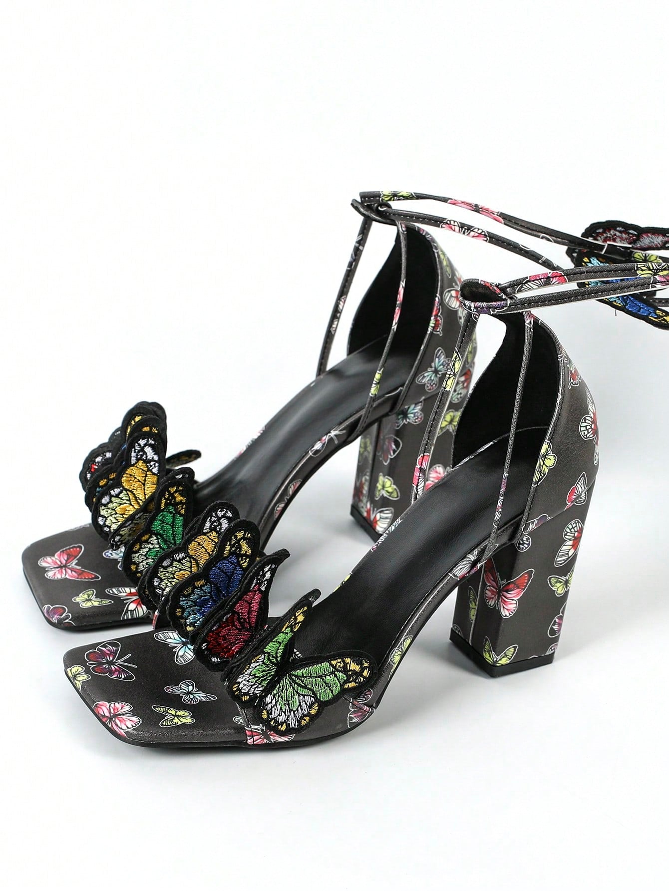 صنادل للنساء بطباعة الفراشة كعب عالي موضة مع رجل ربطة عنق تصميم و سميك رباط