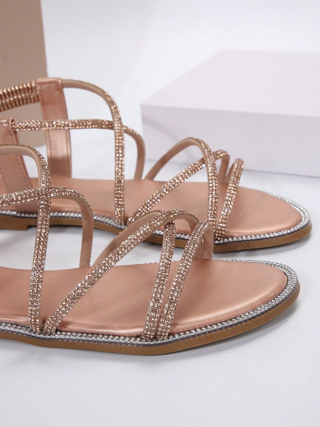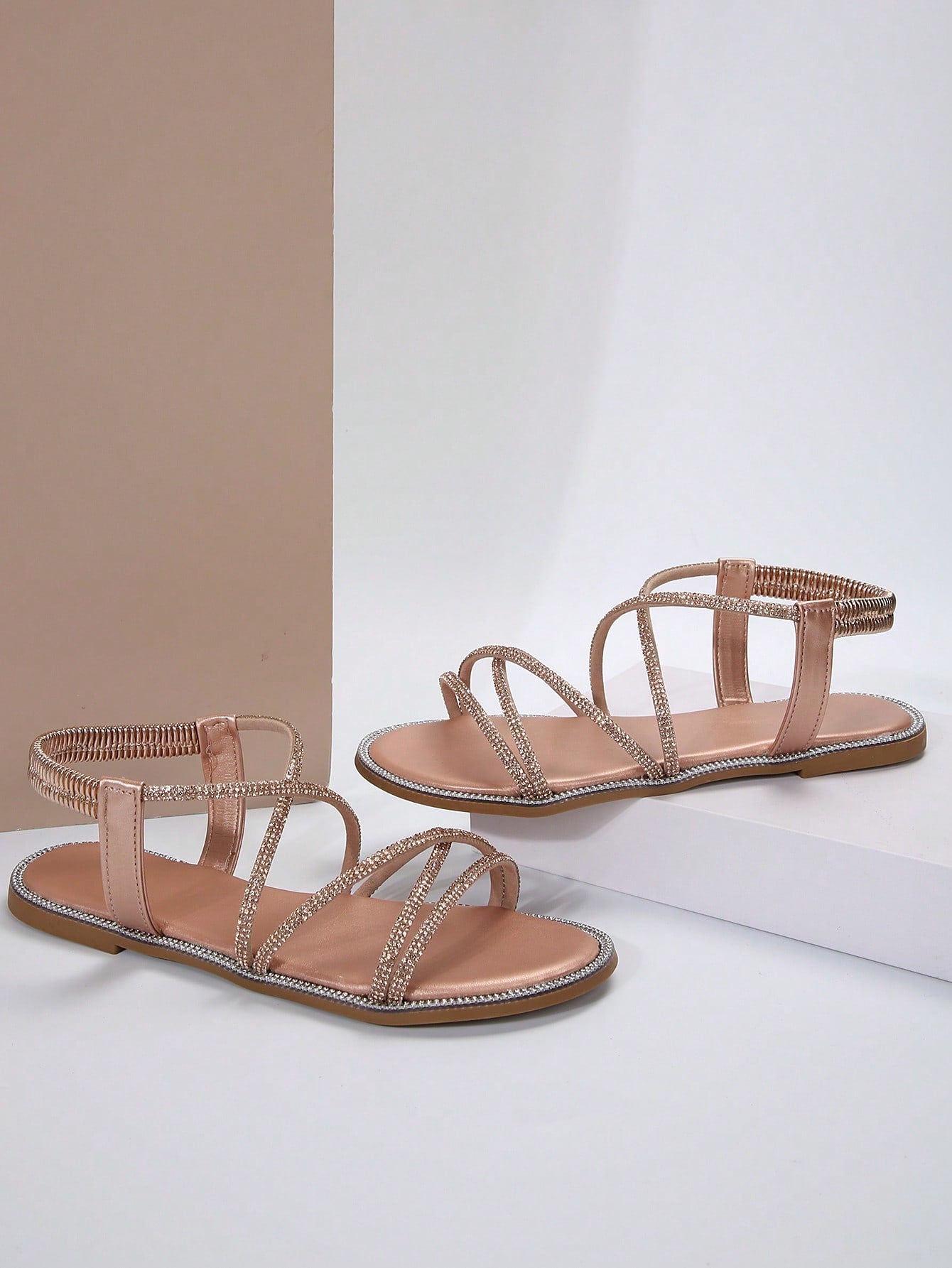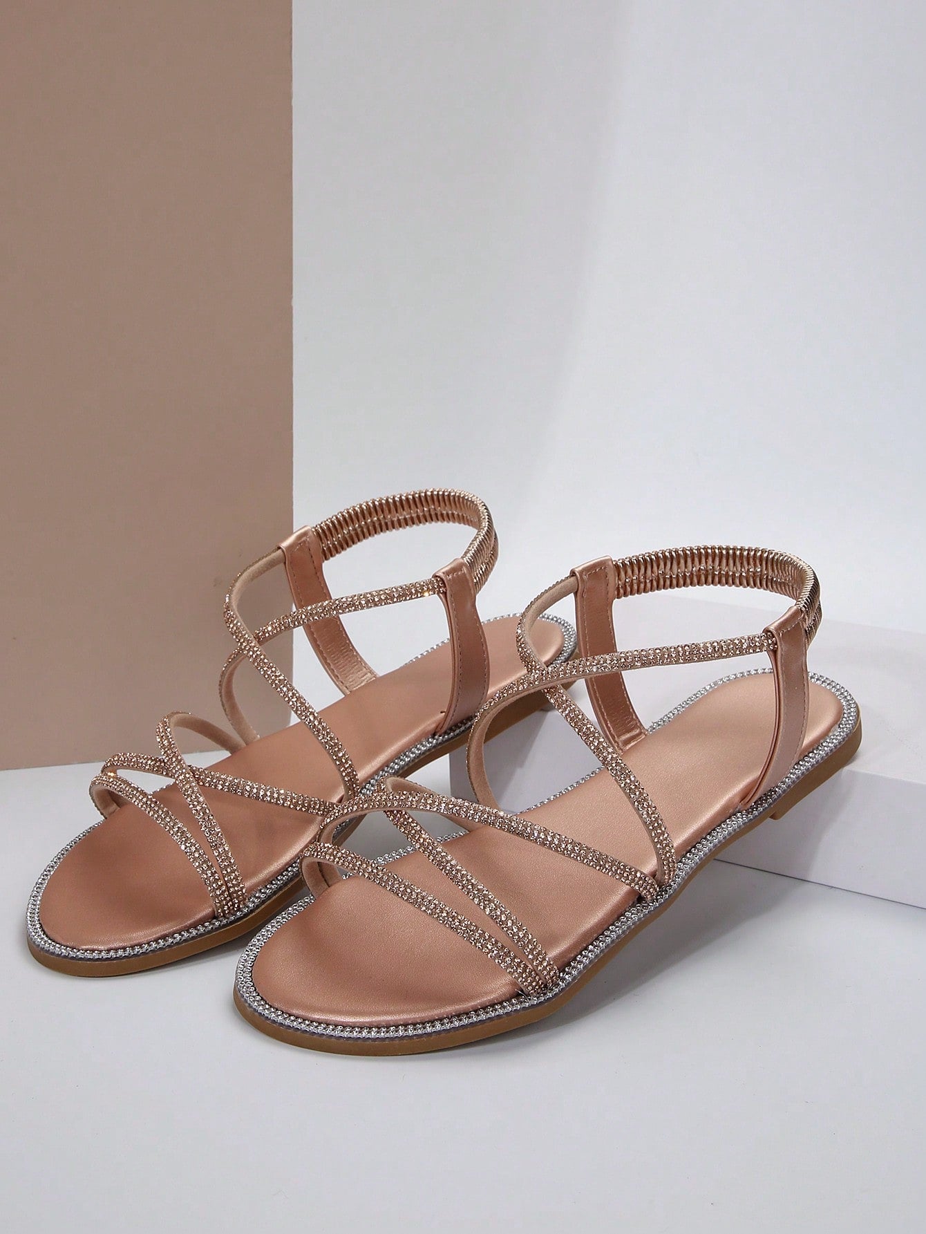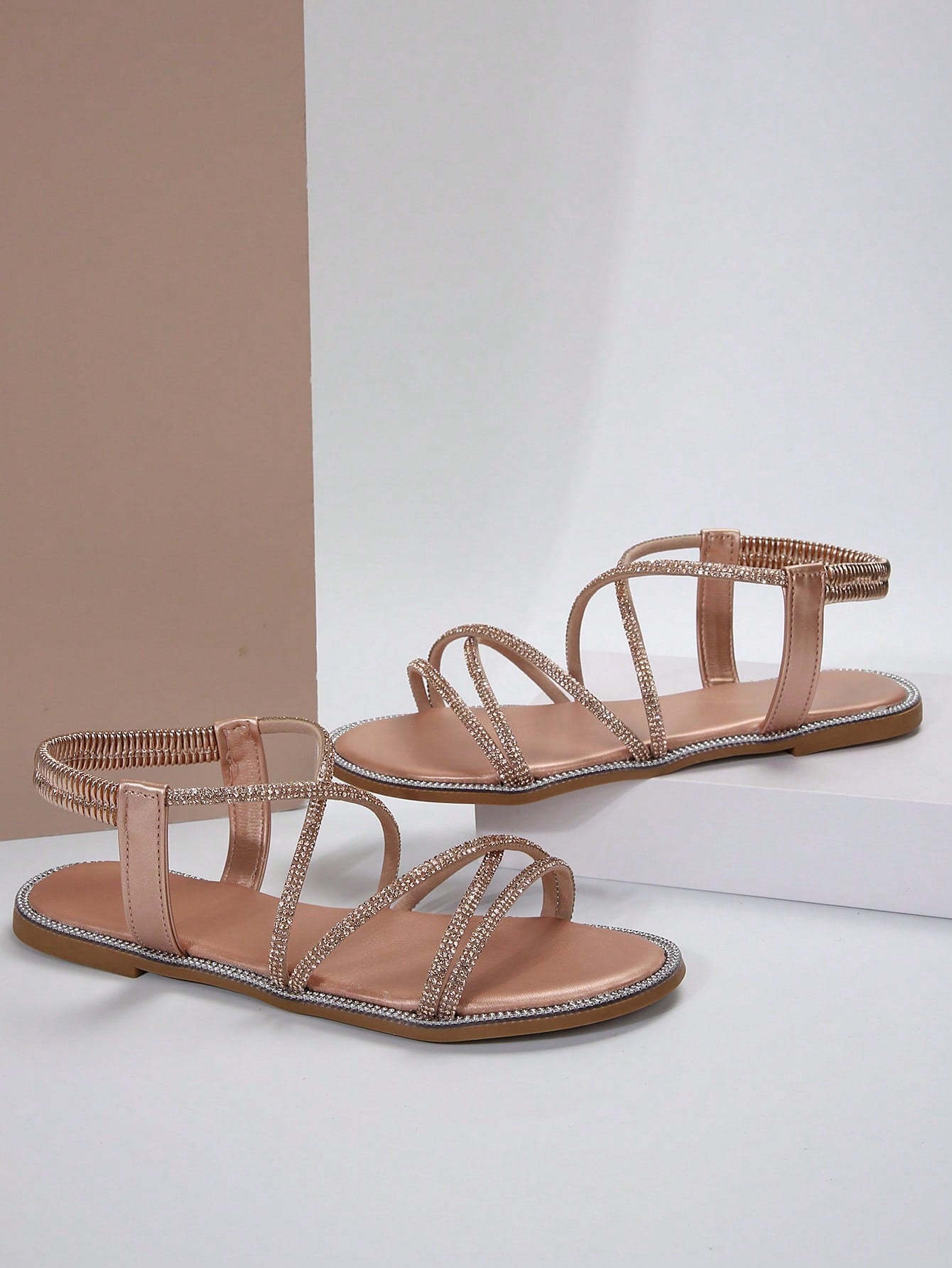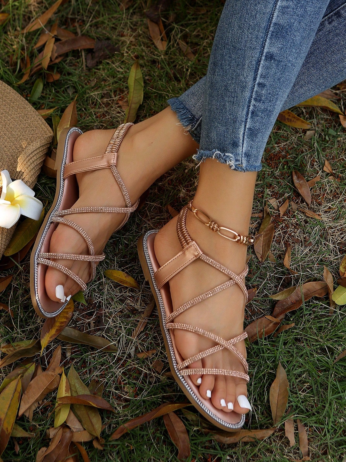 صنادل مسطحة برأس مدور وتفاصيل معدنية ومرصعة بالراين، حزام كاحل مطاطي، استيل روماني للنساء