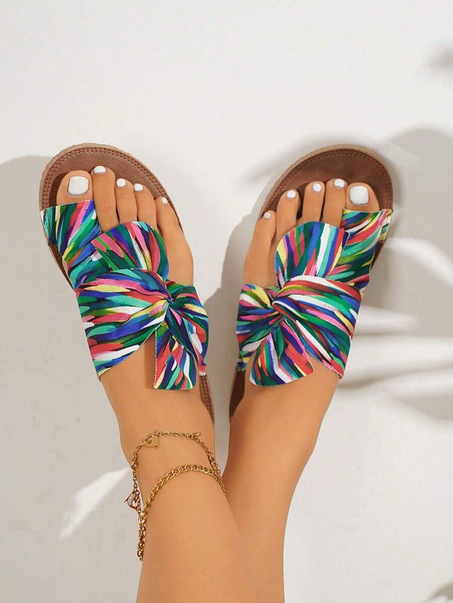 صنادل مسطحة للنساء مزينة بشريط ملون على شكل فراشة