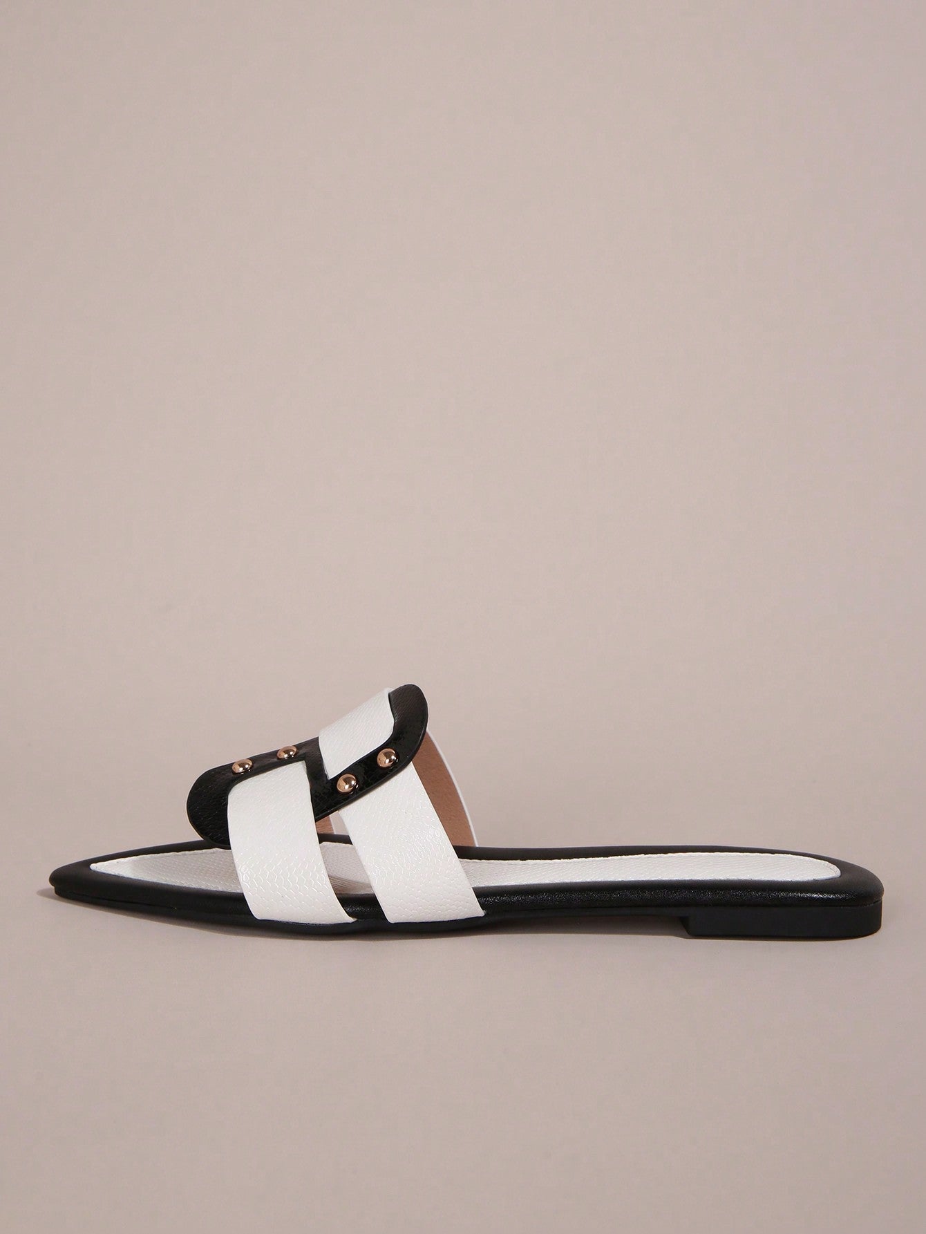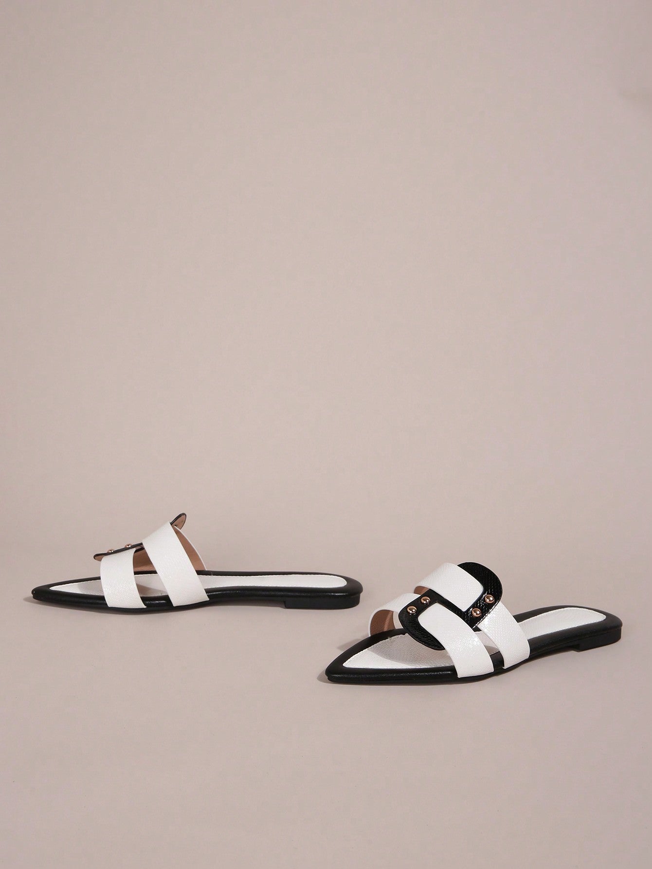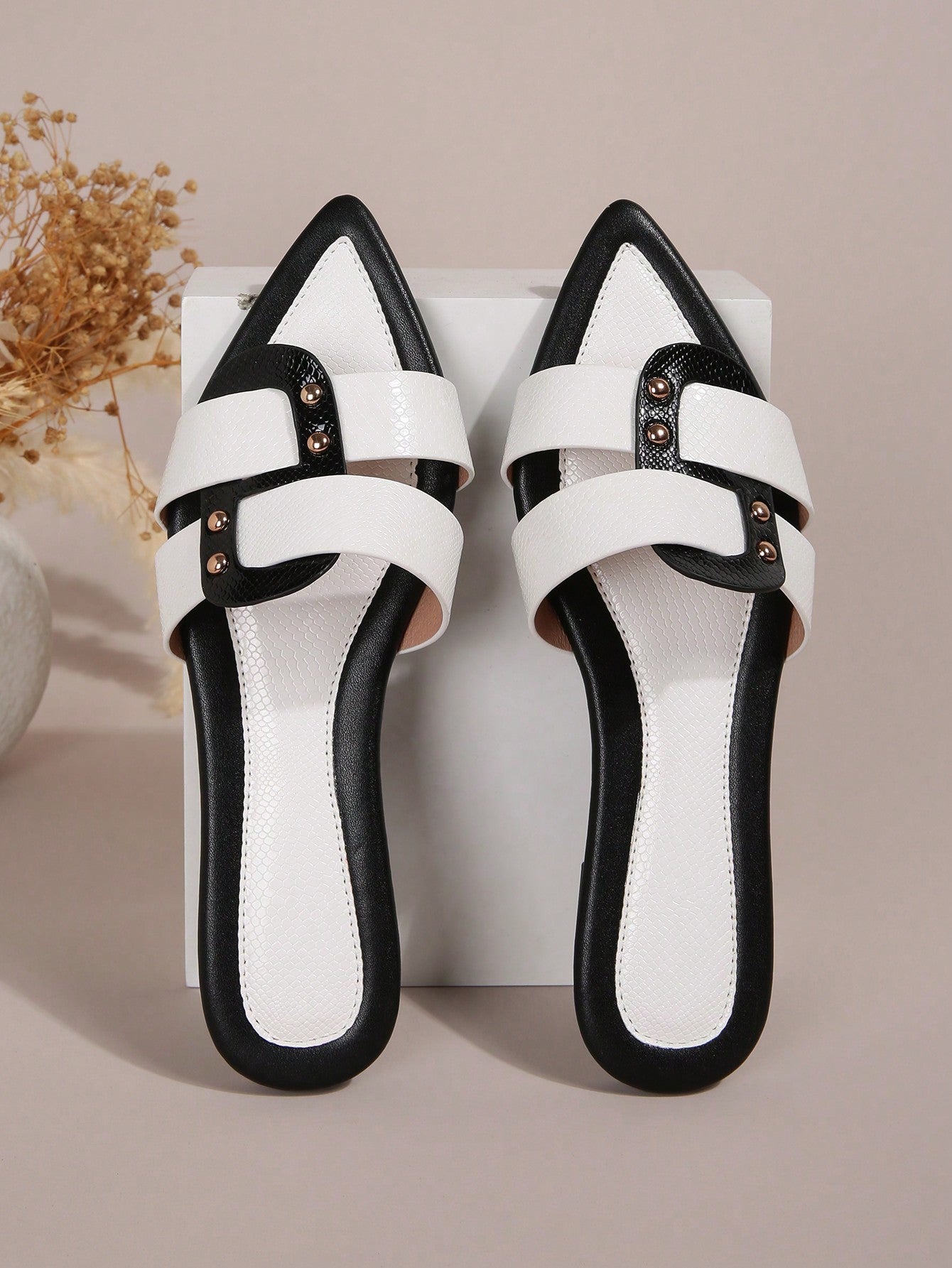 صنادل نسائية مسطحة جديدة بألوان أسود وأبيض مع إصبع مدبب، شباشب خارجية أنيقة