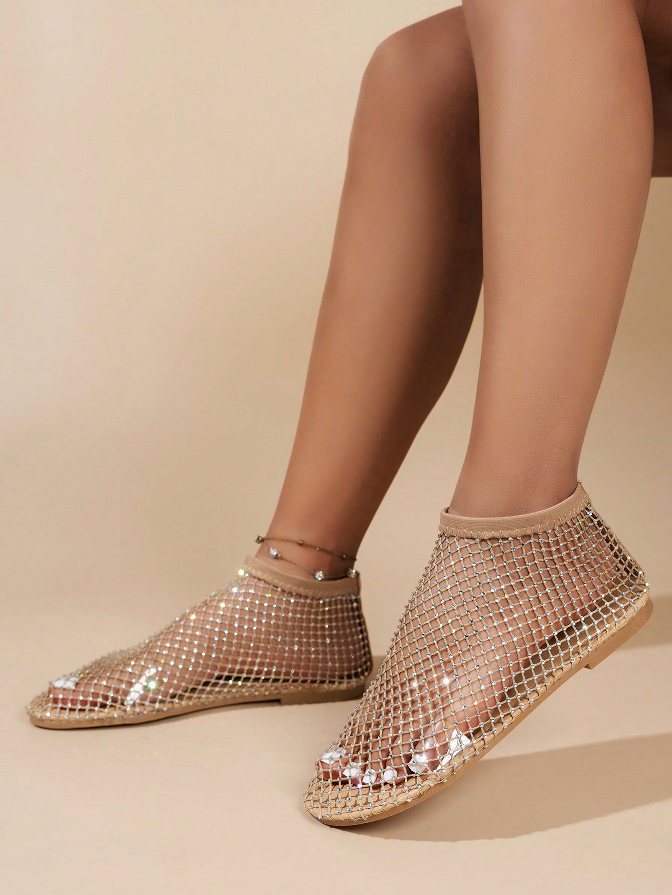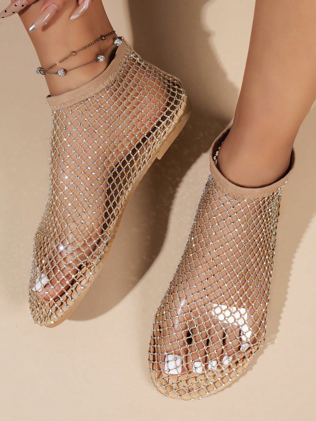 صنادل نسائية مسطحة من الشبكة اللامعة المزينة بالراين،ذهبية لقضاء عطلة الصيف