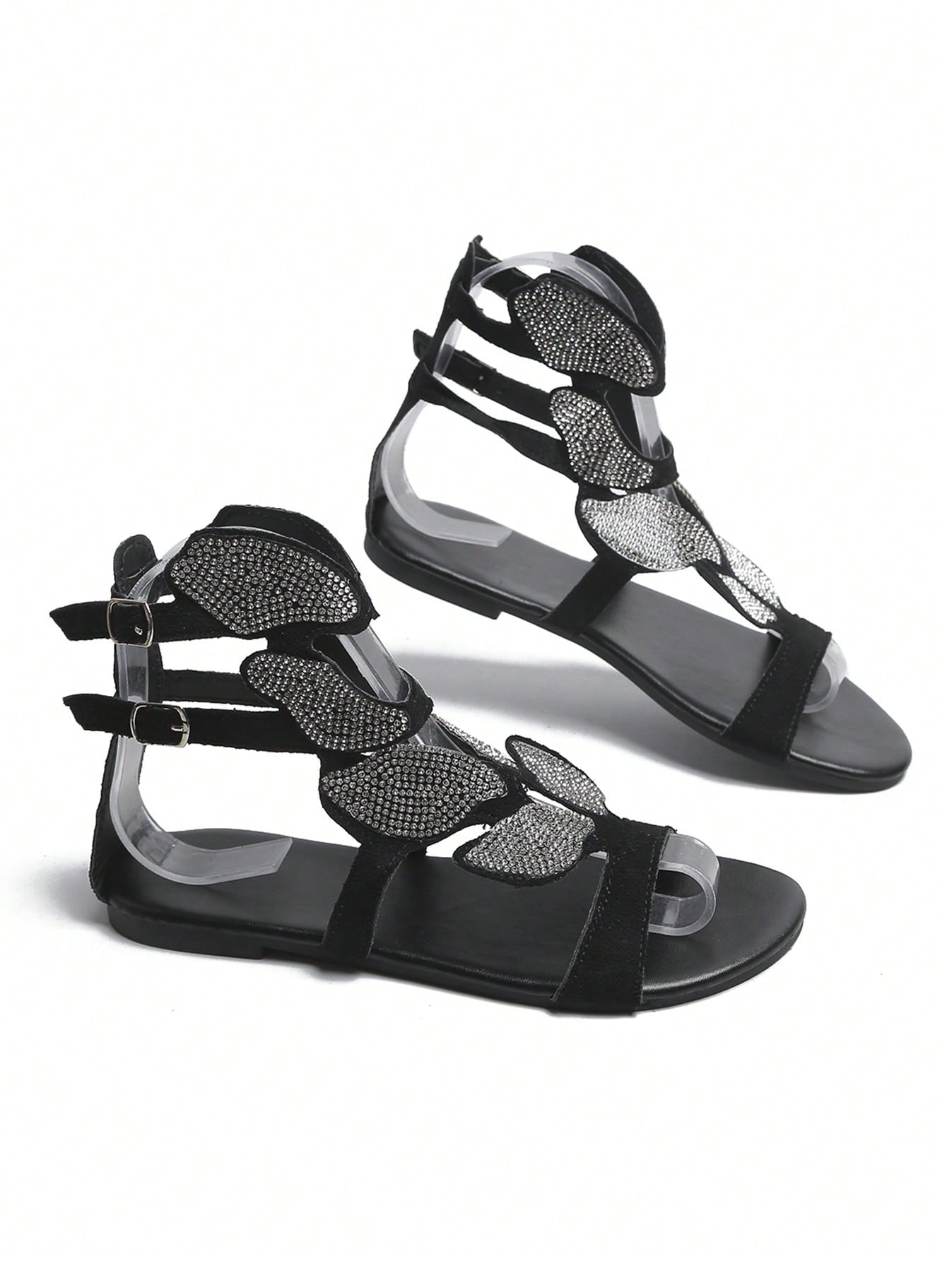 صنادل نسائي مصارع بحزام الكاحل مزخرف بأحجار الراين ، صنادل مسطح من جلد الغزال الصناعي الأسود الفاتح